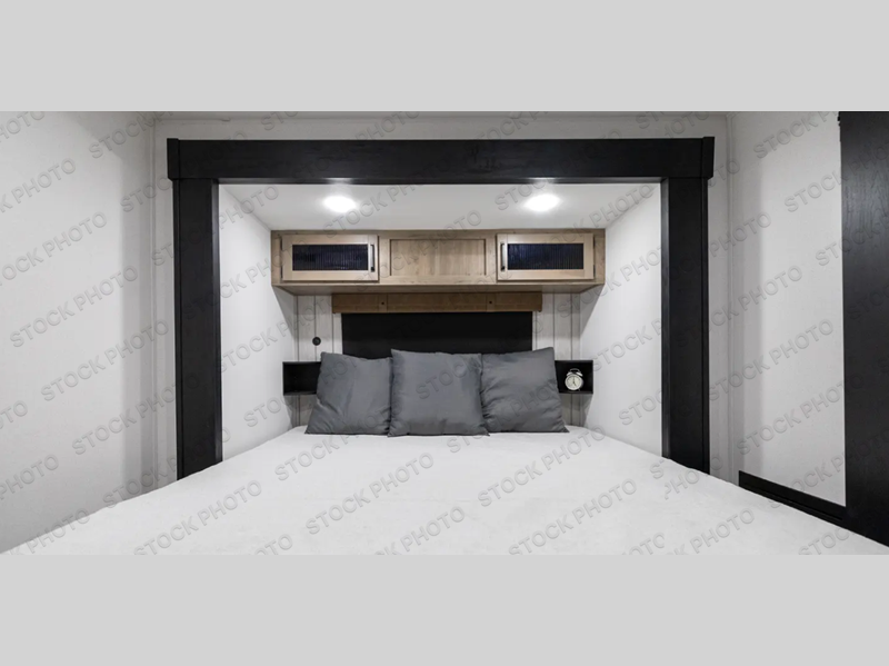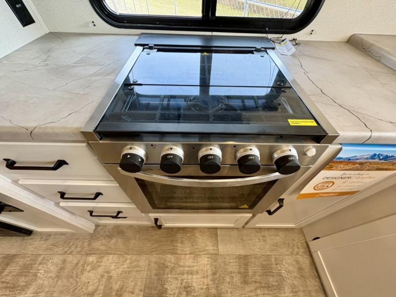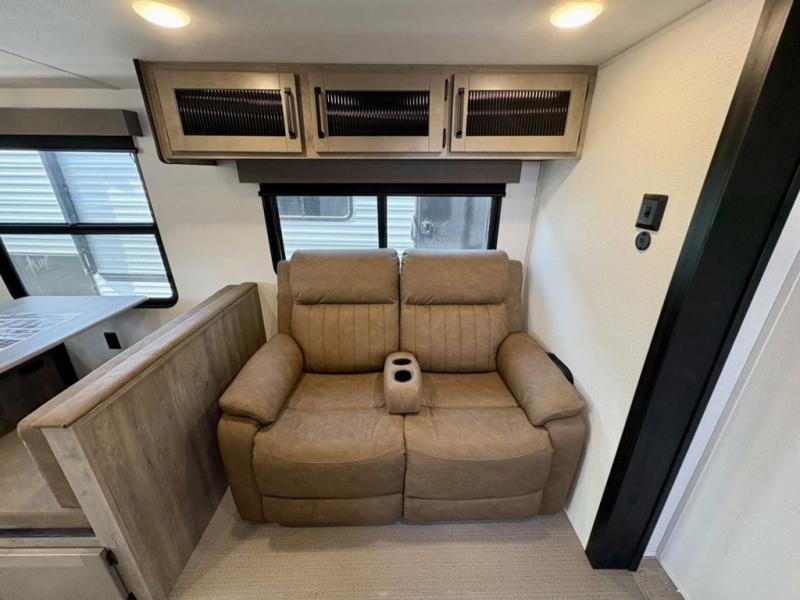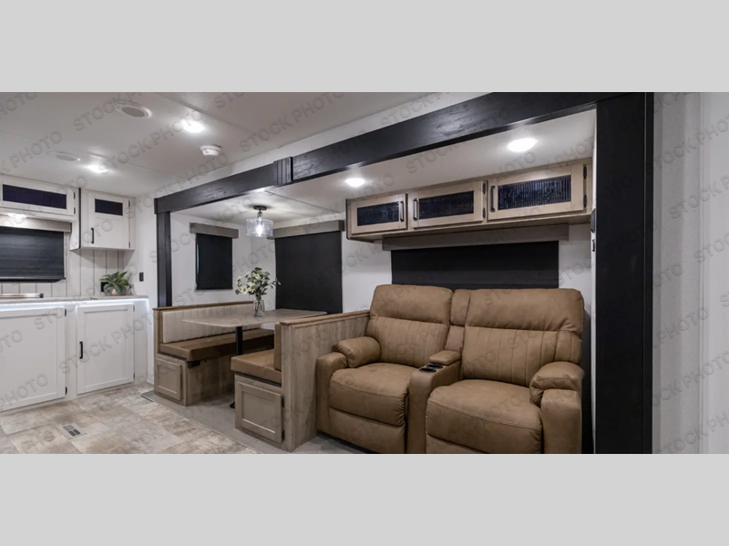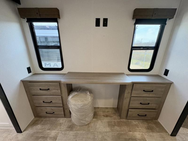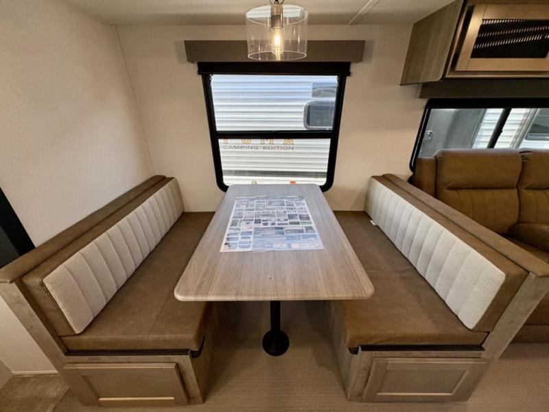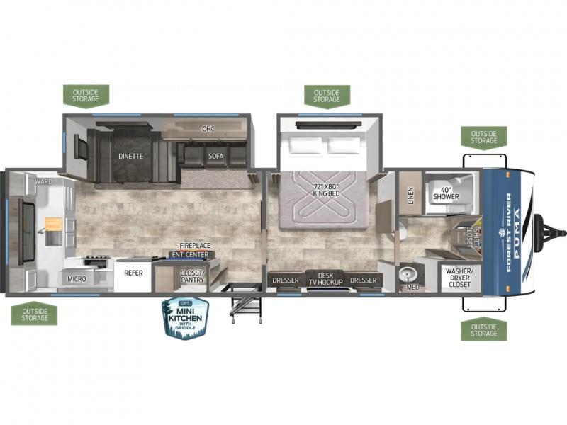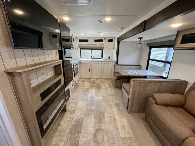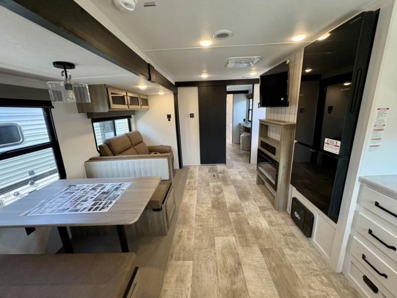 You'll love camping in this double slide out travel trailer with a rear kitchen and a spacious front bath! There is a 40" shower here, along with a linen closet, shirt closet, plus a closet with washer/dryer prep. The master bedroom includes a king bed slide out, dual bedroom dressers, a desk and a TV hookup if you want the option to watch movies in bed. The combined kitchen and living area is made open by the large slide out, which houses the sofa and booth dinette. These pieces of furniture area conveniently across from the entertainment center and fireplace to make it feel more like home. The chef of your group will appreciate generous counter space in the rear kitchen, and if they like to cook outdoors, and optional mini kitchen with a griddle can be added!