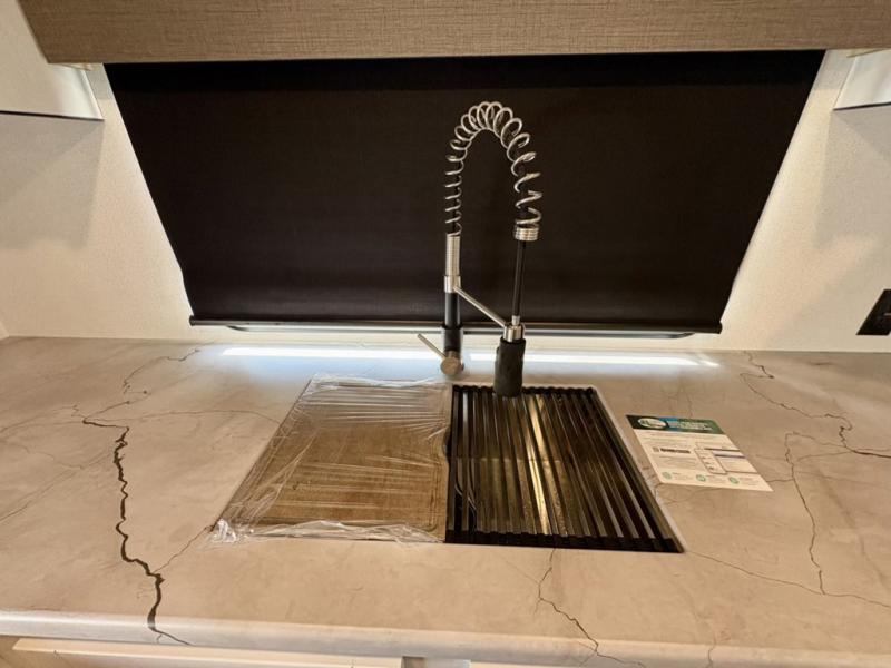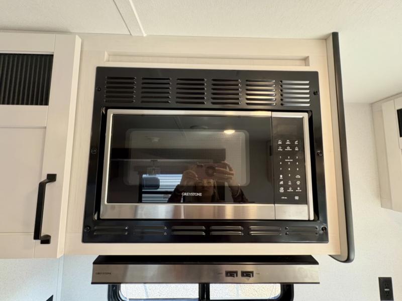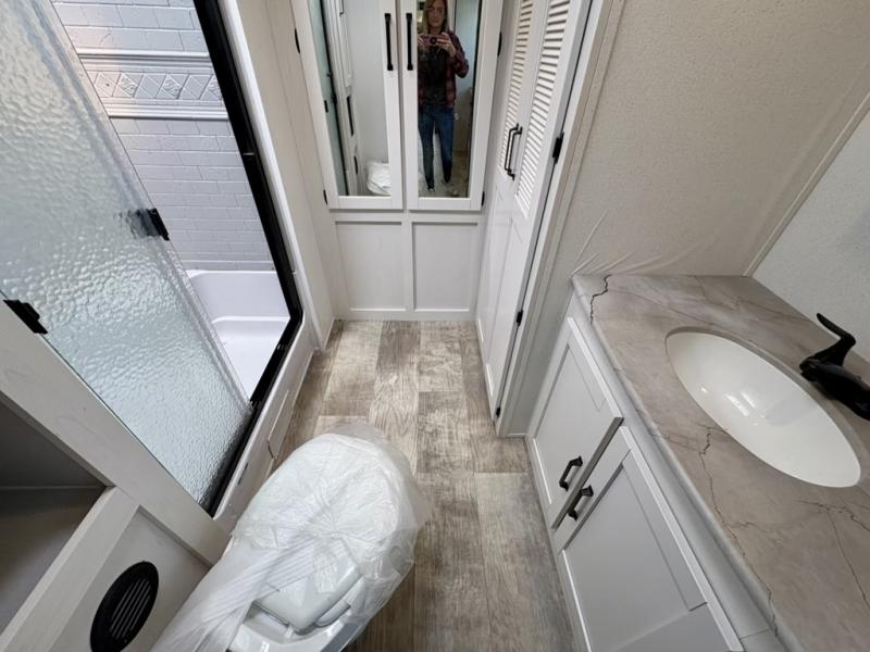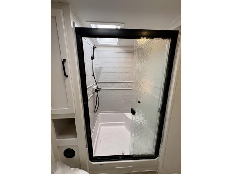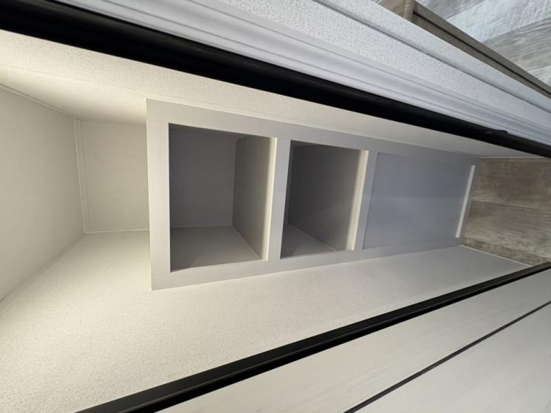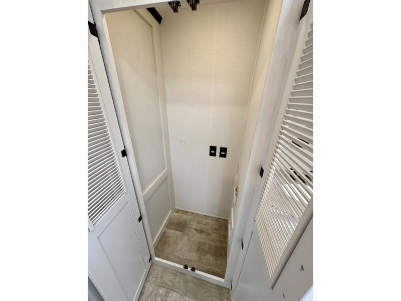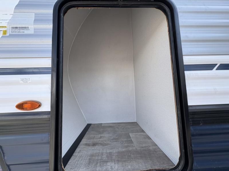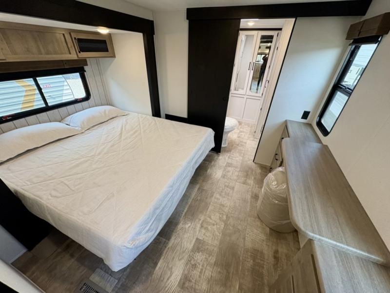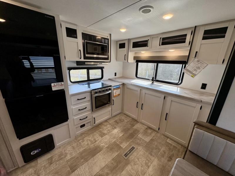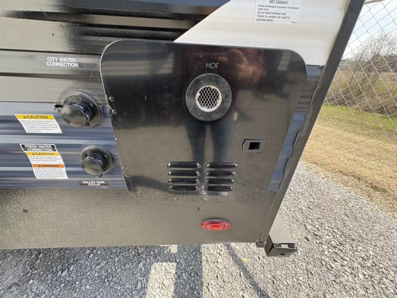You'll love camping in this double slide out travel trailer with a rear kitchen and a spacious front bath! There is a 40" shower here, along with a linen closet, shirt closet, plus a closet with washer/dryer prep. The master bedroom includes a king bed slide out, dual bedroom dressers, a desk and a TV hookup if you want the option to watch movies in bed. The combined kitchen and living area is made open by the large slide out, which houses the sofa and booth dinette. These pieces of furniture area conveniently across from the entertainment center and fireplace to make it feel more like home. The chef of your group will appreciate generous counter space in the rear kitchen, and if they like to cook outdoors, and optional mini kitchen with a griddle can be added!