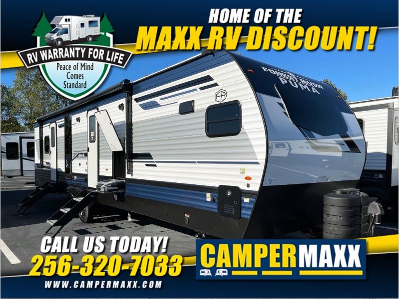 If you're looking for family-fun adventure then you need one of these Palomino Puma fifth wheels or travel trailers! They are built rugged, easy to tow, and jam packed with features. The Darco wrapped underbelly will protect your units vitals through every season and the AlphaPly roofing membrane covers it. They also have super lube axles and a powder coated frame. Their luxurious interiors feature a spice rack and built-in knife rack in the kitchen, USB charging ports to keep your electronics at 100%, and high density foam mattresses for a good night's rest. The required Advantage package comes with night roller shades for privacy at night, two outside speakers to crank up the tunes while you play cornhole, and an outside shower to keep the dirt outside where it belongs, plus so much more!