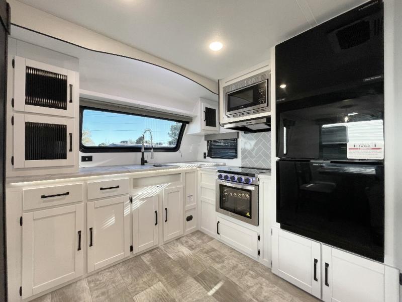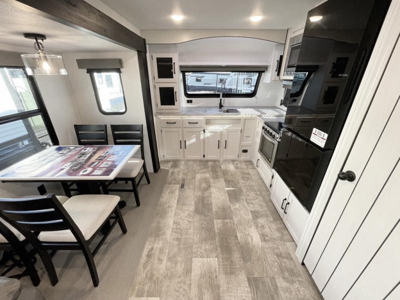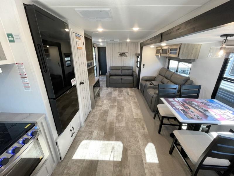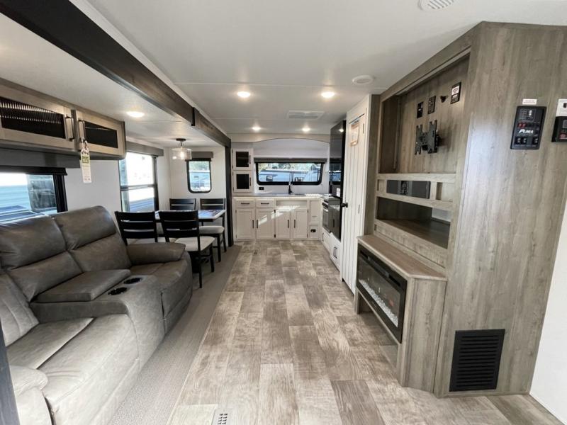 Experience a home away from home with this travel trailer! The front kitchen has everything you will need to prepare your best meals and you can enjoy them at the booth dinette. The rear private bedroom has a 72" x 80" king bed slide across from a dresser, a wardrobe, and a closet with washer and dryer prep. Freshen up in the full bathroom with the 34" x 34" radius shower and then enjoy a cup of coffee relaxing in one of the two recliners or on the sofa! Choose the optional outside micro kitchen with a griddle for even more convenience!