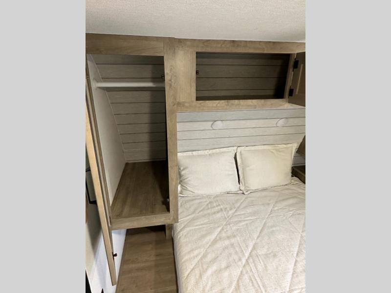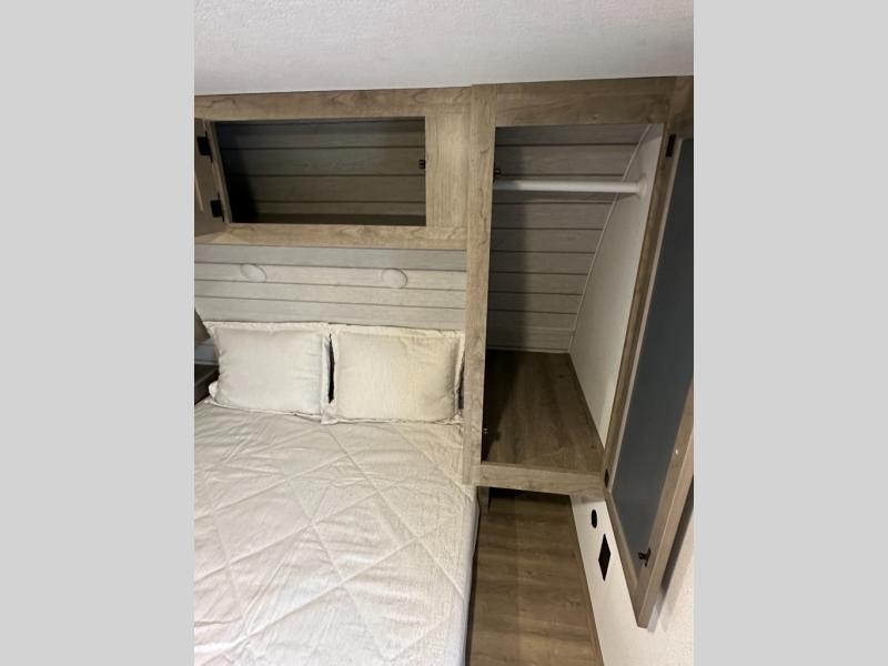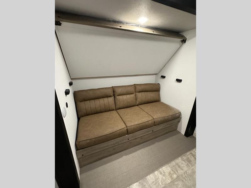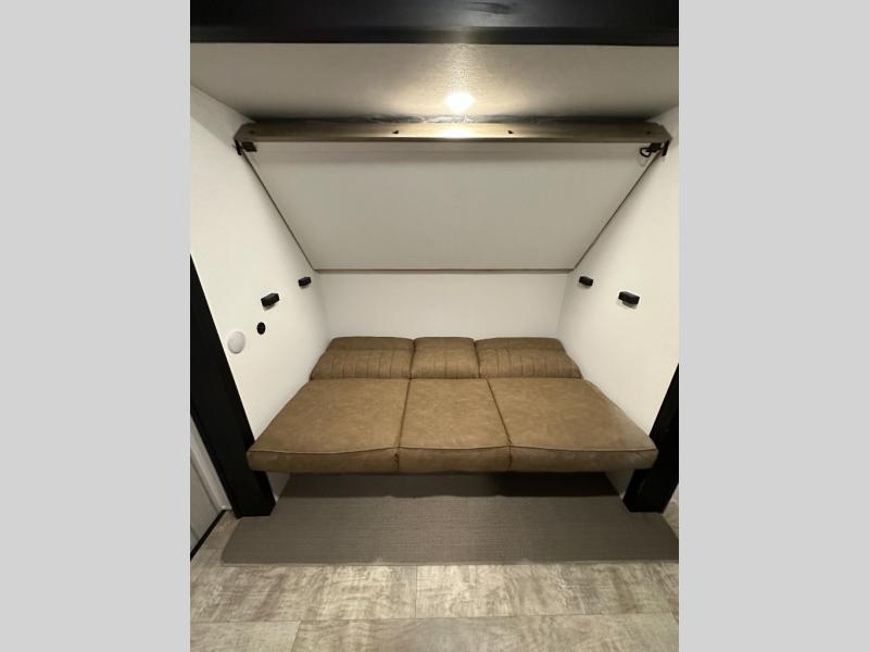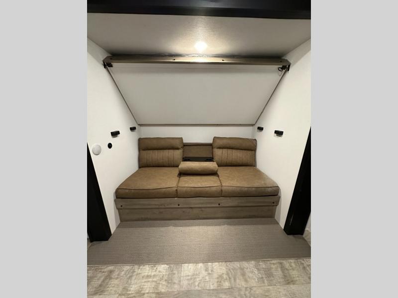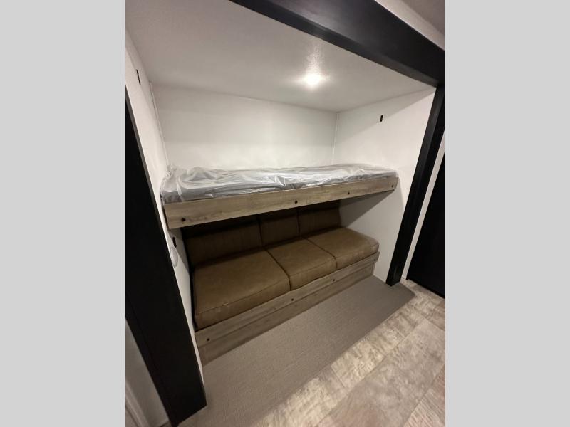 Rear Bunkhouse: Two bunks + a fold-down sofa + entertainment center in the rear. Good for kids or guests.