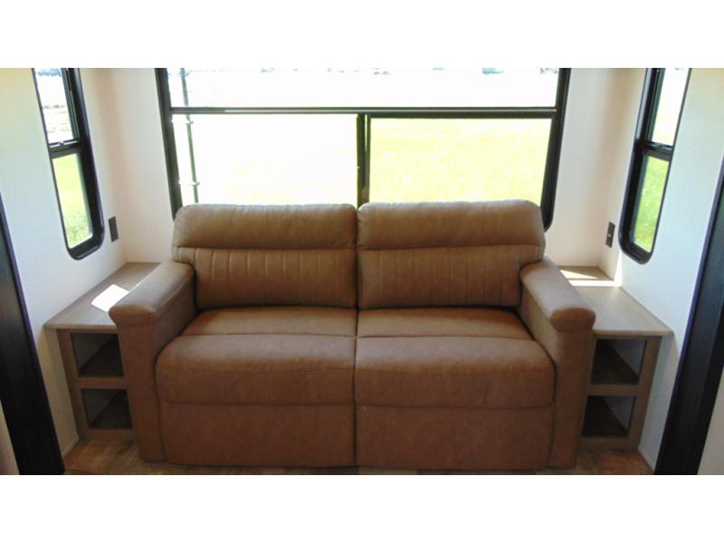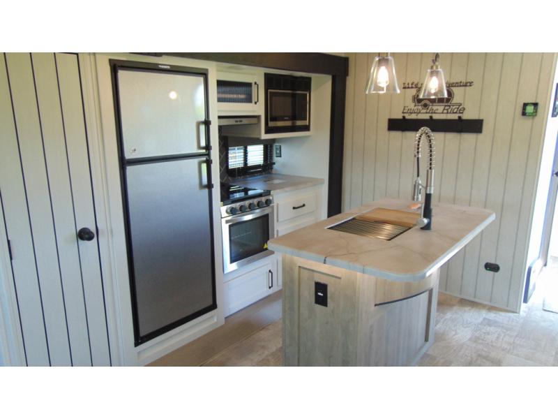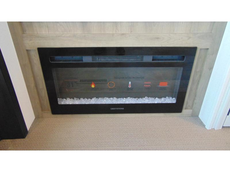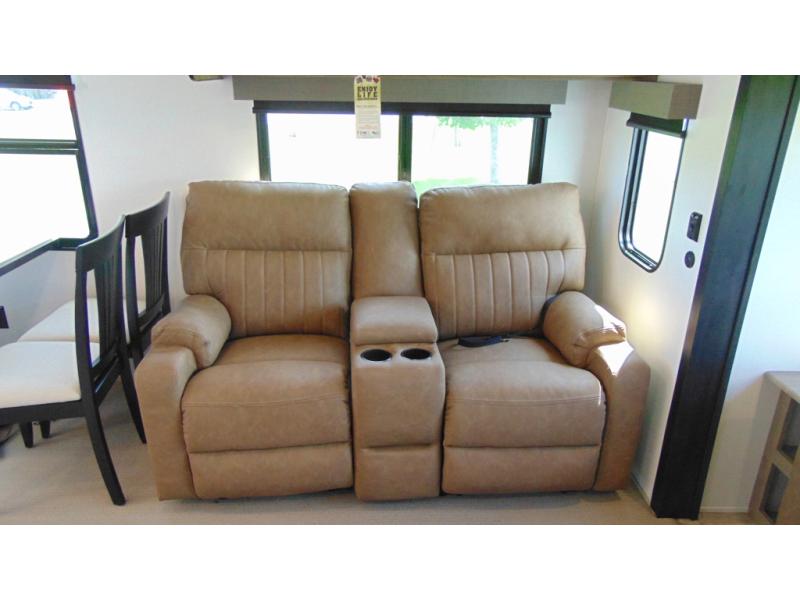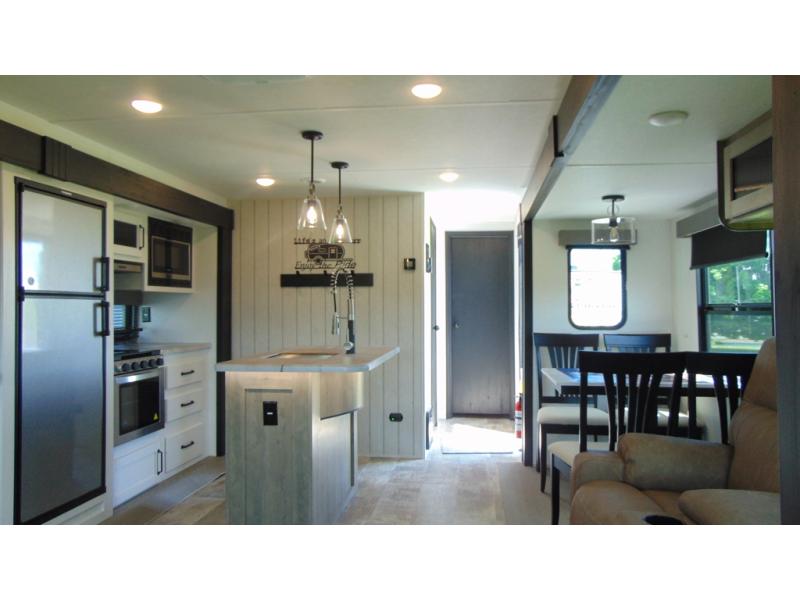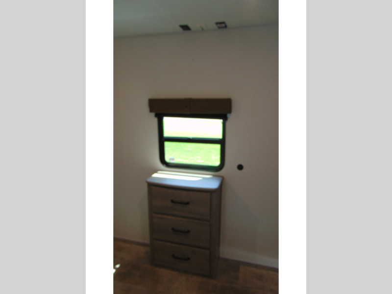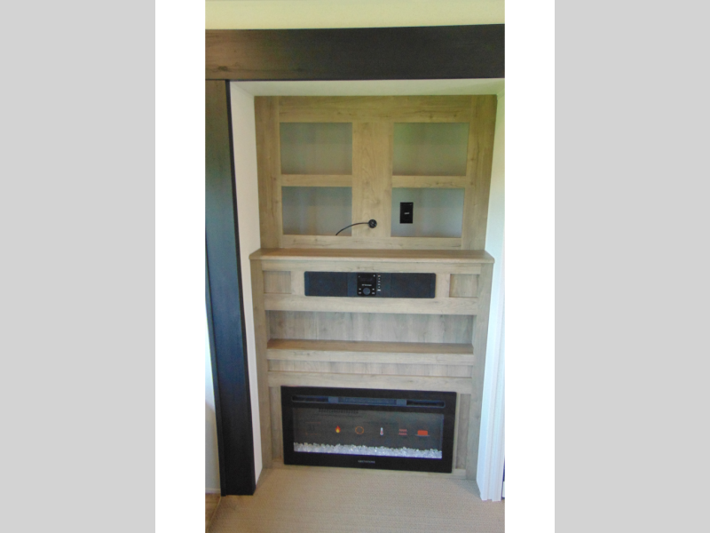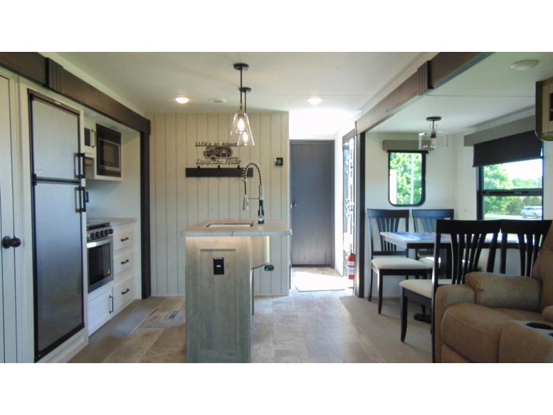 You're going to feel right at home in this travel trailer! The front private bedroom has a queen bed slide for a good night's rest, a dresser and front closet for your clothes, and another closet with washer and dryer prep. Freshen up each morning in the full bathroom with the 32" x 40" shower with a seat and then head to the kitchen to fry up some eggs on the stainless steel oven and range. You will also appreciate having a kitchen island for easier meal prep and a walk-in pantry to easily see your canned goods and snacks. The booth dinette offers a comfortable place to dine, play, and even sleep once converted. What better way to wind down your nights than to relax on either the rear sofa or in one of the two recliners across from the entertainment center with a fireplace!