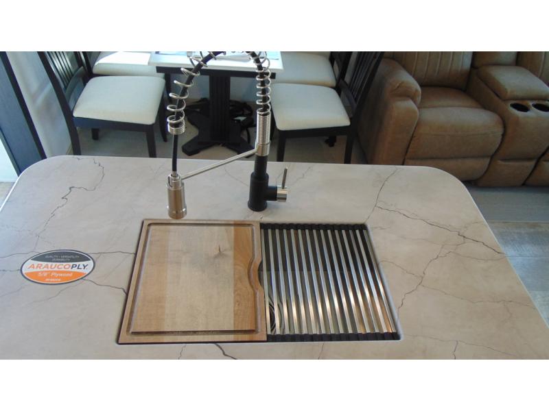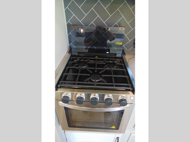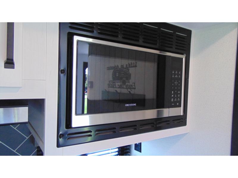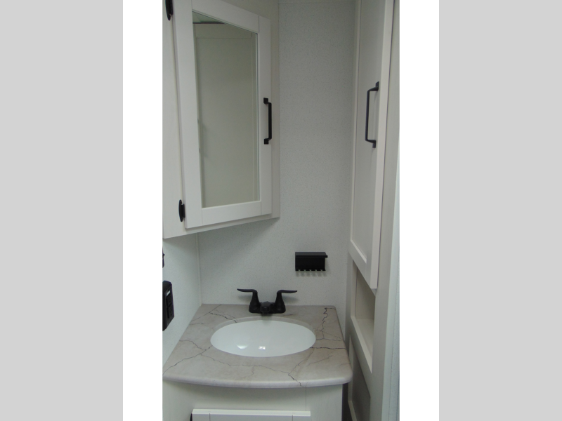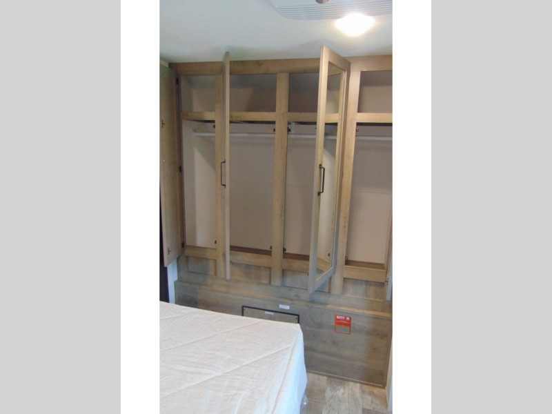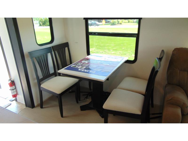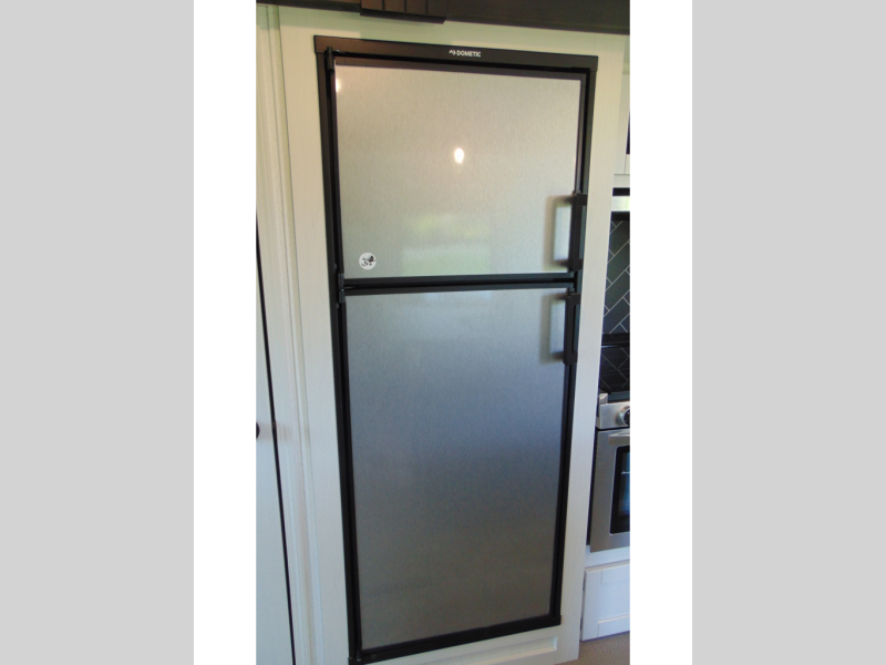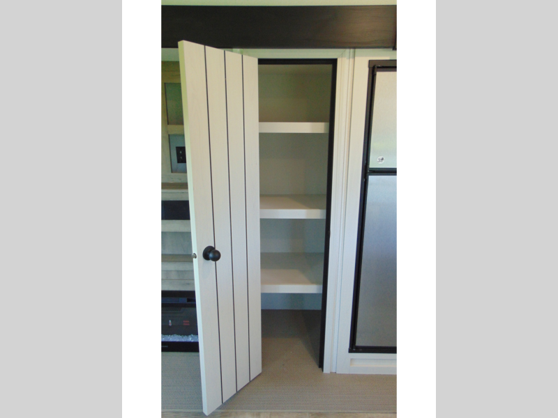 You're going to feel right at home in this travel trailer! The front private bedroom has a queen bed slide for a good night's rest, a dresser and front closet for your clothes, and another closet with washer and dryer prep. Freshen up each morning in the full bathroom with the 32" x 40" shower with a seat and then head to the kitchen to fry up some eggs on the stainless steel oven and range. You will also appreciate having a kitchen island for easier meal prep and a walk-in pantry to easily see your canned goods and snacks. The booth dinette offers a comfortable place to dine, play, and even sleep once converted. What better way to wind down your nights than to relax on either the rear sofa or in one of the two recliners across from the entertainment center with a fireplace!