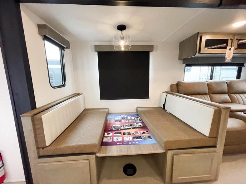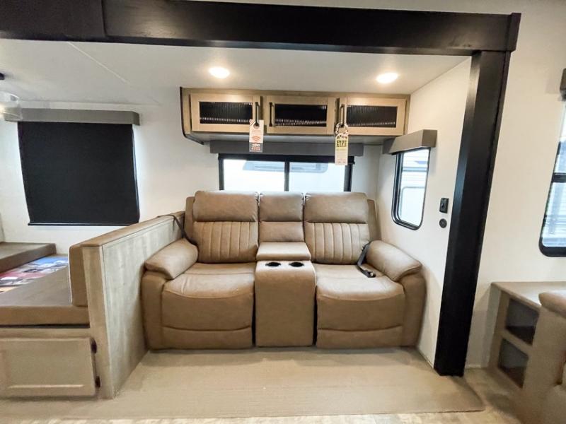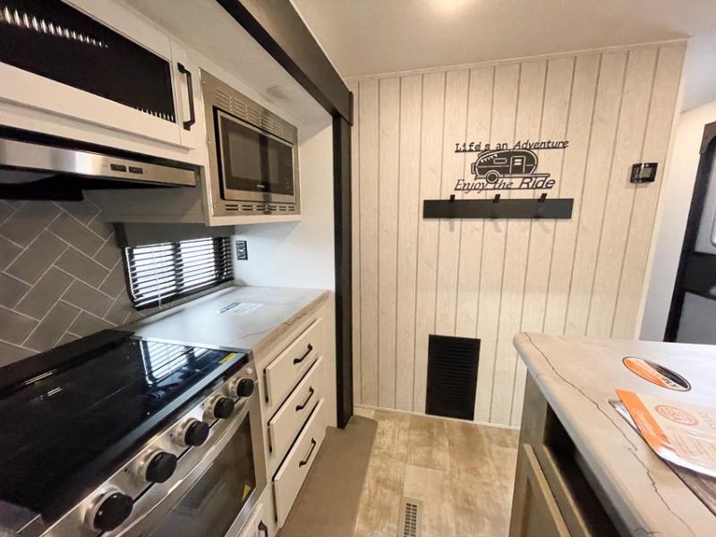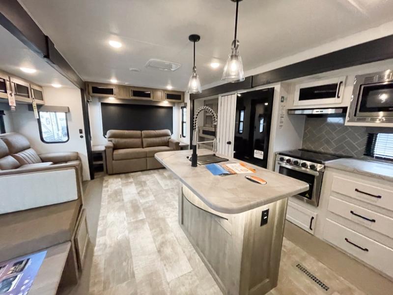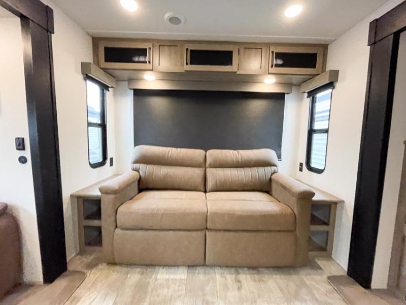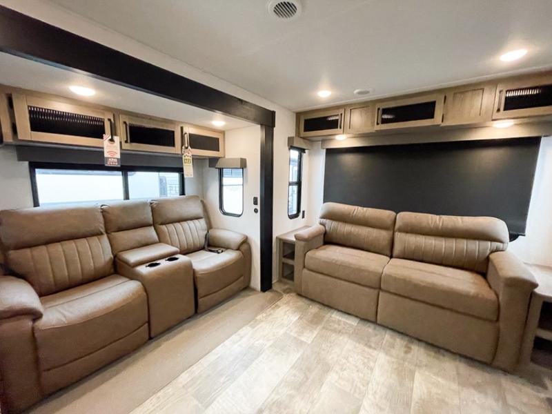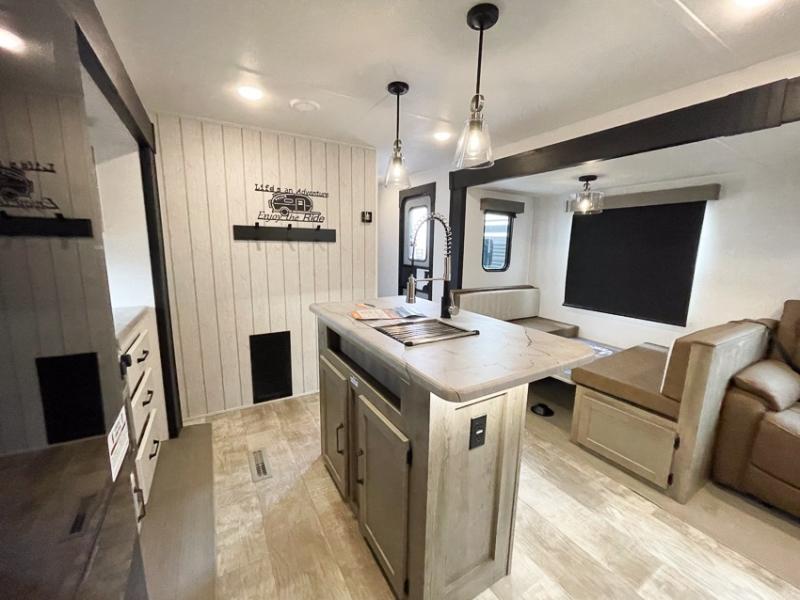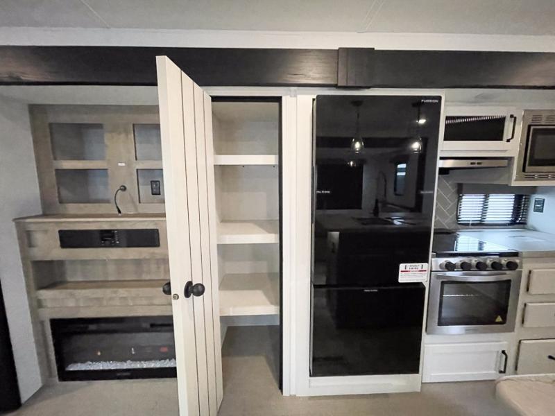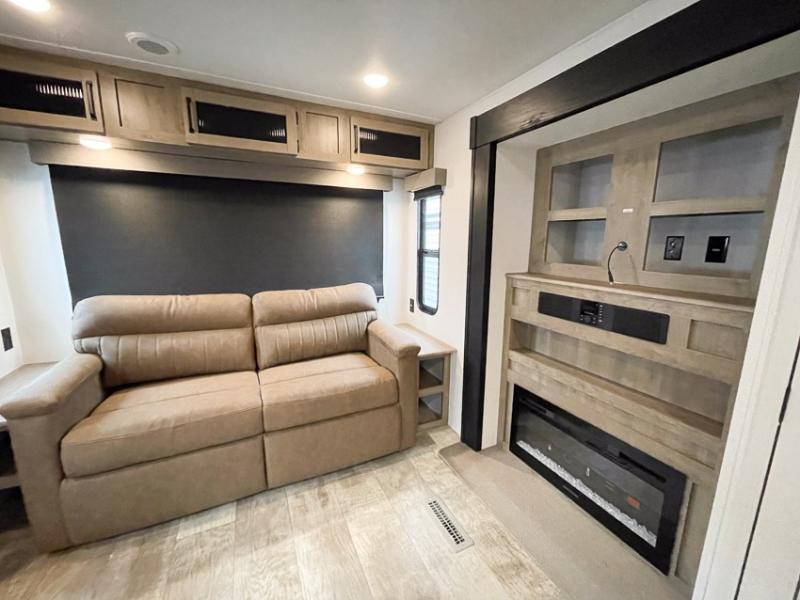 You're going to feel right at home in this travel trailer! The front private bedroom has a queen bed slide for a good night's rest, a dresser and front closet for your clothes, and another closet with washer and dryer prep. Freshen up each morning in the full bathroom with the 32" x 40" shower with a seat and then head to the kitchen to fry up some eggs on the stainless steel oven and range. You will also appreciate having a kitchen island for easier meal prep and a walk-in pantry to easily see your canned goods and snacks. The booth dinette offers a comfortable place to dine, play, and even sleep once converted. What better way to wind down your nights than to relax on either the rear sofa or in one of the two recliners across from the entertainment center with a fireplace!