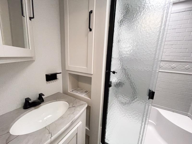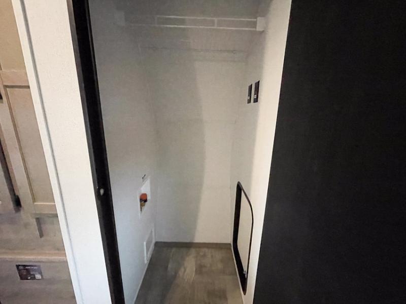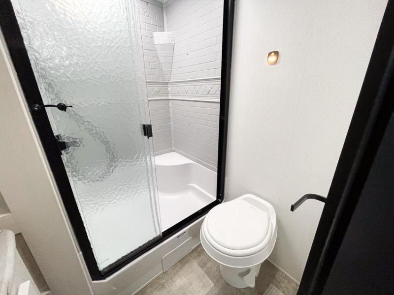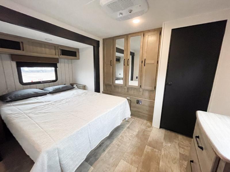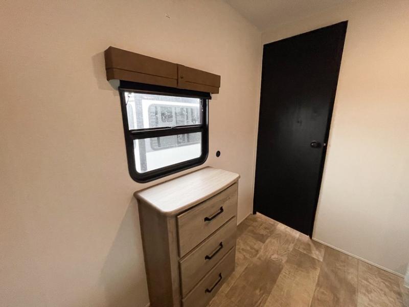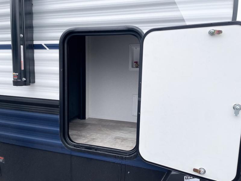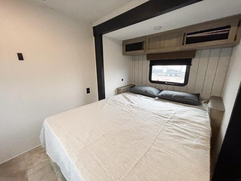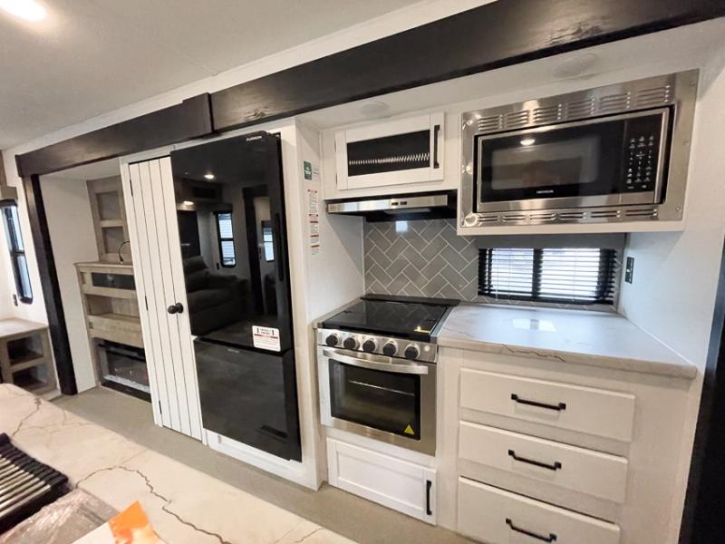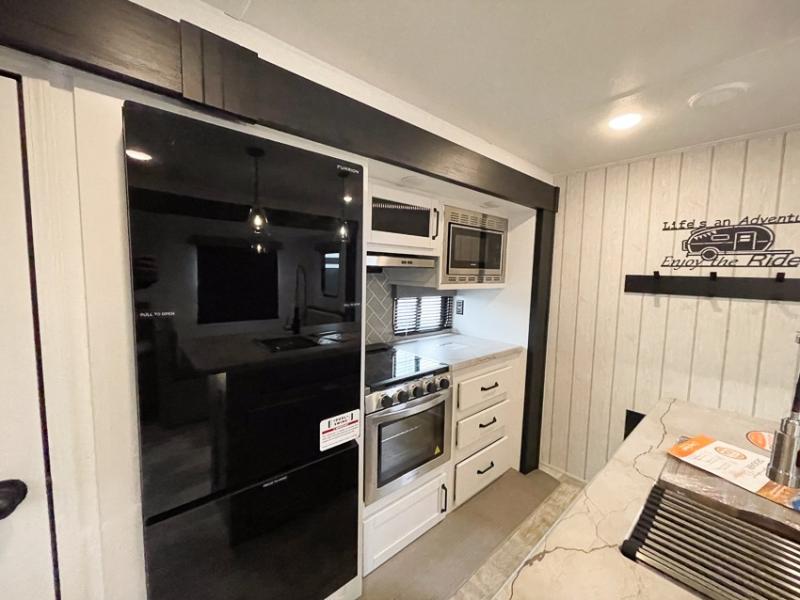 You're going to feel right at home in this travel trailer! The front private bedroom has a queen bed slide for a good night's rest, a dresser and front closet for your clothes, and another closet with washer and dryer prep. Freshen up each morning in the full bathroom with the 32" x 40" shower with a seat and then head to the kitchen to fry up some eggs on the stainless steel oven and range. You will also appreciate having a kitchen island for easier meal prep and a walk-in pantry to easily see your canned goods and snacks. The booth dinette offers a comfortable place to dine, play, and even sleep once converted. What better way to wind down your nights than to relax on either the rear sofa or in one of the two recliners across from the entertainment center with a fireplace!
