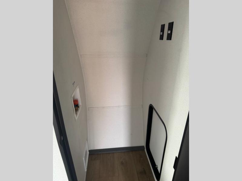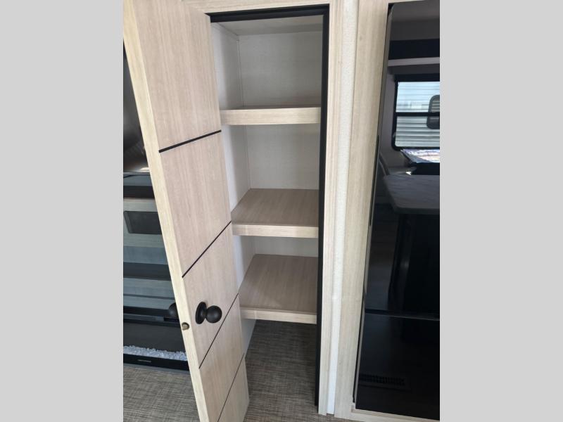 You're going to feel right at home in this travel trailer! The front private bedroom has a queen bed slide for a good night's rest, a dresser and front closet for your clothes, and another closet with washer and dryer prep. Freshen up each morning in the full bathroom with the 32" x 40" shower with a seat and then head to the kitchen to fry up some eggs on the stainless steel oven and range. You will also appreciate having a kitchen island for easier meal prep and a walk-in pantry to easily see your canned goods and snacks. The booth dinette offers a comfortable place to dine, play, and even sleep once converted. What better way to wind down your nights than to relax on either the rear sofa or in one of the two recliners across from the entertainment center with a fireplace!