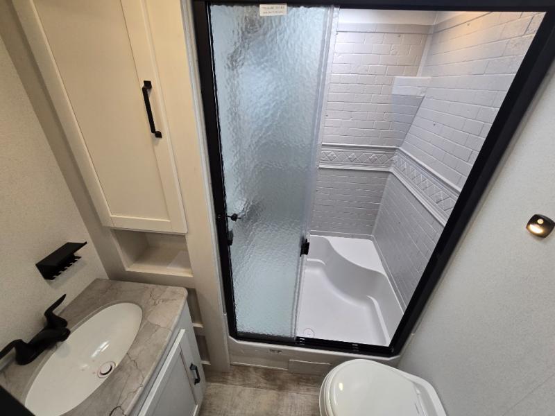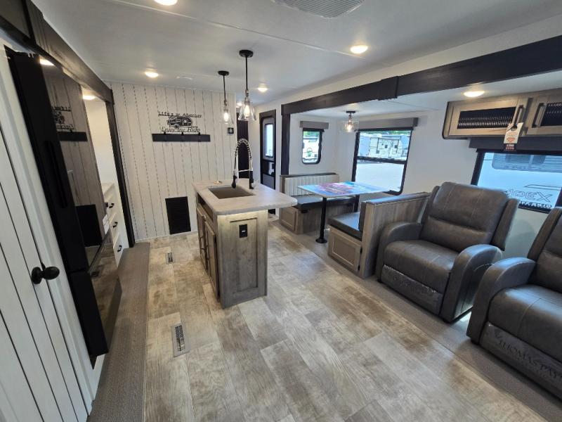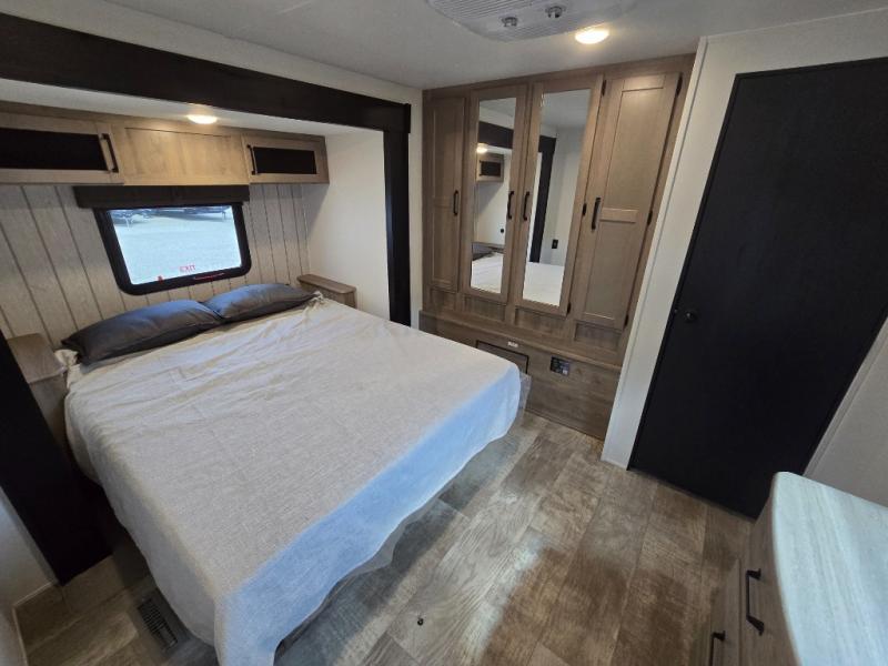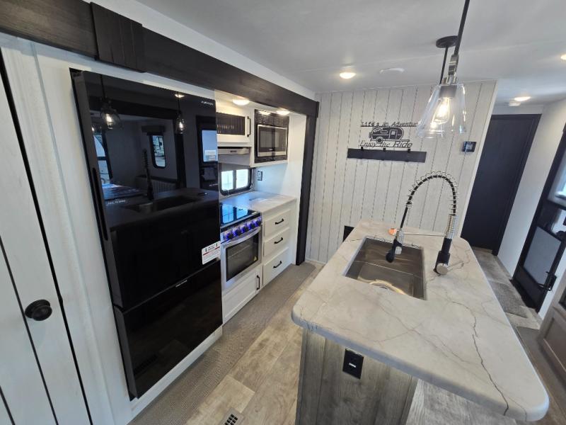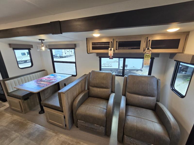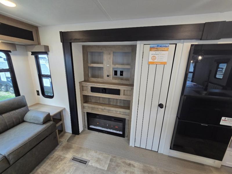 You're going to feel right at home in this travel trailer! The front private bedroom has a queen bed slide for a good night's rest, a dresser and front closet for your clothes, and another closet with washer and dryer prep. Freshen up each morning in the full bathroom with the 32" x 40" shower with a seat and then head to the kitchen to fry up some eggs on the stainless steel oven and range. You will also appreciate having a kitchen island for easier meal prep and a walk-in pantry to easily see your canned goods and snacks. The booth dinette offers a comfortable place to dine, play, and even sleep once converted. What better way to wind down your nights than to relax on either the rear sofa or in one of the two recliners across from the entertainment center with a fireplace!