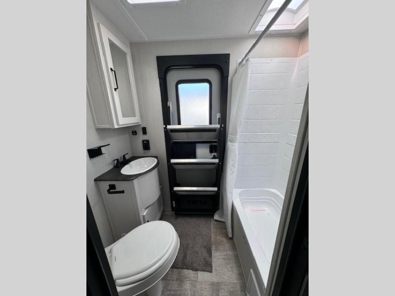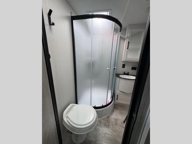With two full bathrooms, it's a clean decision to take this travel trailer on your next family vacation! Start each morning feeling recharged after sleeping on the queen bed in the front private bedroom or in the rear private bunkhouse with an angled top bunk above a 32" x 69" double bunk bed and a 32" x 69" bunk above a 68" sofa slide. The bunkhouse also has a full bathroom with a 24" x 40" tub and one of the dual entry doors to the unit. You can relax on the sofa while enjoying the entertainment center and eat your meals prepared with the kitchen island at the booth dinette. You can also choose the outside kitchen option for more convenience!