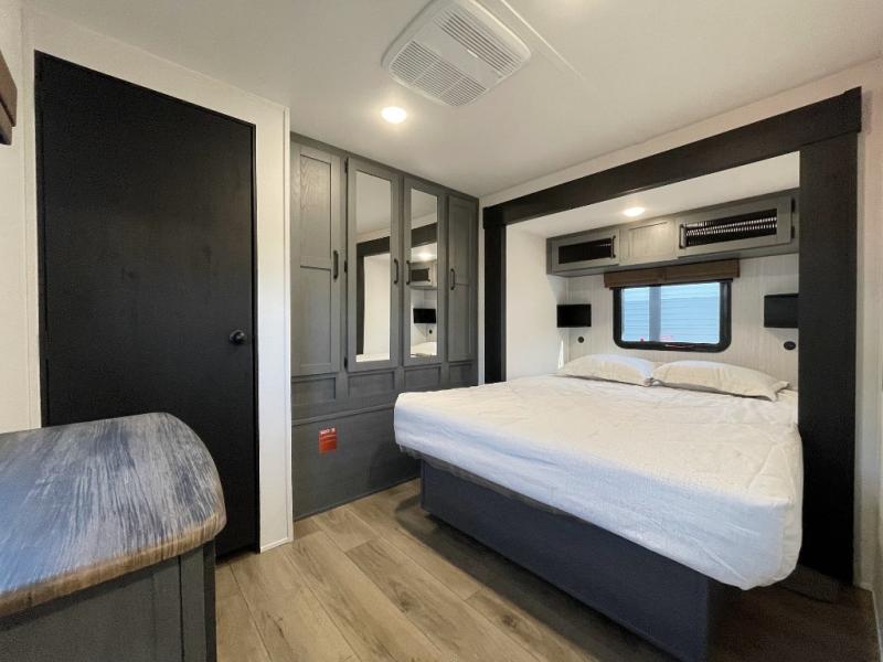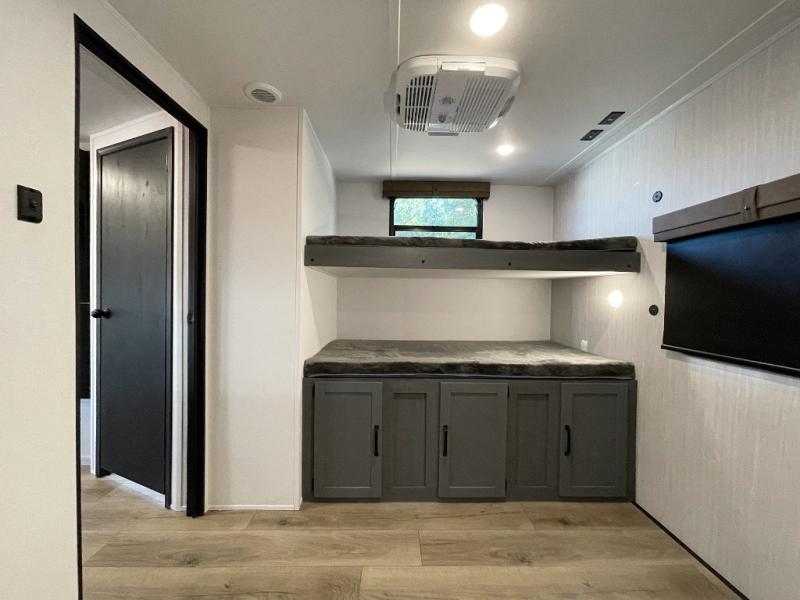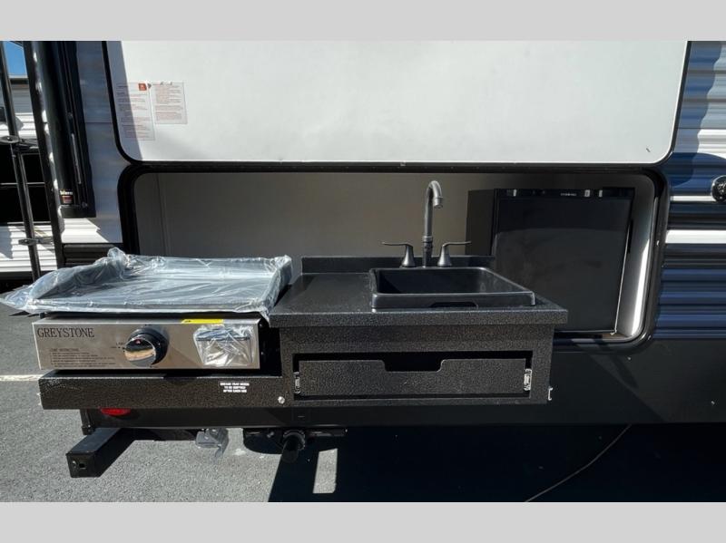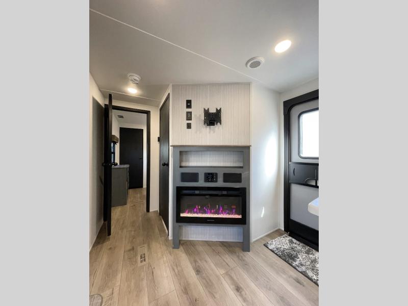 With dual entry doors and a bath and a half, you will have the ultimate in convenience with this travel trailer! The bedroom also has a front closet to keep your clothes looking their best and a queen bed slide for you to sleep your best. Everyone can freshen up in the full bathroom with the 34" x 34" radius shower and fill their bellies with scrambled eggs cooked with the stainless steel oven and range. Enjoy your meals, play games, and even sleep at the booth dinette or relax on the sofa while watching a movie with the entertainment center and fireplace. And your guests will love the rear private bunkhouse with three bunks, a jiffy sofa, and a slide out for more space! This model also includes an optional outside mini kitchen with a griddle!