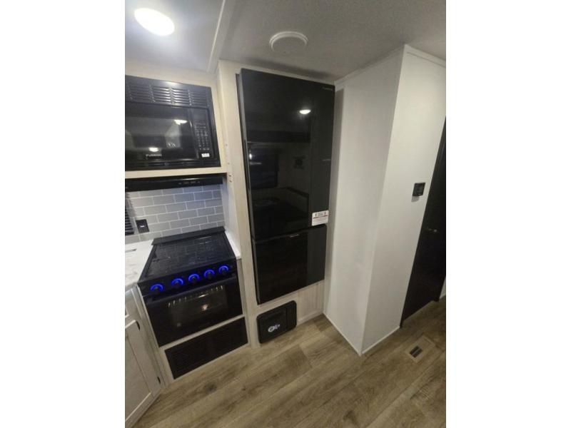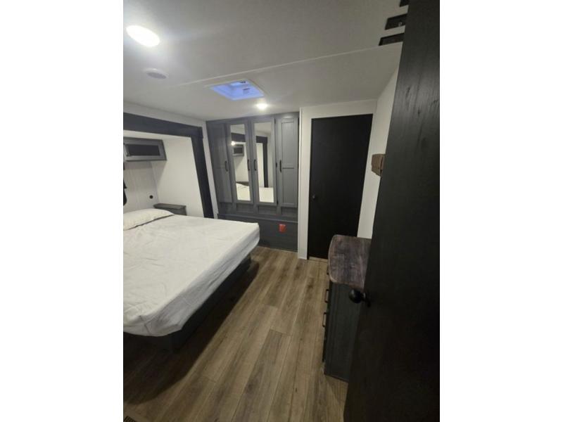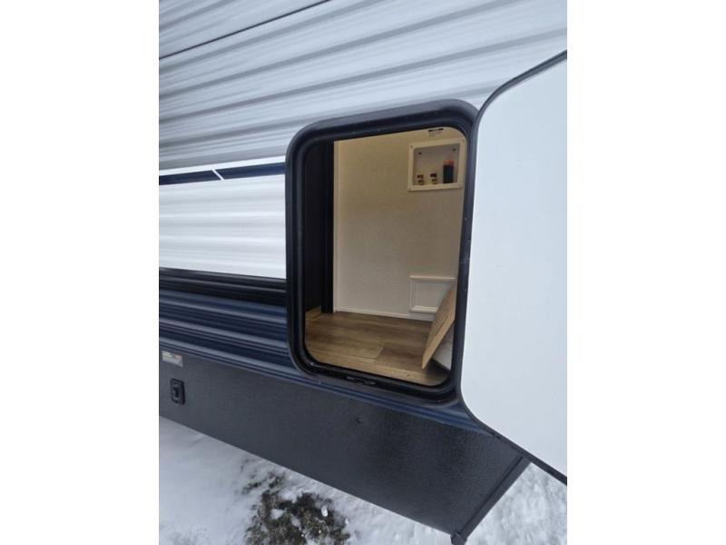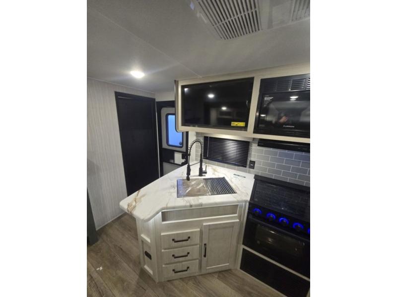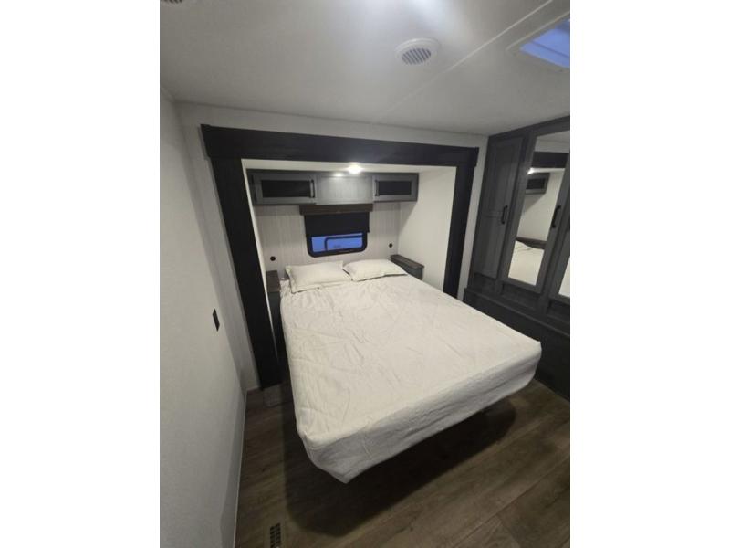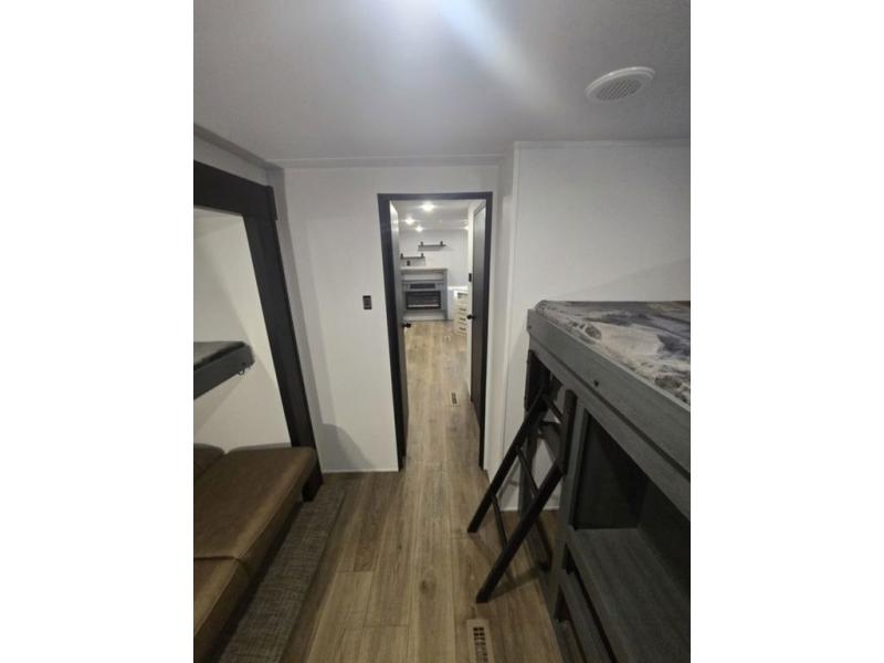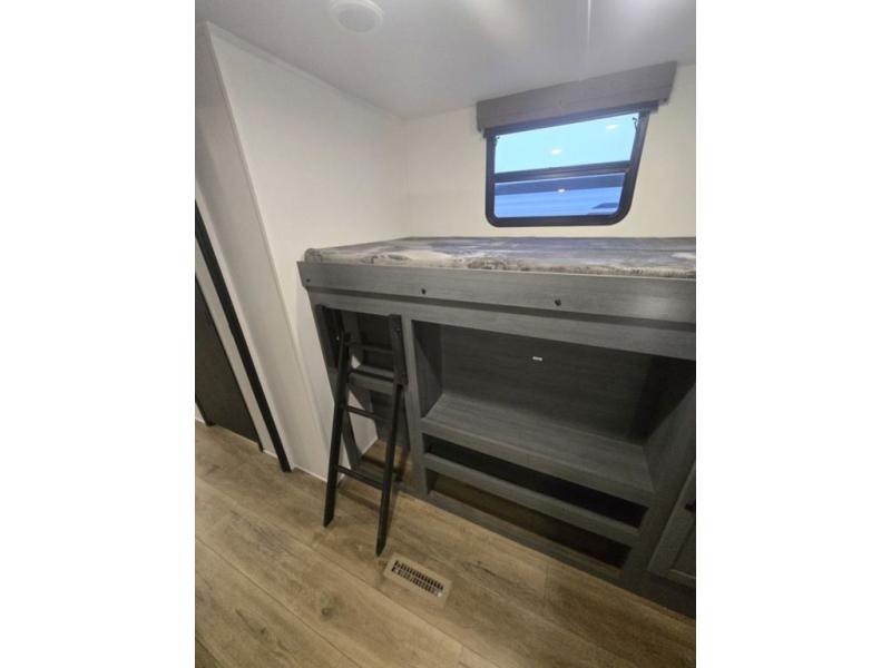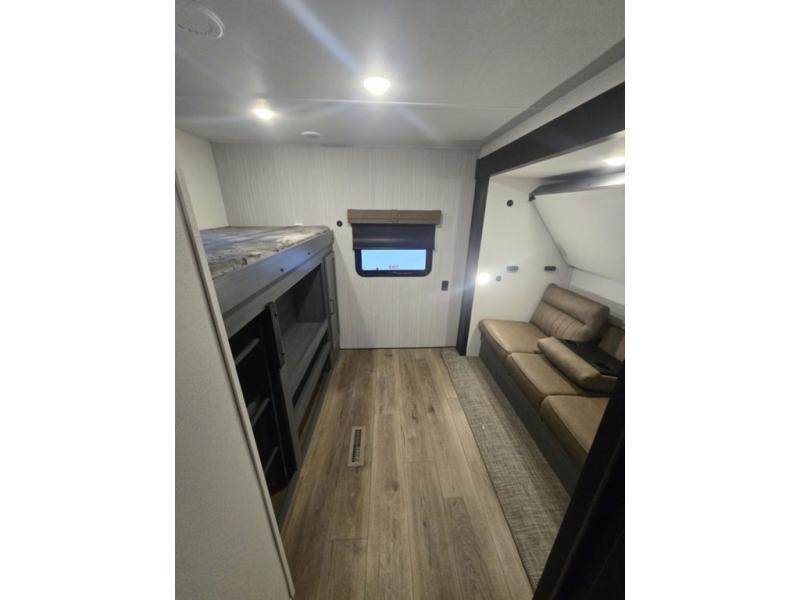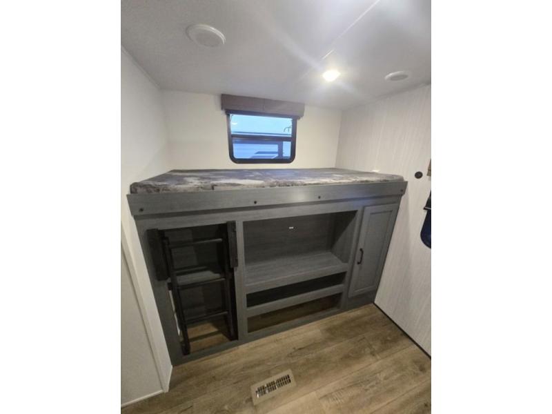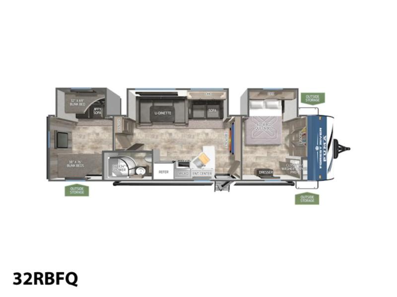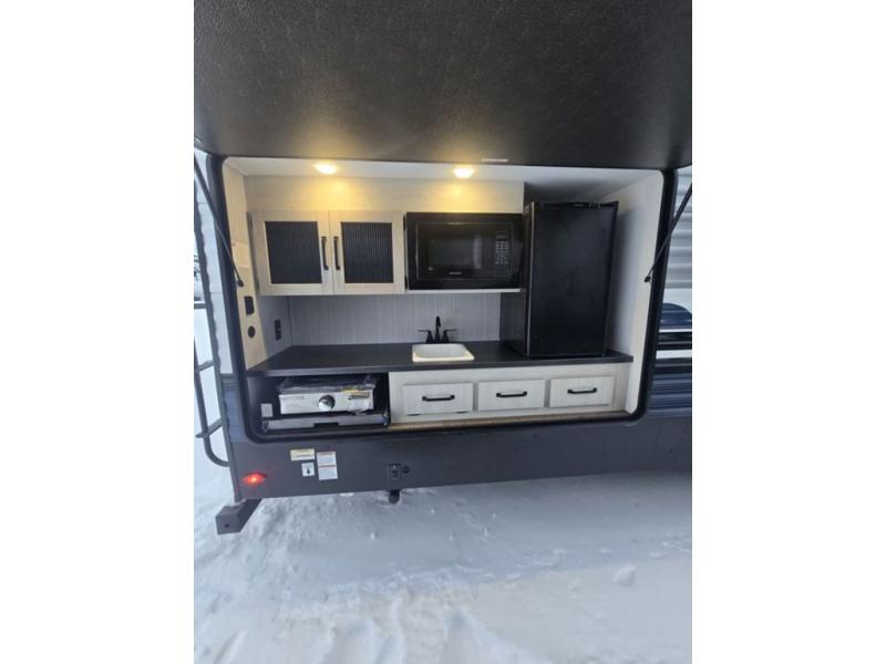 The whole family will love camping in this travel trailer! The kids will have their own privacy with the rear private bunkhouse which has a 32" x 69" bunk above a jiffy sofa slide and a 38" x 76" bunk above an entertainment center to keep them occupied on those rainy days. And you will have your own privacy with the front private bedroom that has a queen bed slide across from a dresser and a front closet. There is even a second closet with washer and dryer prep if you choose to add those appliances. Everyone can stay clean in the full bathroom with the 34" x 34" radius shower and their bellies full with the full kitchen. And you can choose between two outside kitchen options for even more convenience!