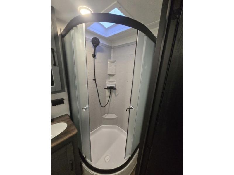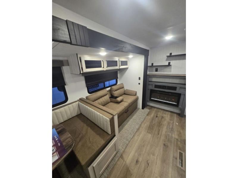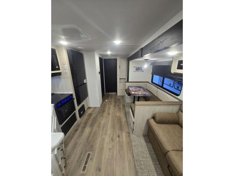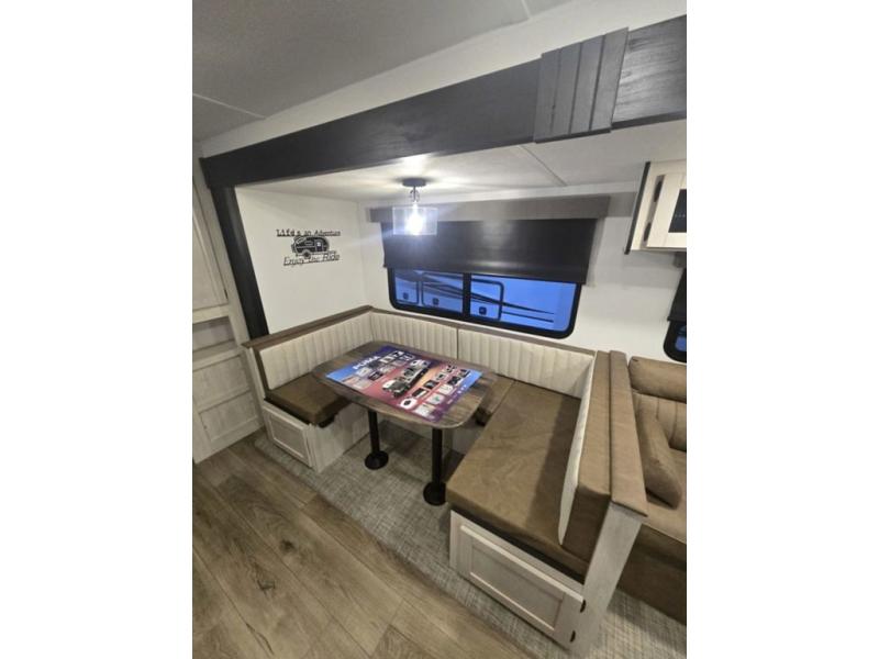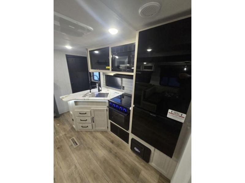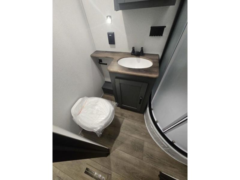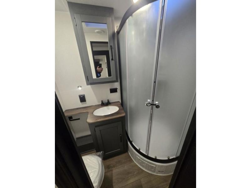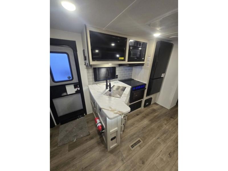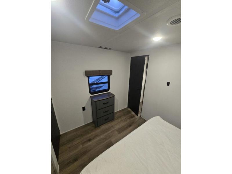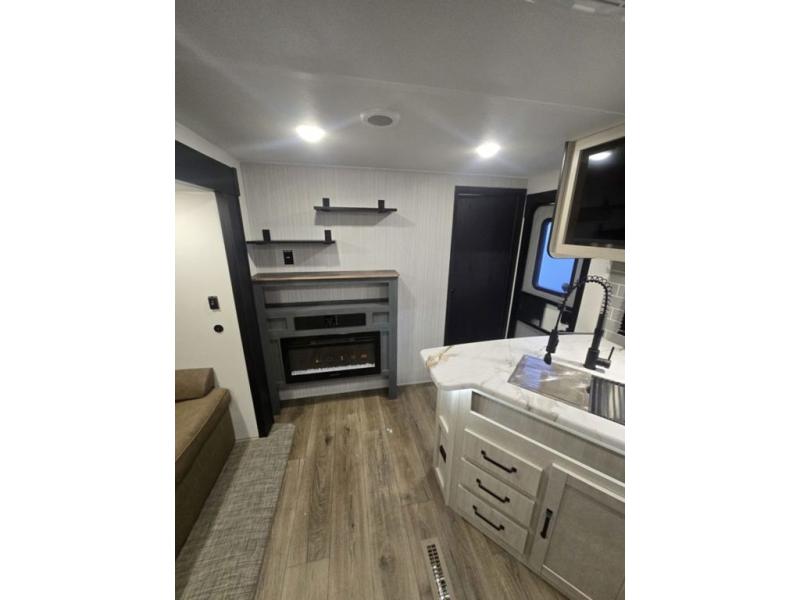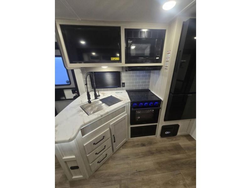 The whole family will love camping in this travel trailer! The kids will have their own privacy with the rear private bunkhouse which has a 32" x 69" bunk above a jiffy sofa slide and a 38" x 76" bunk above an entertainment center to keep them occupied on those rainy days. And you will have your own privacy with the front private bedroom that has a queen bed slide across from a dresser and a front closet. There is even a second closet with washer and dryer prep if you choose to add those appliances. Everyone can stay clean in the full bathroom with the 34" x 34" radius shower and their bellies full with the full kitchen. And you can choose between two outside kitchen options for even more convenience!
