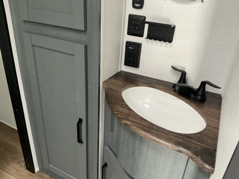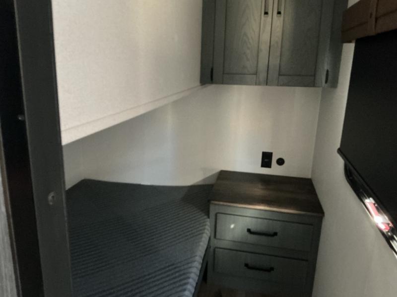 This travel trailer is perfect for camping with a larger group of friends or if you have older kids since there are two private bunkrooms! Each room includes a bunk bed and storage space for clothes, shoes, and more. You'll enjoy your own space up front in the master bedroom that includes a queen bed, dual shirt closets, and one of the dual entry doors to the unit for added convenience. Everyone can come together in the combined living area and kitchen that includes a large slide out with a sofa and booth dinette, plus there is a fireplace to make this space feel more like home. A full kitchen inside lets you create home-cooked meals each day, and you can choose to add the optional micro kitchen with a griddle for a pancake breakfast outdoors!