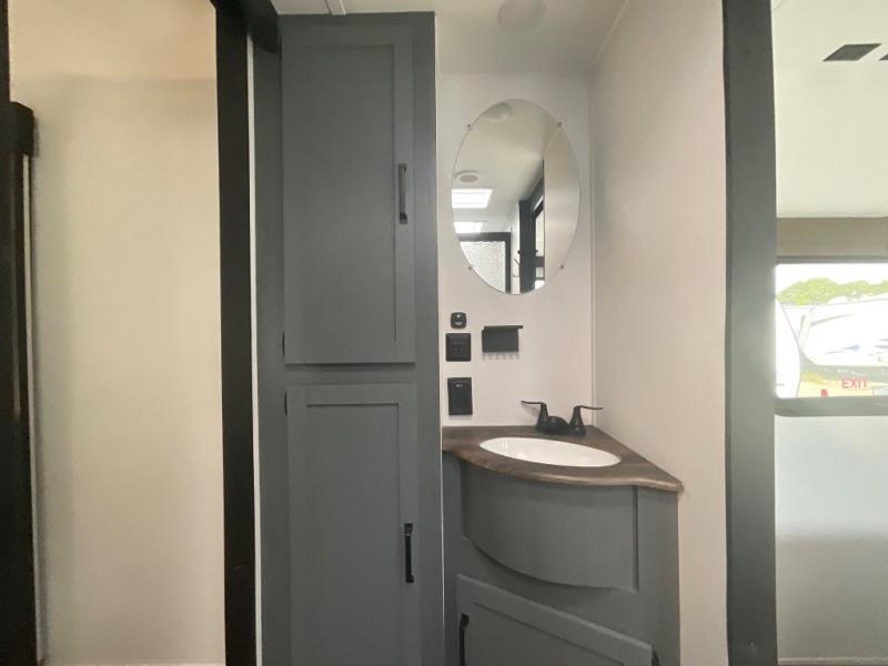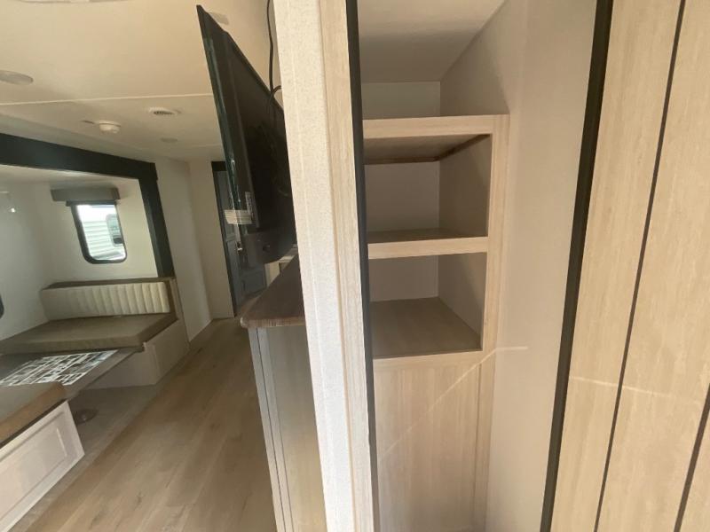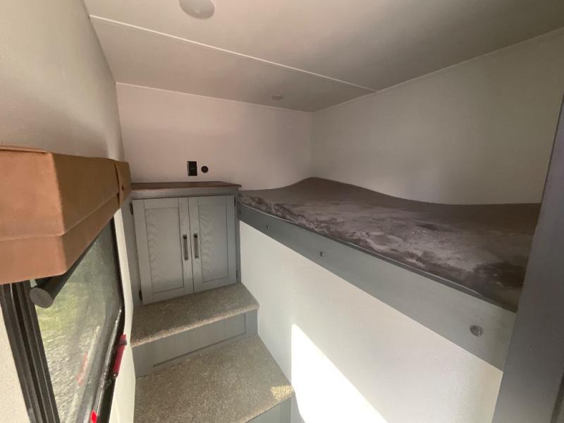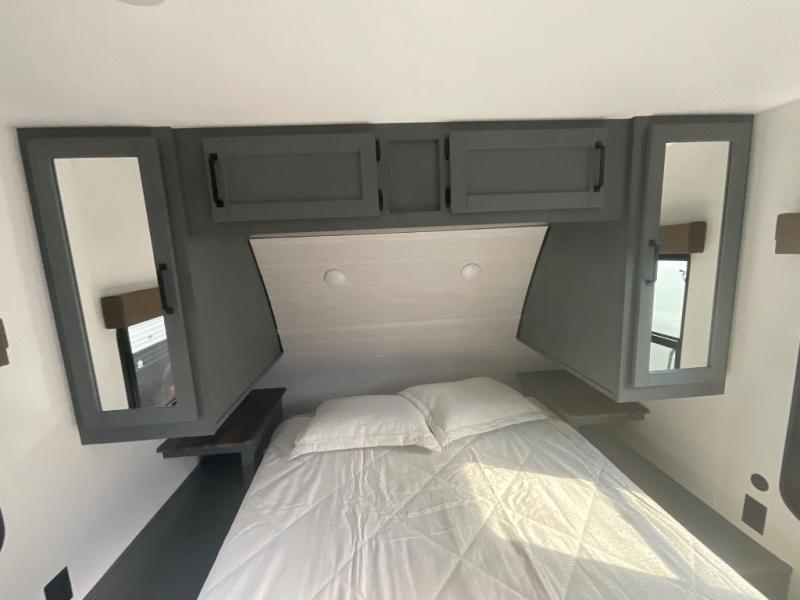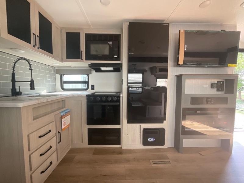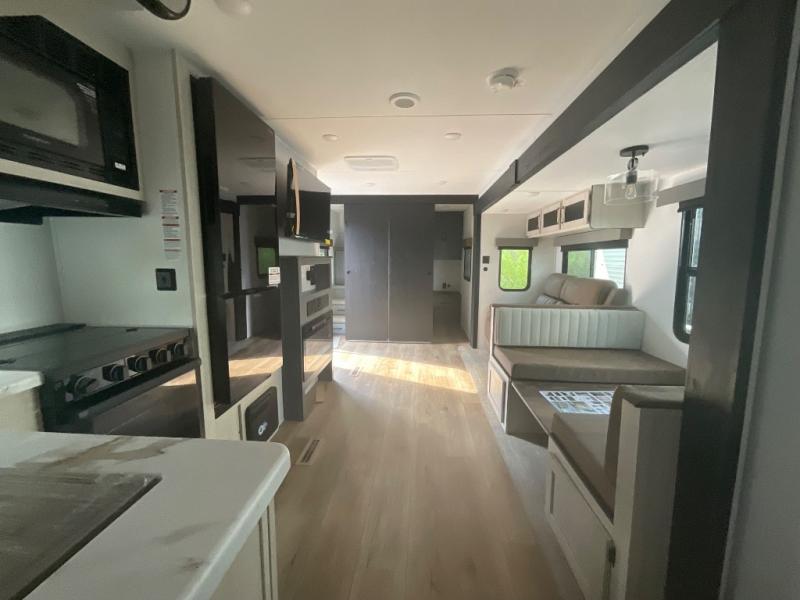 This travel trailer is perfect for camping with a larger group of friends or if you have older kids since there are two private bunkrooms! Each room includes a bunk bed and storage space for clothes, shoes, and more. You'll enjoy your own space up front in the master bedroom that includes a queen bed, dual shirt closets, and one of the dual entry doors to the unit for added convenience. Everyone can come together in the combined living area and kitchen that includes a large slide out with a sofa and booth dinette, plus there is a fireplace to make this space feel more like home. A full kitchen inside lets you create home-cooked meals each day, and you can choose to add the optional micro kitchen with a griddle for a pancake breakfast outdoors!