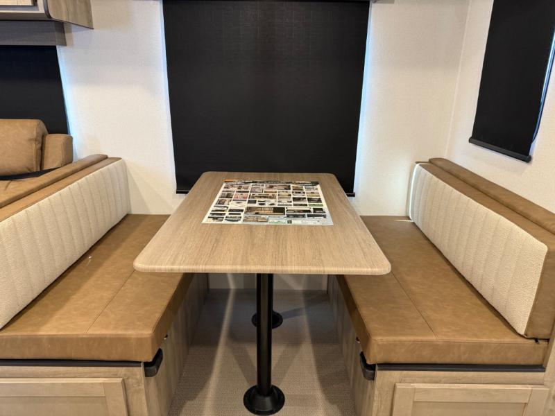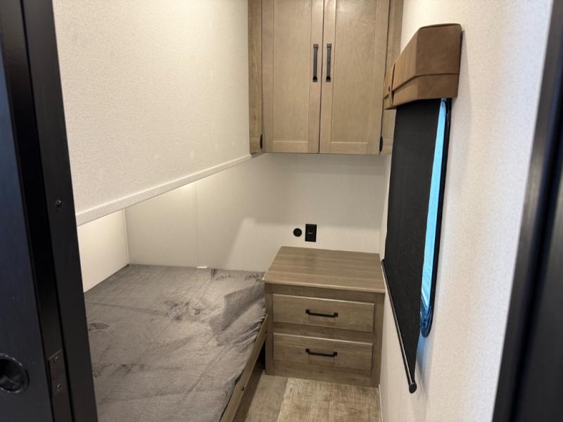 This travel trailer is perfect for camping with a larger group of friends or if you have older kids since there are two private bunkrooms! Each room includes a bunk bed and storage space for clothes, shoes, and more. You'll enjoy your own space up front in the master bedroom that includes a queen bed, dual shirt closets, and one of the dual entry doors to the unit for added convenience. Everyone can come together in the combined living area and kitchen that includes a large slide out with a sofa and booth dinette, plus there is a fireplace to make this space feel more like home. A full kitchen inside lets you create home-cooked meals each day, and you can choose to add the optional micro kitchen with a griddle for a pancake breakfast outdoors!
