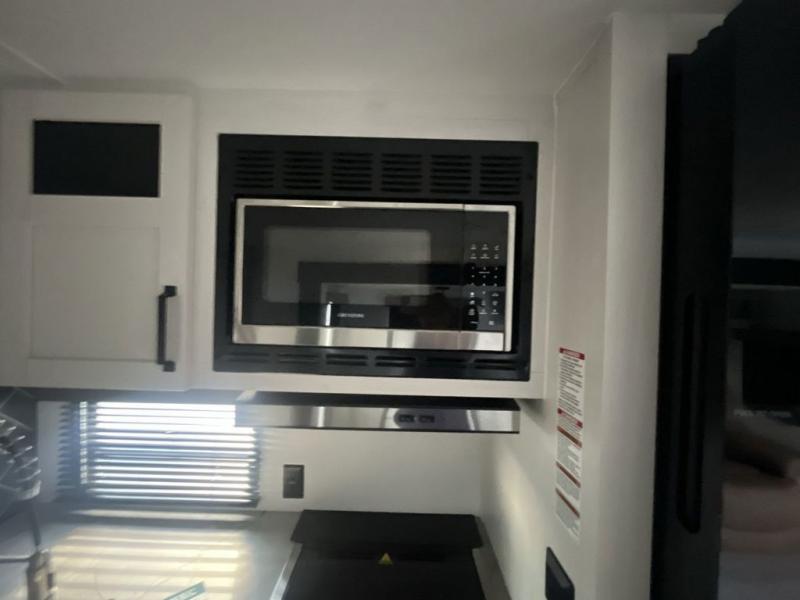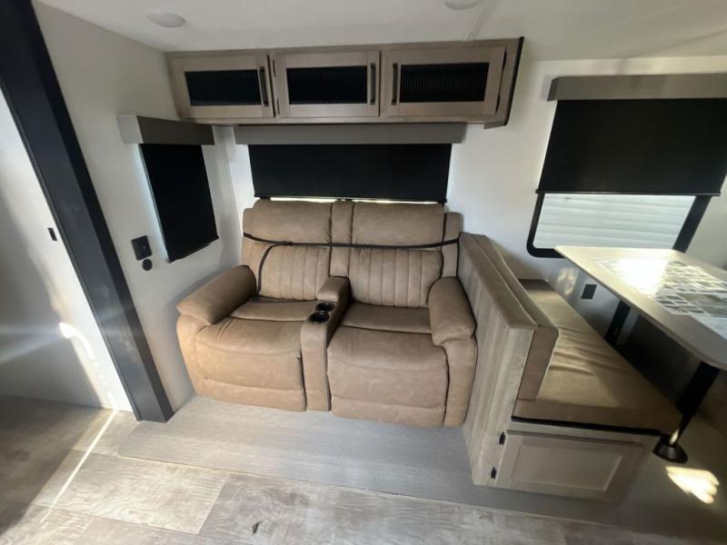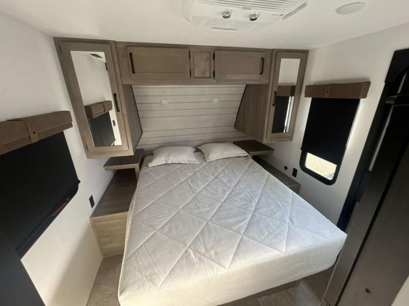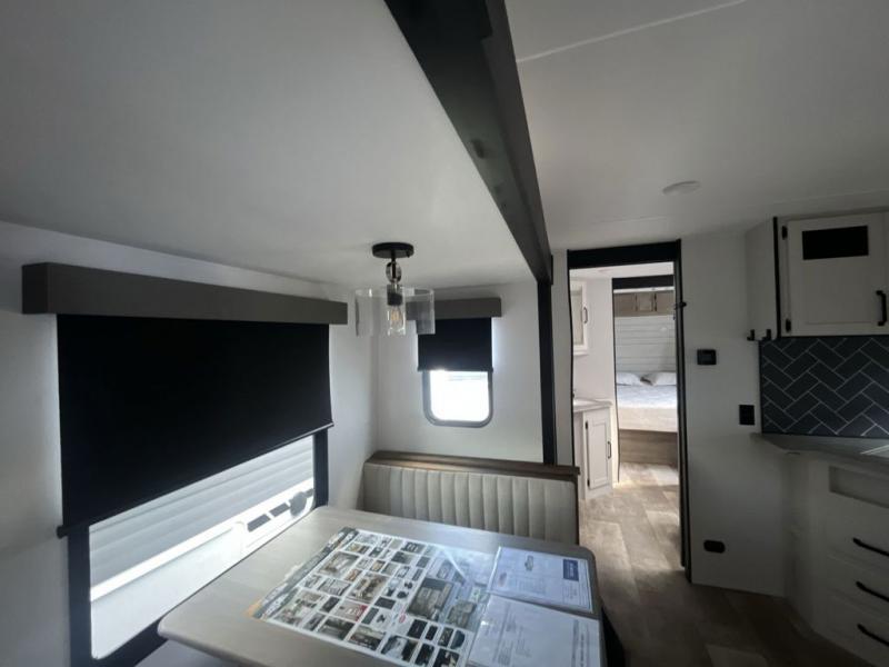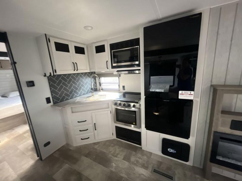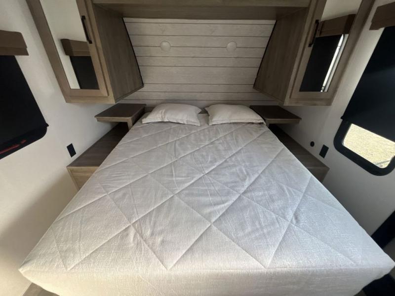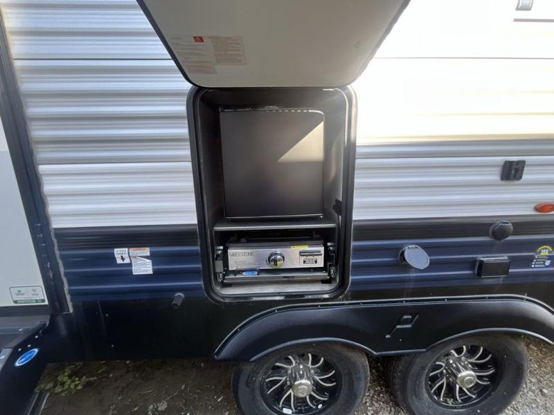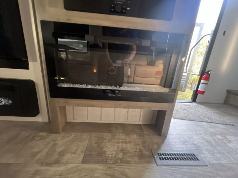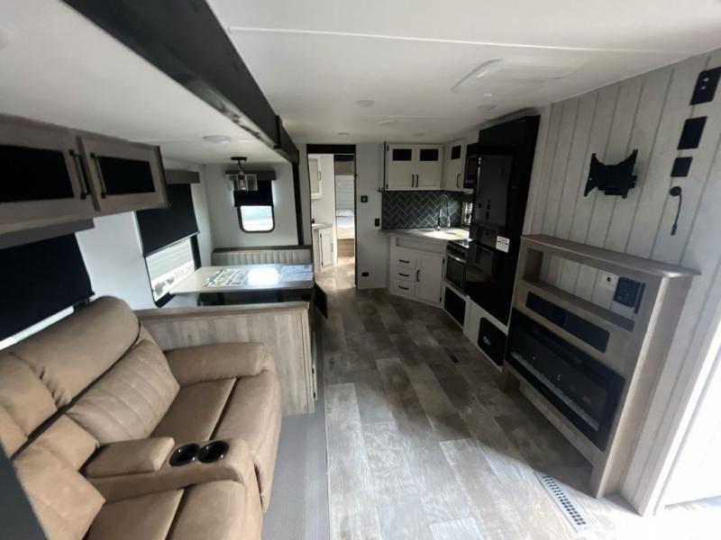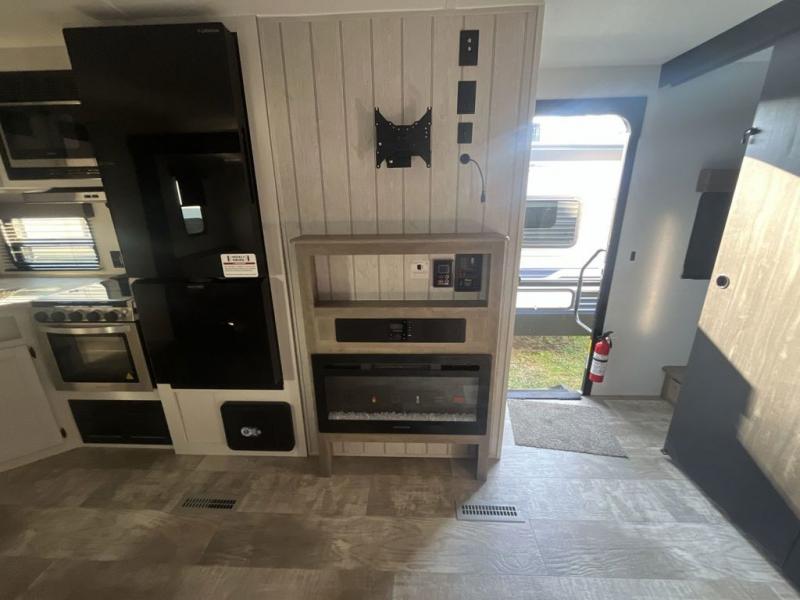 This travel trailer is perfect for camping with a larger group of friends or if you have older kids since there are two private bunkrooms! Each room includes a bunk bed and storage space for clothes, shoes, and more. You'll enjoy your own space up front in the master bedroom that includes a queen bed, dual shirt closets, and one of the dual entry doors to the unit for added convenience. Everyone can come together in the combined living area and kitchen that includes a large slide out with a sofa and booth dinette, plus there is a fireplace to make this space feel more like home. A full kitchen inside lets you create home-cooked meals each day, and you can choose to add the optional micro kitchen with a griddle for a pancake breakfast outdoors!