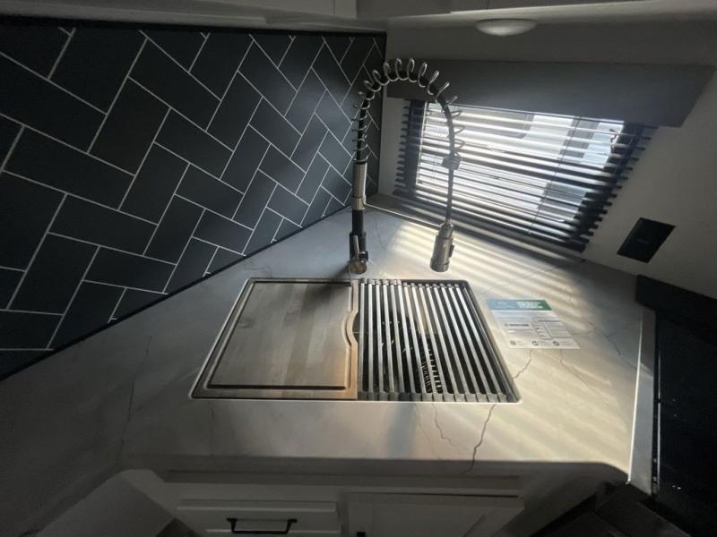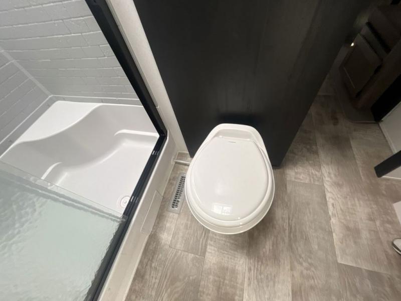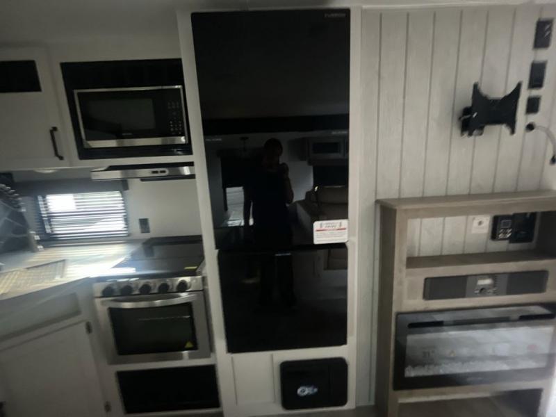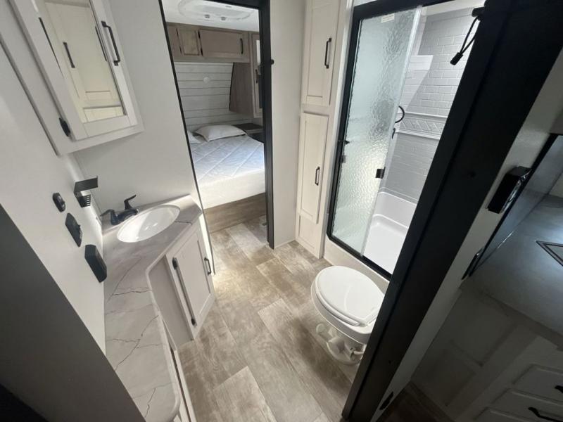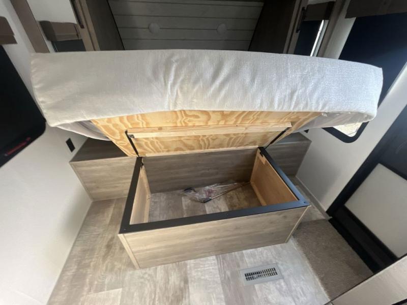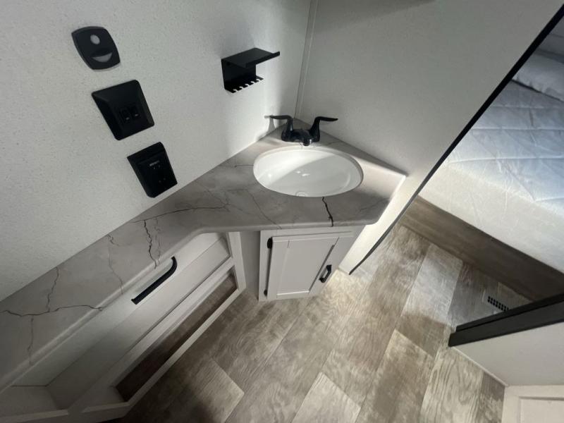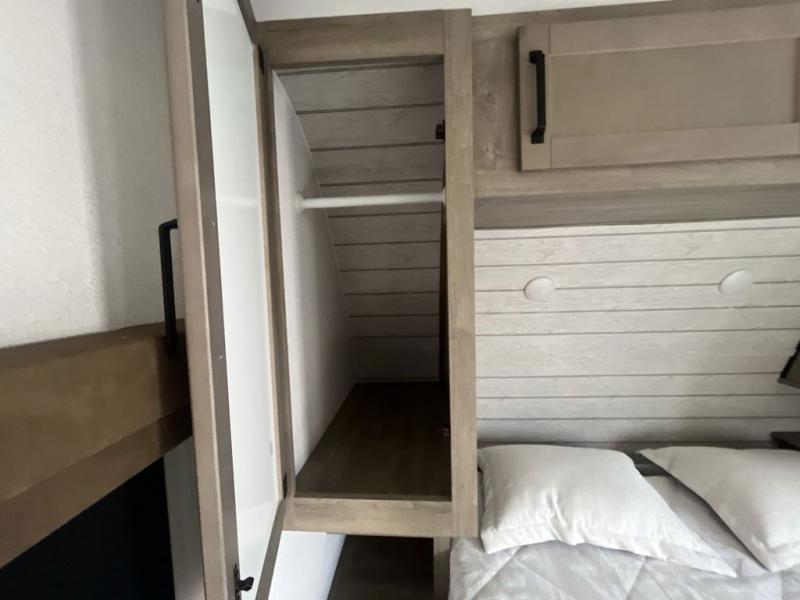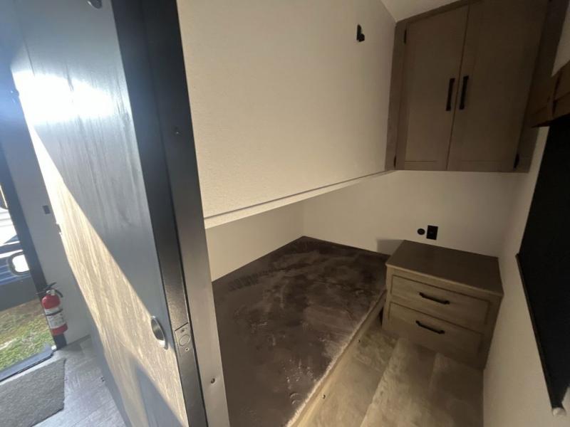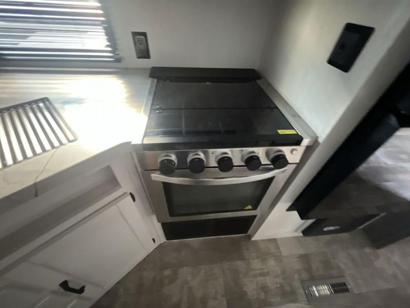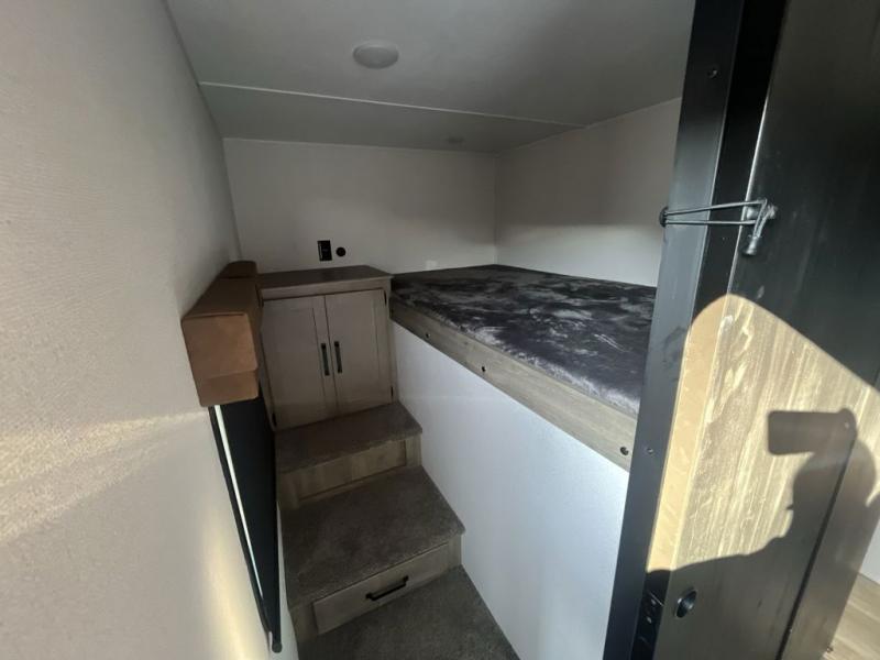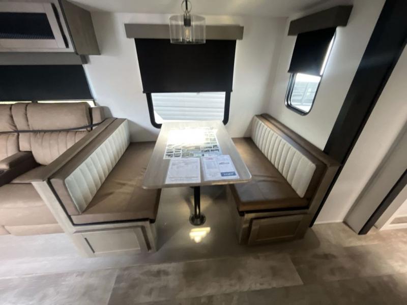 This travel trailer is perfect for camping with a larger group of friends or if you have older kids since there are two private bunkrooms! Each room includes a bunk bed and storage space for clothes, shoes, and more. You'll enjoy your own space up front in the master bedroom that includes a queen bed, dual shirt closets, and one of the dual entry doors to the unit for added convenience. Everyone can come together in the combined living area and kitchen that includes a large slide out with a sofa and booth dinette, plus there is a fireplace to make this space feel more like home. A full kitchen inside lets you create home-cooked meals each day, and you can choose to add the optional micro kitchen with a griddle for a pancake breakfast outdoors!