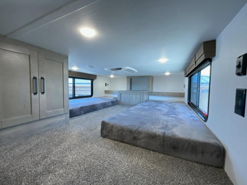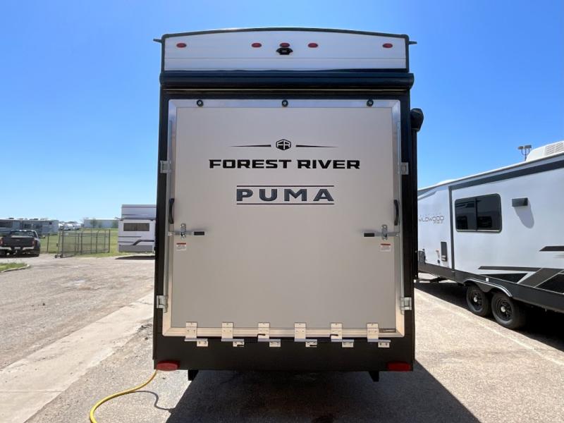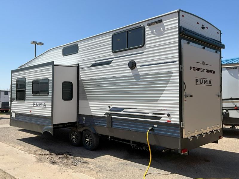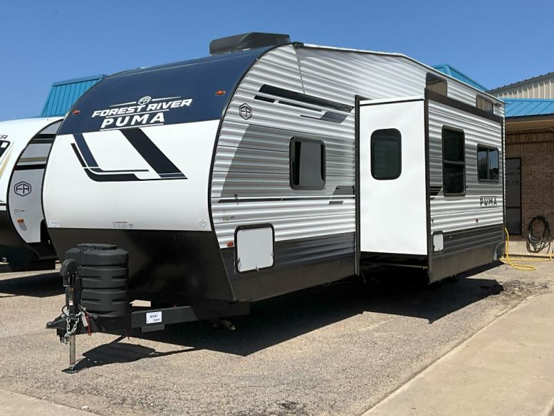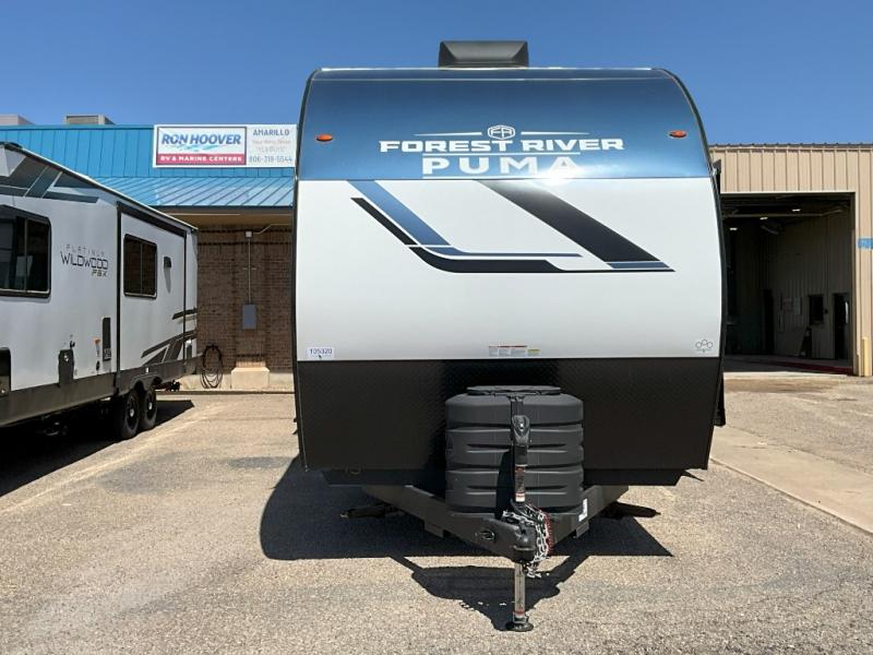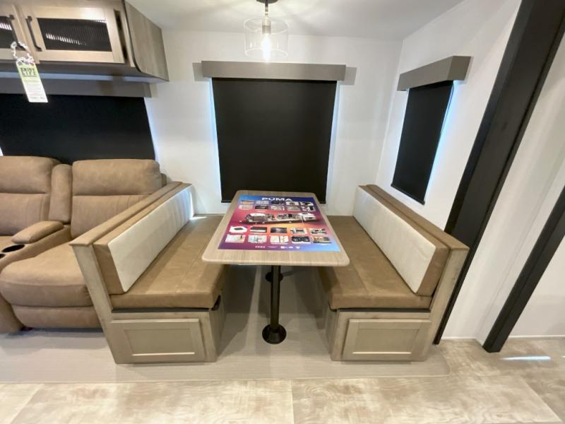 The ultimate travel trailer is found in this Puma! There is ample space to move about thanks to the large slide out and dual entry doors, plus there is a rear patio where you can entertain guests and relax in your camp chairs! The full bath includes a large linen closet to keep bath necessities stocked, and above this room is where you'll find the loft with two bunk mats. The loft looks out on the main living area and kitchen, where you can relax on the sofa, play a game at the booth dinette, and make dinner in the full kitchen. And a front private bedroom provides you with your own space at night!