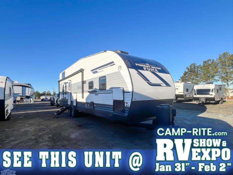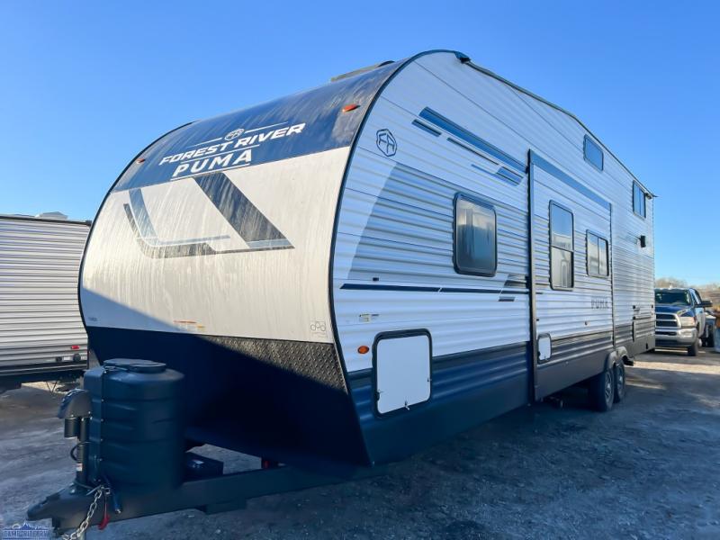 The ultimate travel trailer is found in this Puma! There is ample space to move about thanks to the large slide out and dual entry doors, plus there is a rear patio where you can entertain guests and relax in your camp chairs! The full bath includes a large linen closet to keep bath necessities stocked, and above this room is where you'll find the loft with two bunk mats. The loft looks out on the main living area and kitchen, where you can relax on the sofa, play a game at the booth dinette, and make dinner in the full kitchen. And a front private bedroom provides you with your own space at night!