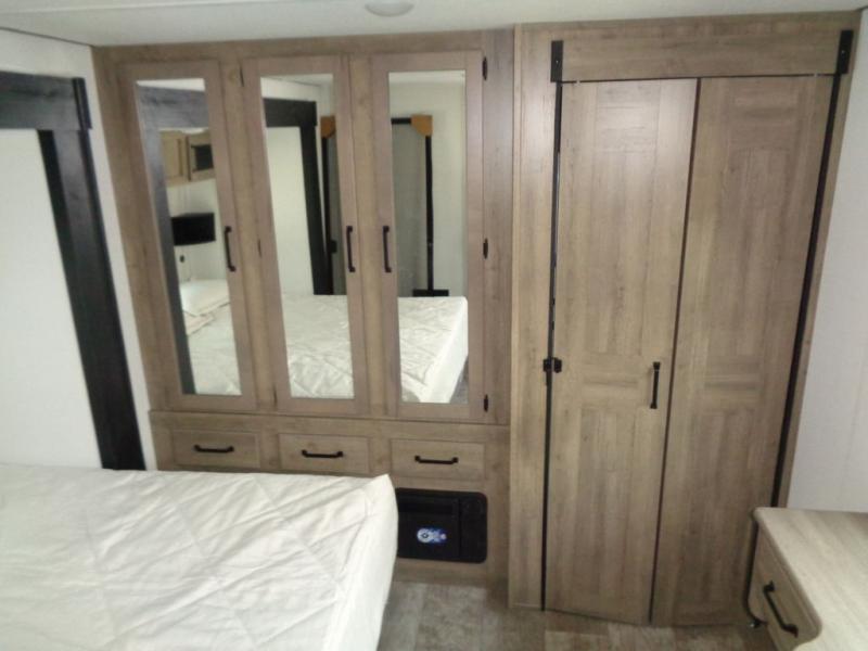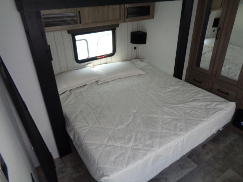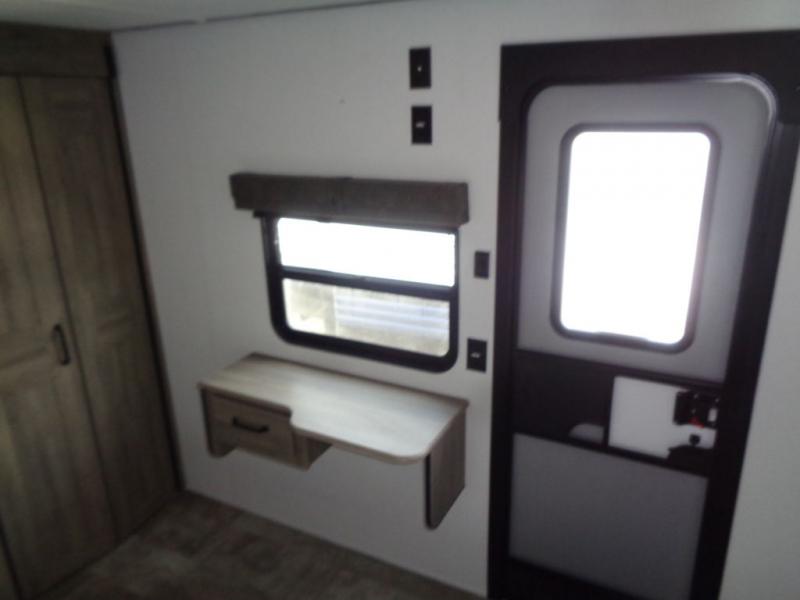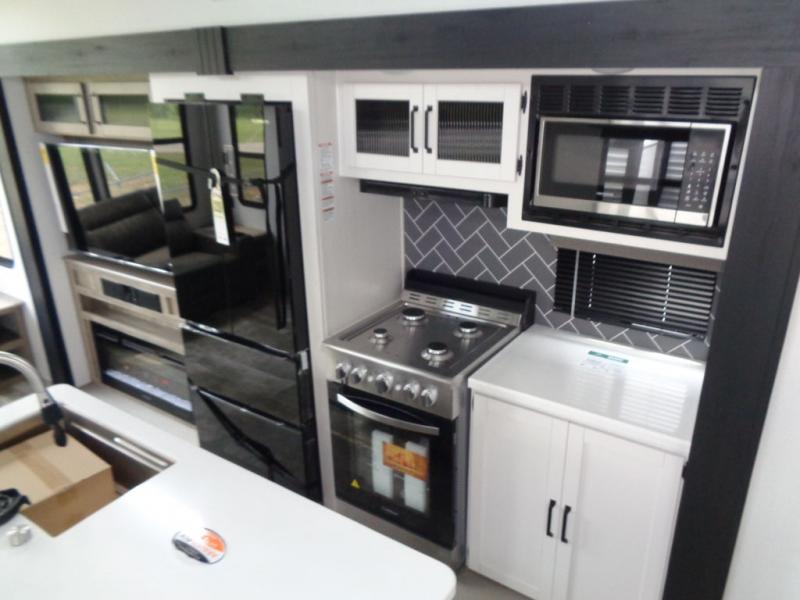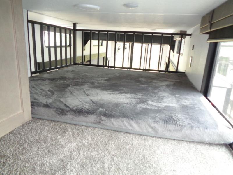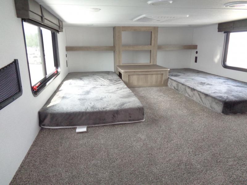 Wherever your destination may be, you can be sure to enjoy it to the fullest with this trailer in tow! With two entry doors, you can enter in through the front private bedroom or the main living area. The bedroom includes a king bed slide out, a desktop if you need to work from home, and a wardrobe/closet to keep your clothes organized. There is also a closet with the option to add washer and dryer prep. Just outside this room are steps that lead to the large loft area with a 58" x 58" bunk mat and a cabinet on one side, plus two 32" x 80" bunk mats on the other. There is also a front cabinet and a wardrobe/closet for plenty of storage space. Once you've headed back downstairs, you can relax on the dual recliners, rear sofa, or free-standing table with a bench and two seats. And the chef of your group will love the kitchen with its residential style refrigerator and pantry, kitchen island, and four burner cooktop!