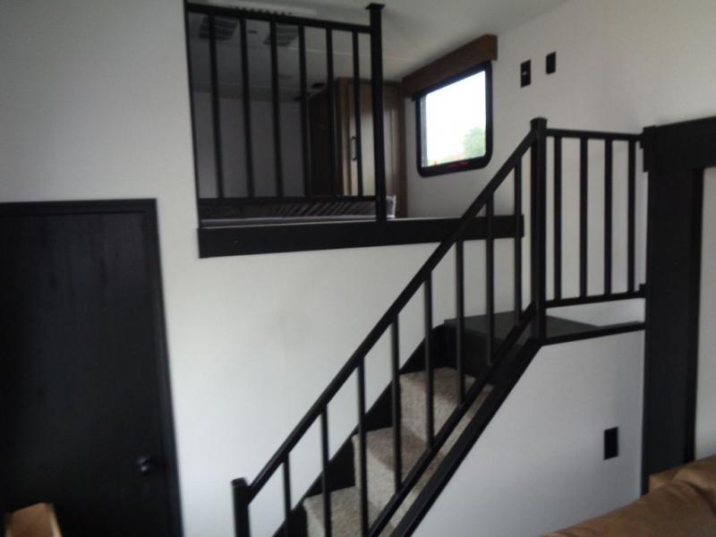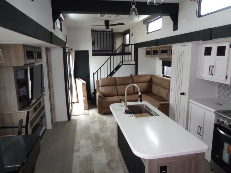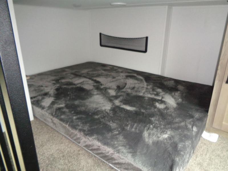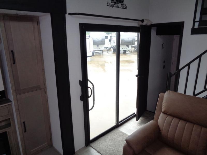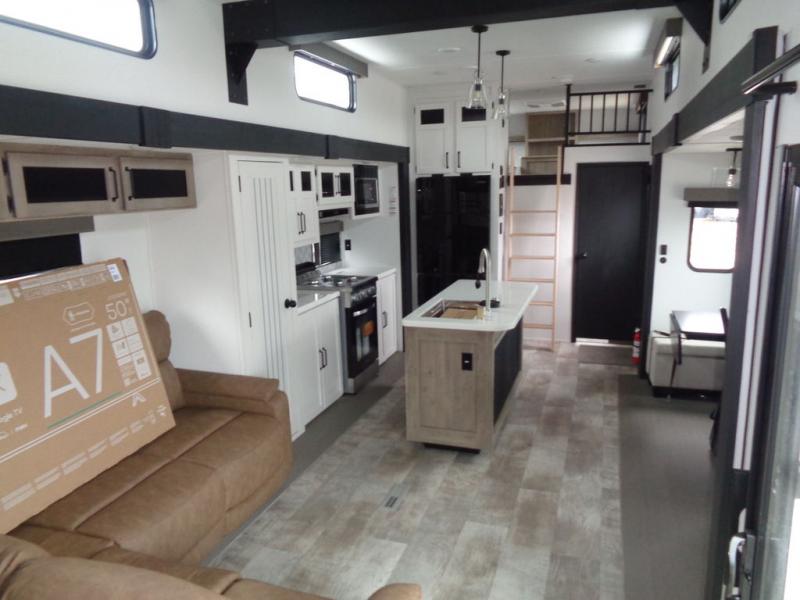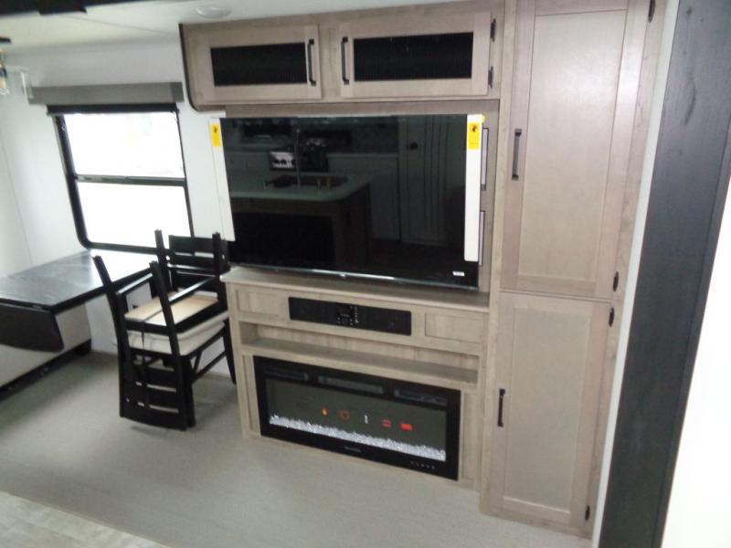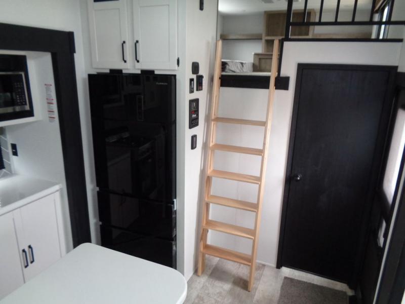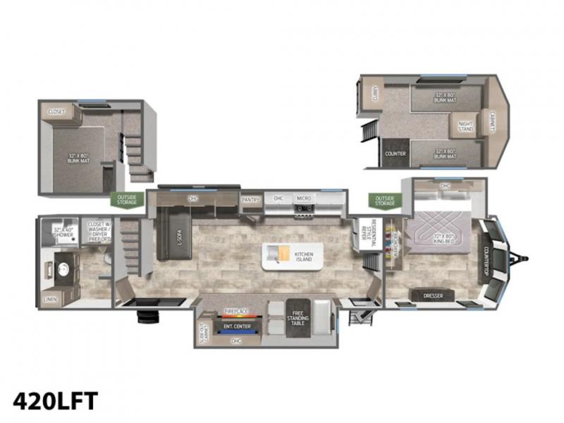 Head to your favorite spots with this destination trailer! With two entry doors, you can easily enter or exit the unit. The front private bedroom includes a king bed slide out, a wardrobe and dresser to keep your clothes organized, plus a countertop for your books or jewelry. Just outside this room is the ladder that leads to the large loft area with two 32" x 80" bunk mats, a cubby, a counter, a nightstand, and cabinets. Once you've headed back downstairs, you can relax on the L-shaped sofa across from the entertainment center with a fireplace and slide-out cabinet or the free-standing table with a bench and two seats. And the chef of your group will love the kitchen with its residential style refrigerator and pantry, kitchen island, and four burner cooktop. The full rear bathroom not only has a 32" x 40" shower with a seat to freshen up in and a closet prepped to add the optional washer and dryer, but is also below the second loft with a 32" x 80" bunk mat and closet for storage!