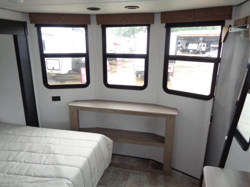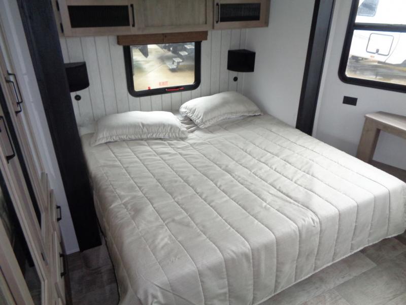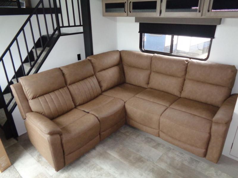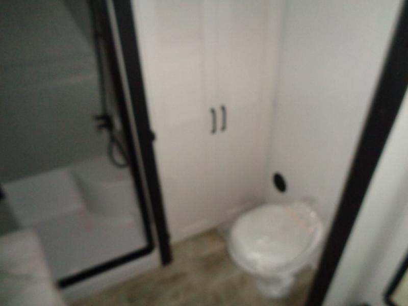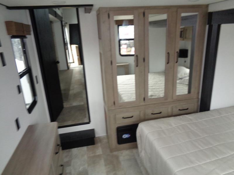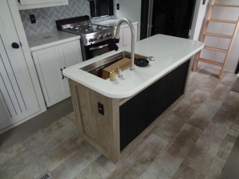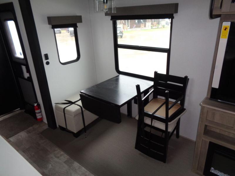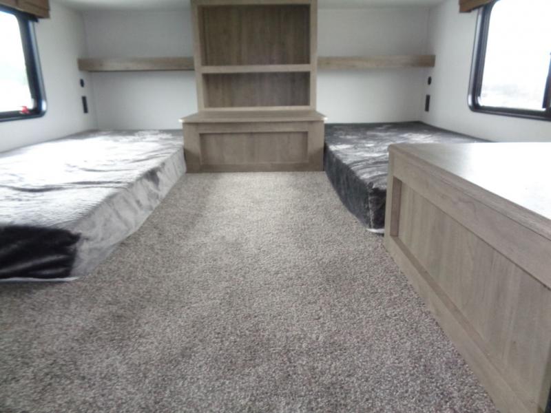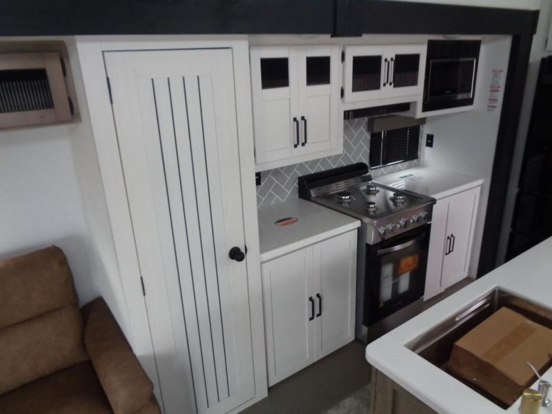 Head to your favorite spots with this destination trailer! With two entry doors, you can easily enter or exit the unit. The front private bedroom includes a king bed slide out, a wardrobe and dresser to keep your clothes organized, plus a countertop for your books or jewelry. Just outside this room is the ladder that leads to the large loft area with two 32" x 80" bunk mats, a cubby, a counter, a nightstand, and cabinets. Once you've headed back downstairs, you can relax on the L-shaped sofa across from the entertainment center with a fireplace and slide-out cabinet or the free-standing table with a bench and two seats. And the chef of your group will love the kitchen with its residential style refrigerator and pantry, kitchen island, and four burner cooktop. The full rear bathroom not only has a 32" x 40" shower with a seat to freshen up in and a closet prepped to add the optional washer and dryer, but is also below the second loft with a 32" x 80" bunk mat and closet for storage!