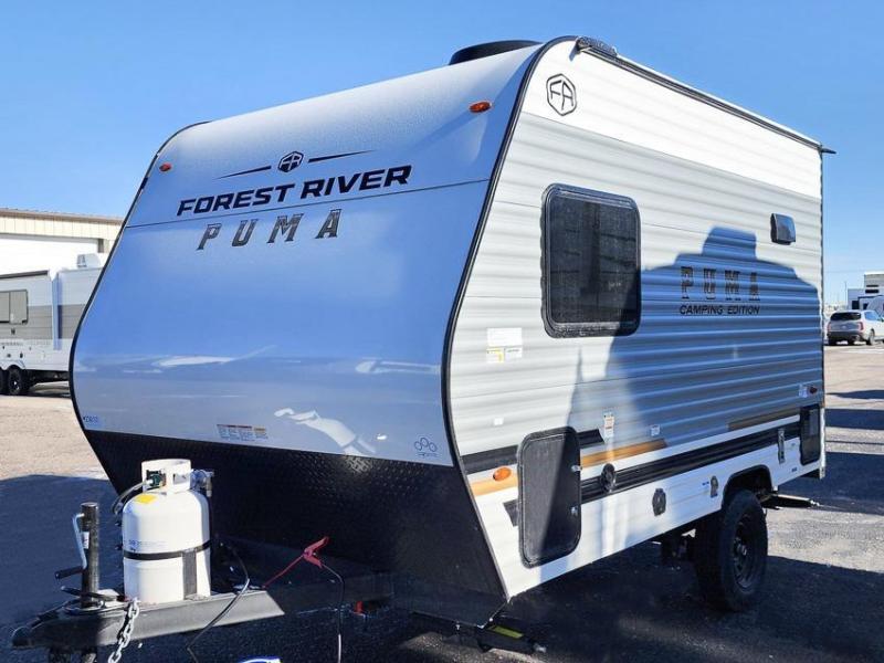 The Puma Camping Edition by Palomino offer an affordable travel trailer for rookie campers or seasoned RVers! They are built with 5/8" tongue and groove plywood flooring and a front diamond plate for added protection. There are also exterior clamp style door latches, back up camera prep, and 20 lb. LP bottles. Head inside to find Thermofoil countertops with a smooth drop edge, bedroom USB ports and outlets, and a GE appliance and kitchen package.
