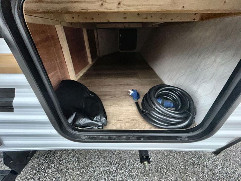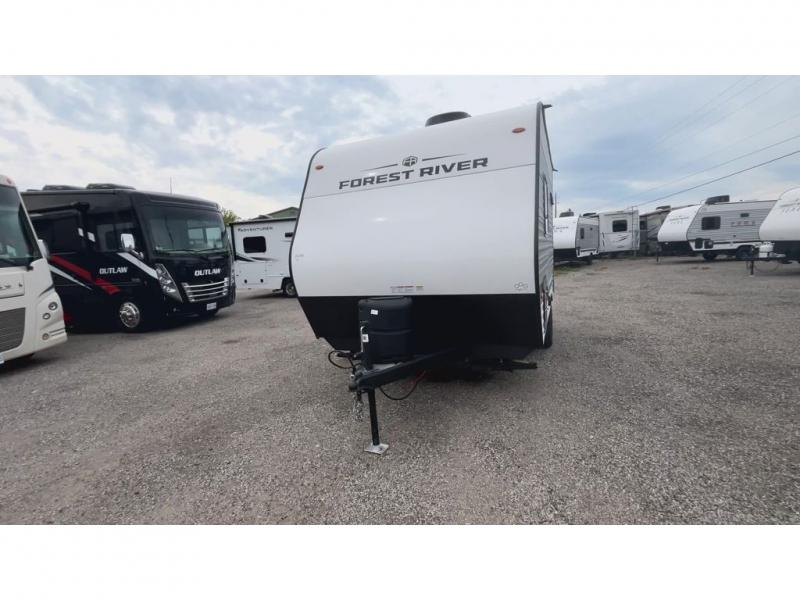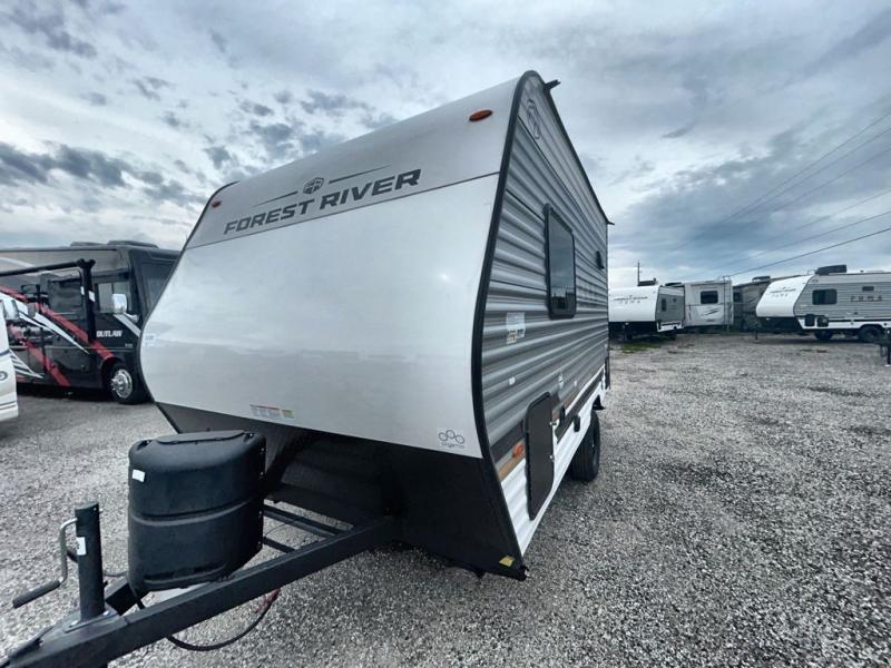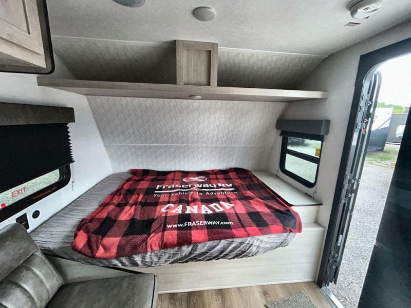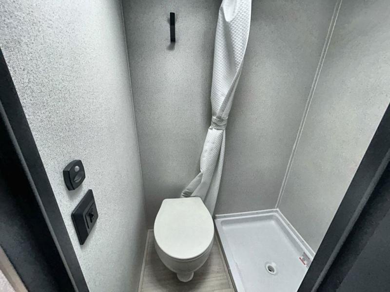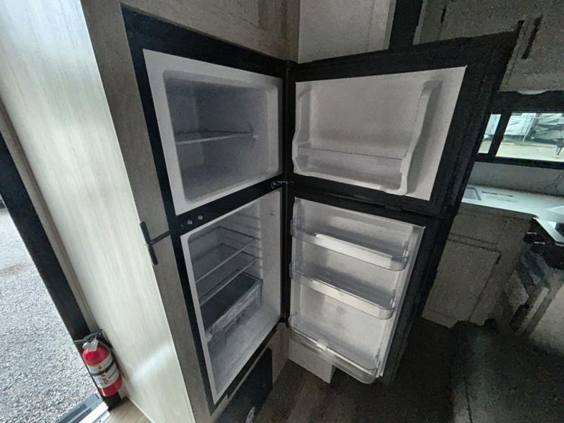 It will be so easy to enjoy camping trips in this single axle travel trailer! There is an RV queen bed up front with flip-up storage at the foot of the bed for your belongings, and any additional guests can sleep on the sofa. A full kitchen includes a stainless two burner cooktop and stainless microwave to cook meals each day, and the 4.3 cu. ft. 12V black glass refrigerator will keep your food fresh. And a private bath with a toilet and shower will let you freshen up without having to use the camp's facilities!