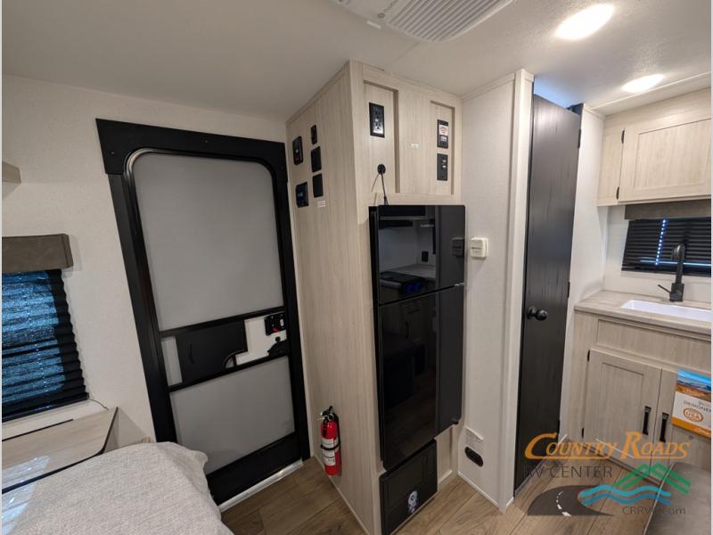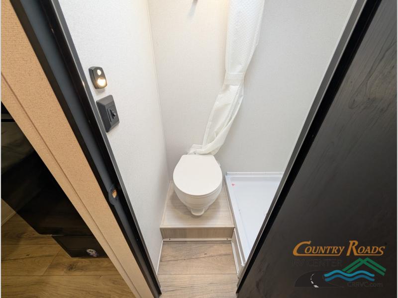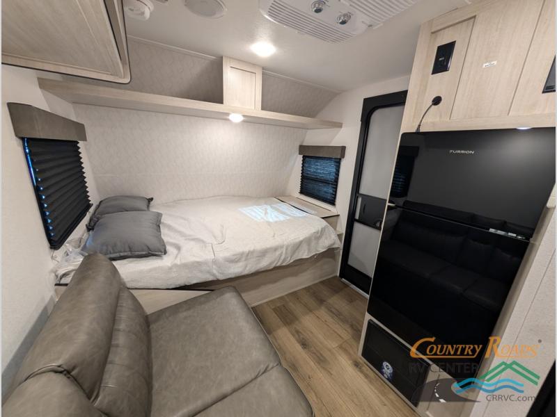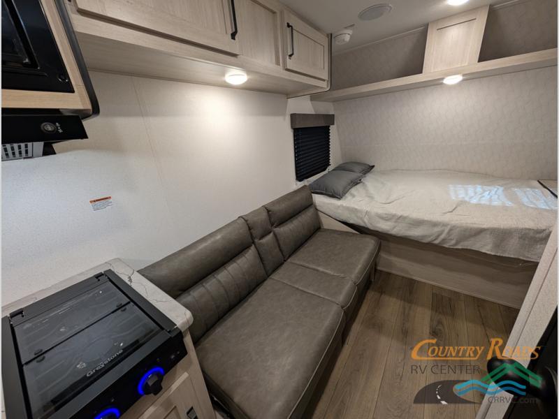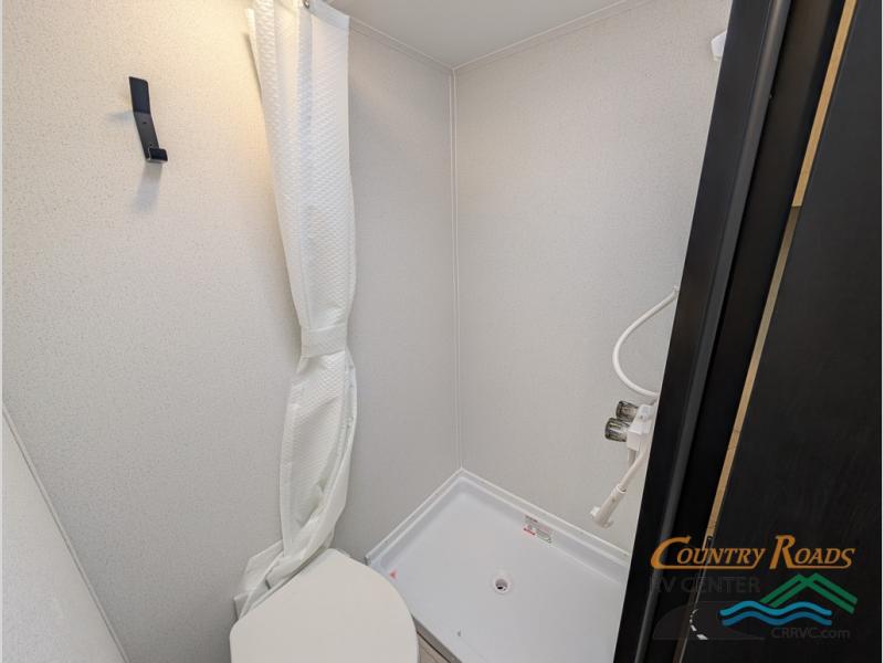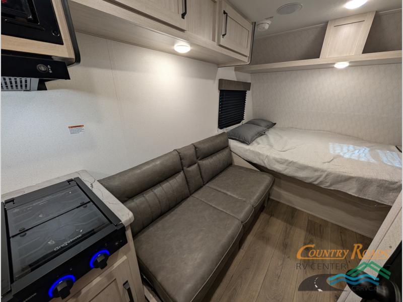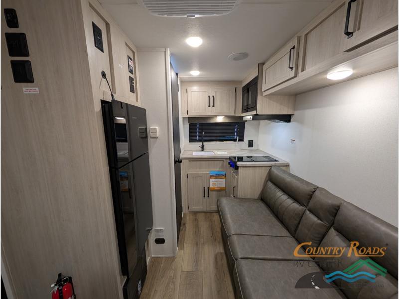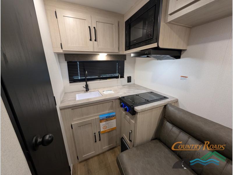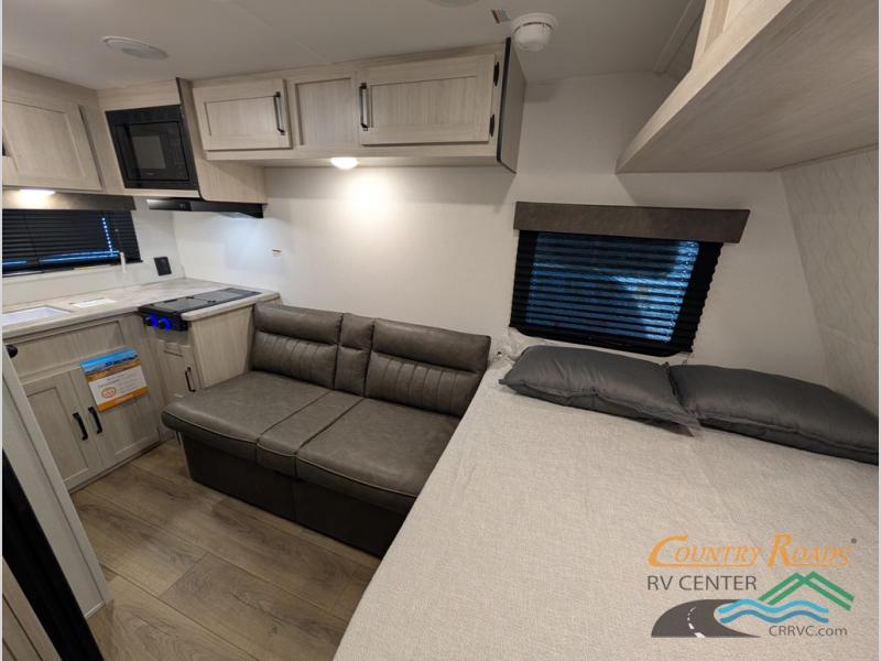 It will be so easy to enjoy camping trips in this single axle travel trailer! There is an RV queen bed up front with flip-up storage at the foot of the bed for your belongings, and any additional guests can sleep on the sofa. A full kitchen includes a stainless two burner cooktop and stainless microwave to cook meals each day, and the 4.3 cu. ft. 12V black glass refrigerator will keep your food fresh. And a private bath with a toilet and shower will let you freshen up without having to use the camp's facilities!