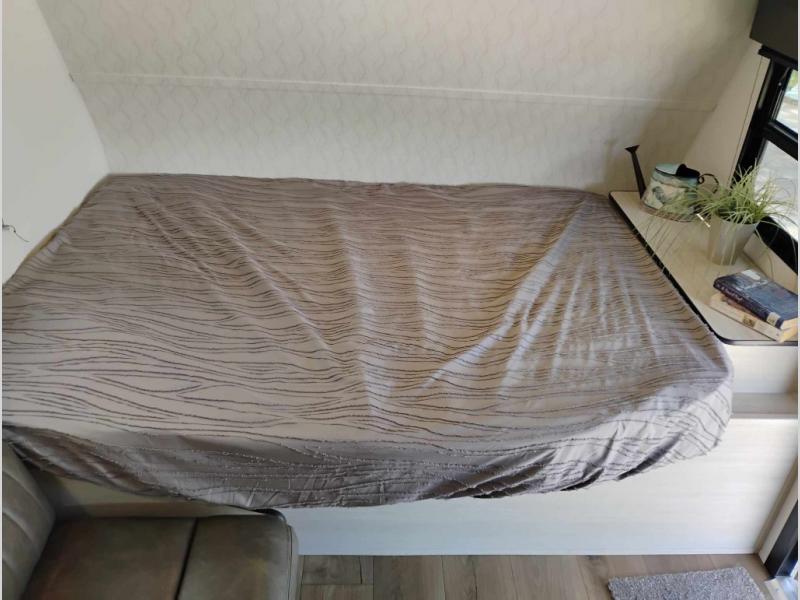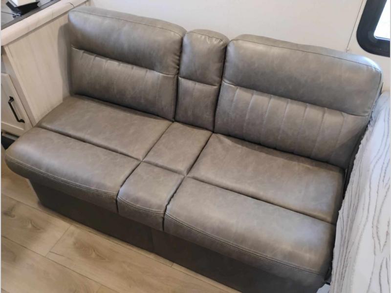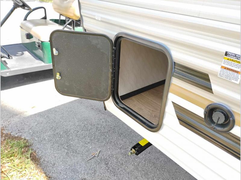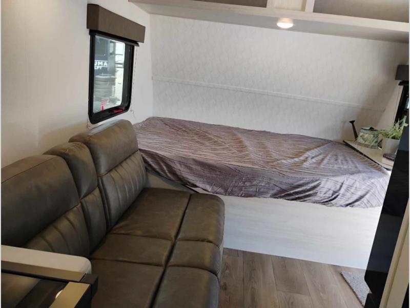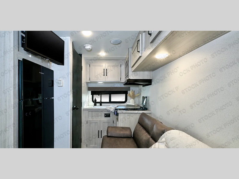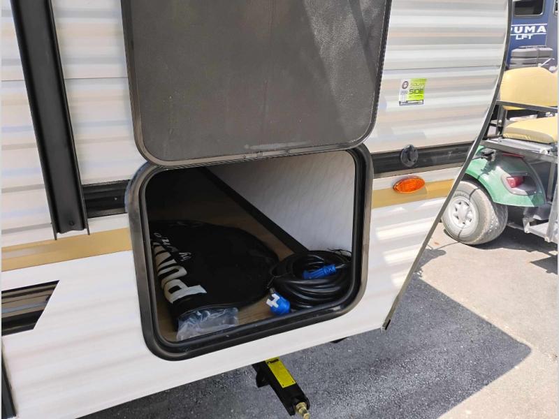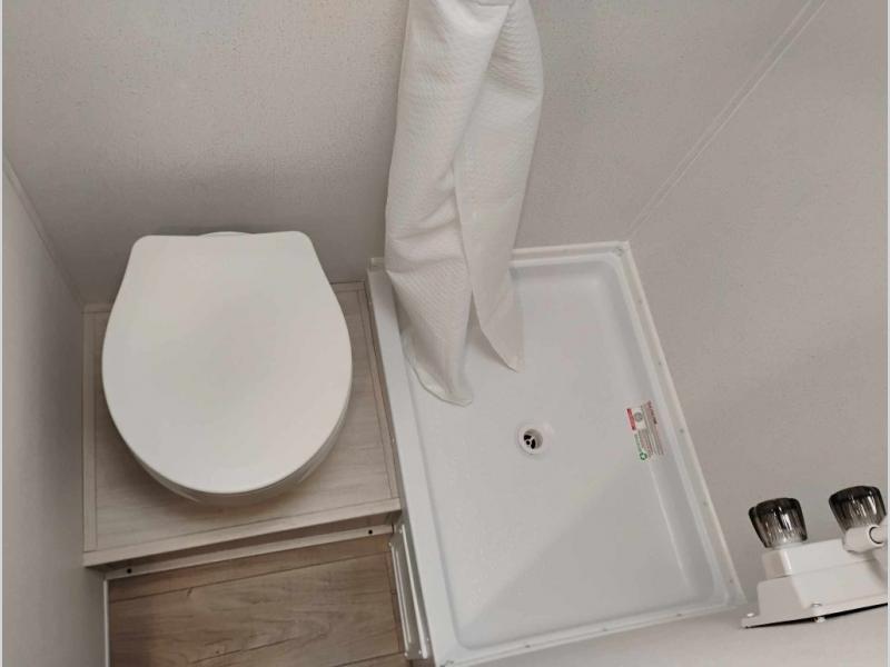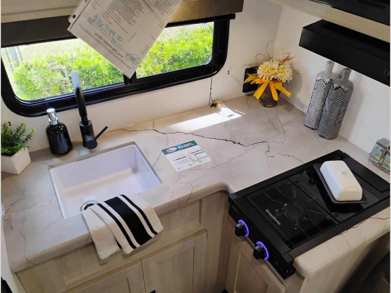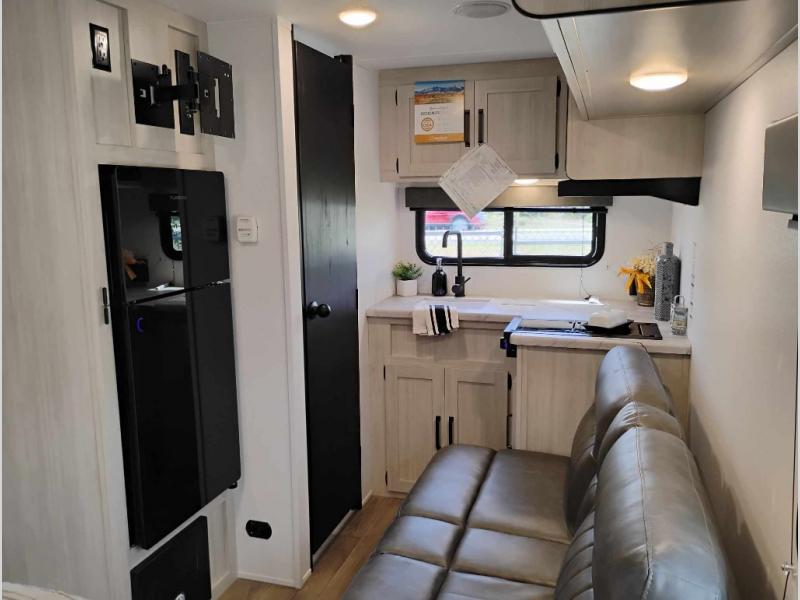 It will be so easy to enjoy camping trips in this single axle travel trailer! There is an RV queen bed up front with flip-up storage at the foot of the bed for your belongings, and any additional guests can sleep on the sofa. A full kitchen includes a stainless two burner cooktop and stainless microwave to cook meals each day, and the 4.3 cu. ft. 12V black glass refrigerator will keep your food fresh. And a private bath with a toilet and shower will let you freshen up without having to use the camp's facilities!