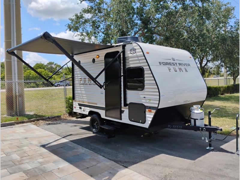 The Puma Camping Edition by Palomino offer an affordable travel trailer for rookie campers or seasoned RVers! They are built with 5/8" tongue and groove plywood flooring and a front diamond plate for added protection. There are also exterior clamp style door latches, back up camera prep, and 20 lb. LP bottles. Head inside to find Thermofoil countertops with a smooth drop edge, bedroom USB ports and outlets, and a GE appliance and kitchen package.