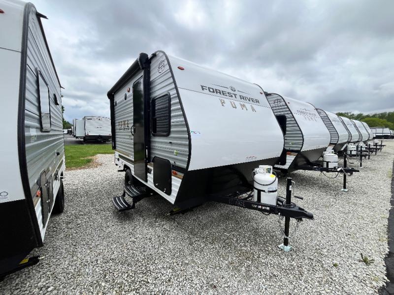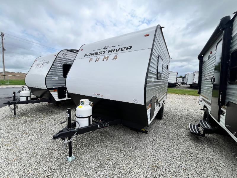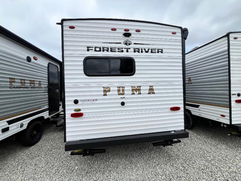 The Puma Camping Edition by Palomino offer an affordable travel trailer for rookie campers or seasoned RVers! They are built with 5/8" tongue and groove plywood flooring and a front diamond plate for added protection. There are also exterior clamp style door latches, back up camera prep, and 20 lb. LP bottles. Head inside to find Thermofoil countertops with a smooth drop edge, bedroom USB ports and outlets, and a GE appliance and kitchen package.