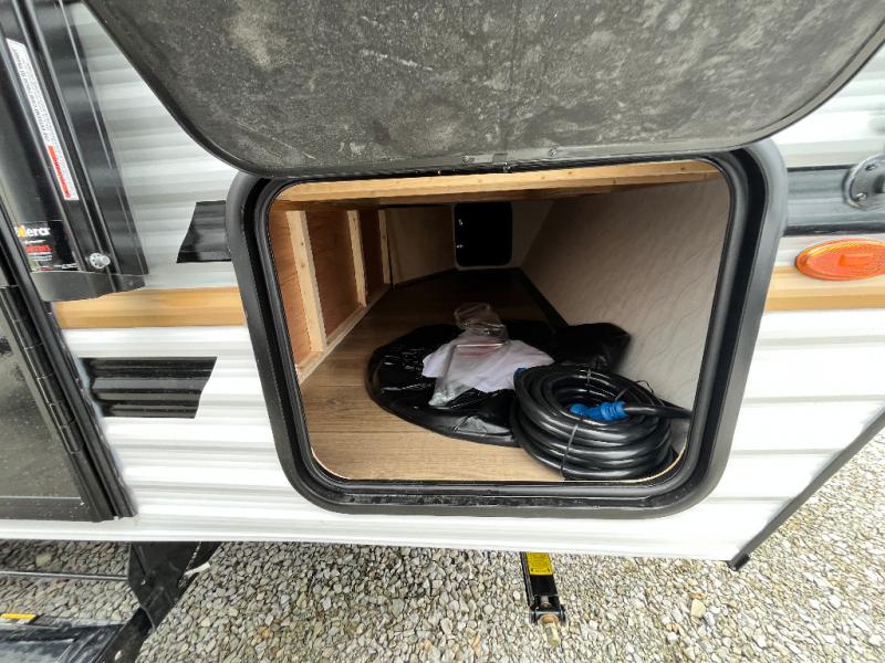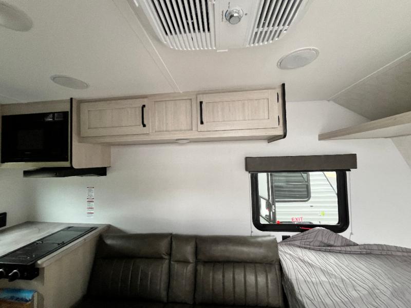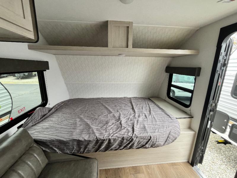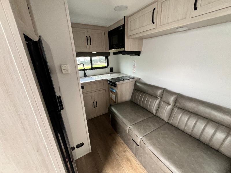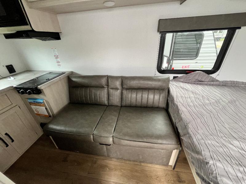 It will be so easy to enjoy camping trips in this single axle travel trailer! There is an RV queen bed up front with flip-up storage at the foot of the bed for your belongings, and any additional guests can sleep on the sofa. A full kitchen includes a stainless two burner cooktop and stainless microwave to cook meals each day, and the 4.3 cu. ft. 12V black glass refrigerator will keep your food fresh. And a private bath with a toilet and shower will let you freshen up without having to use the camp's facilities!