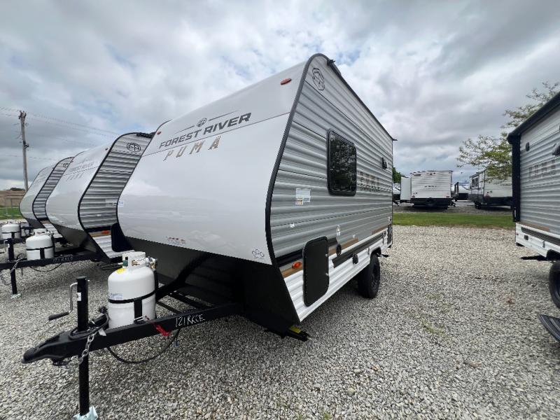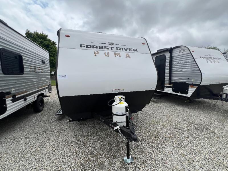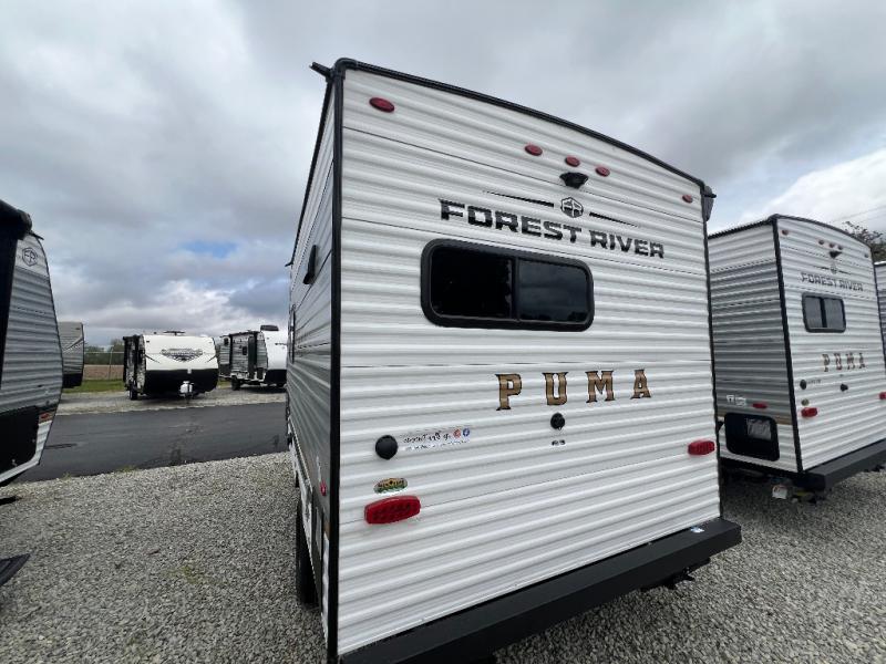 The Puma Camping Edition by Palomino offer an affordable travel trailer for rookie campers or seasoned RVers! They are built with 5/8" tongue and groove plywood flooring and a front diamond plate for added protection. There are also exterior clamp style door latches, back up camera prep, and 20 lb. LP bottles. Head inside to find Thermofoil countertops with a smooth drop edge, bedroom USB ports and outlets, and a GE appliance and kitchen package.