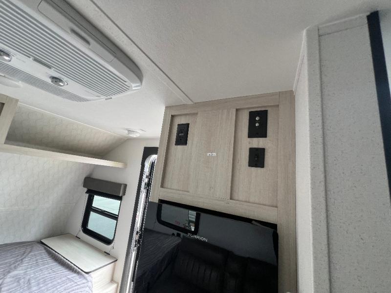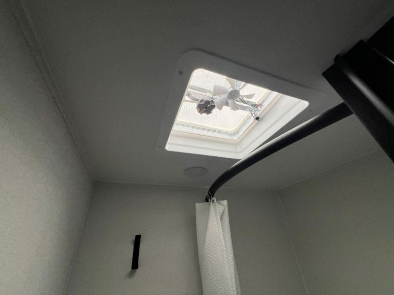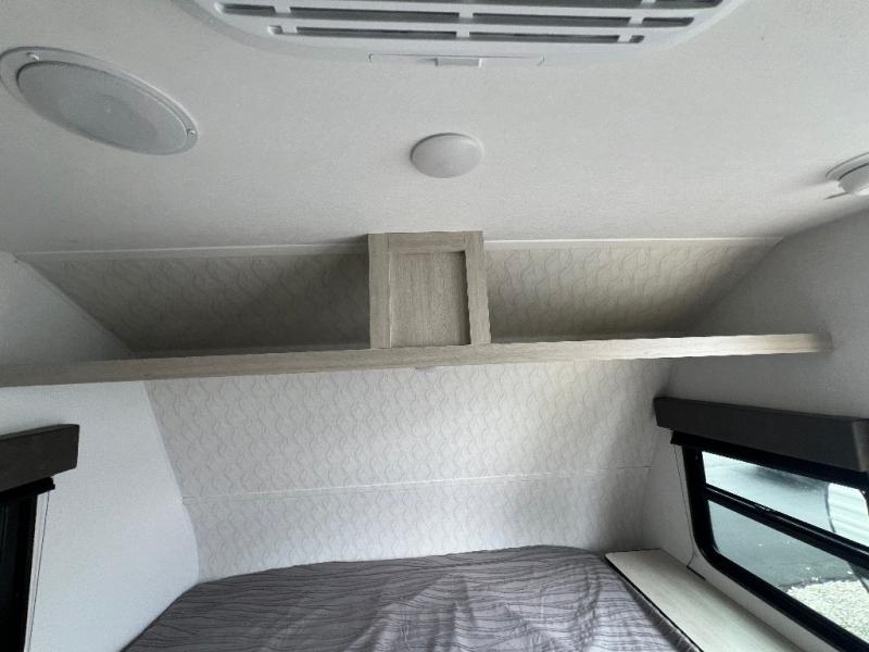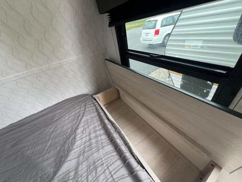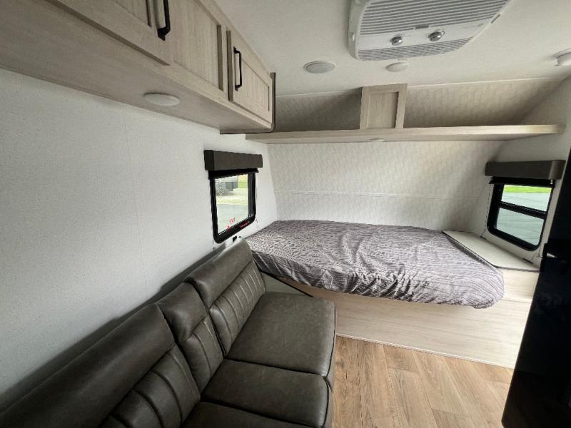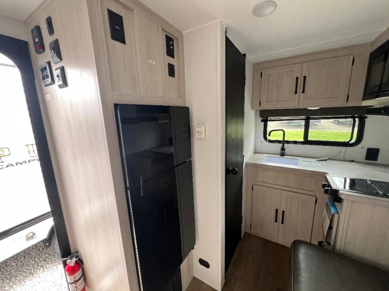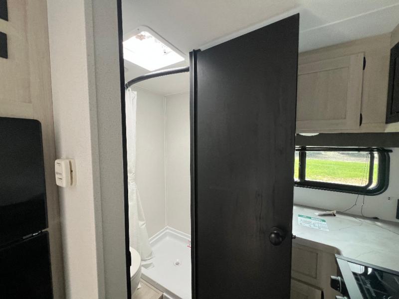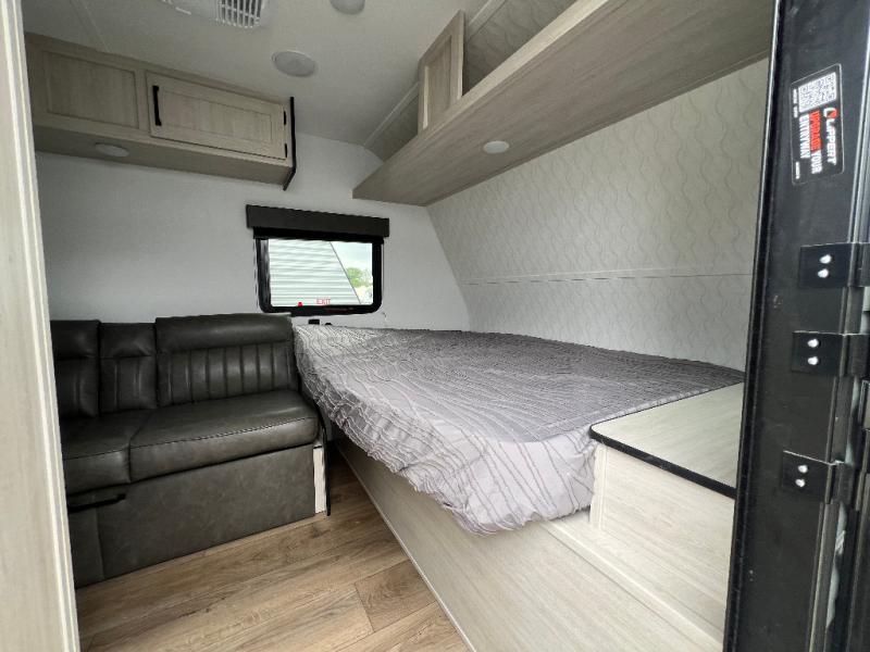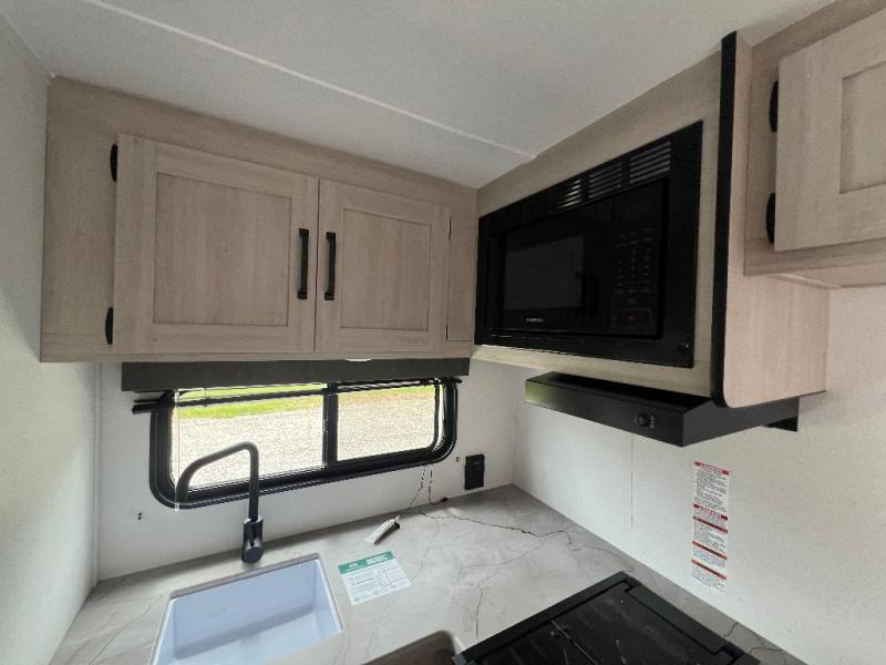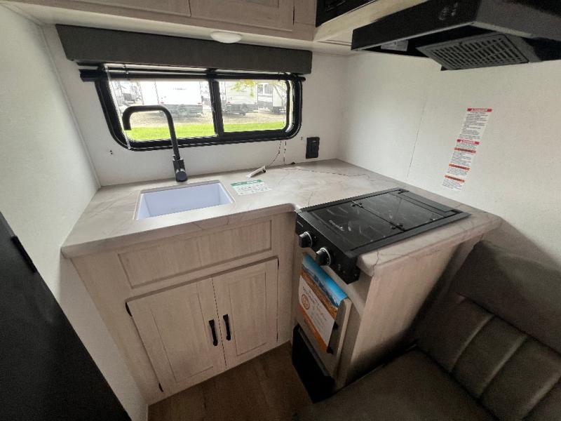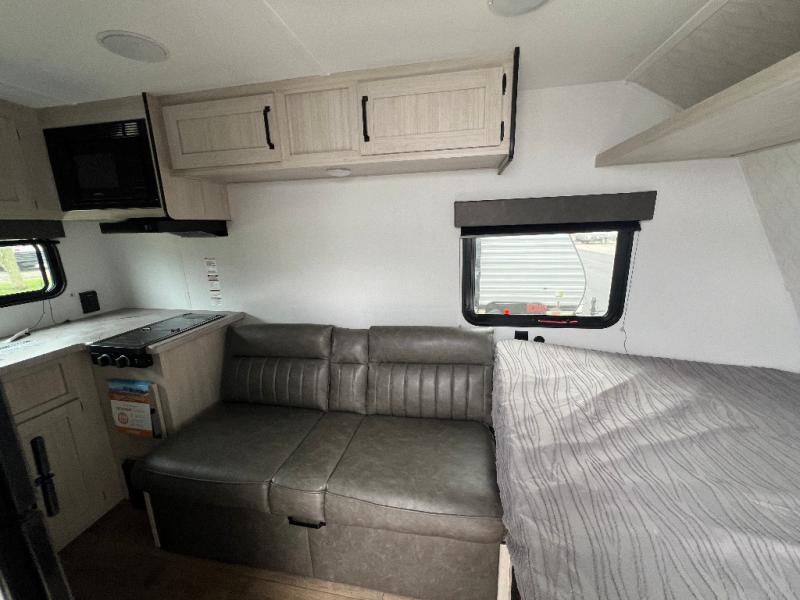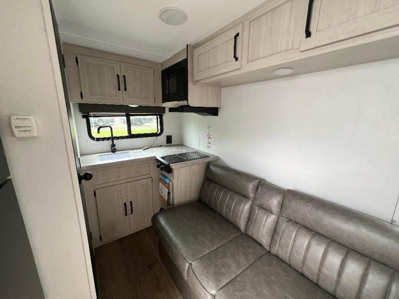 It will be so easy to enjoy camping trips in this single axle travel trailer! There is an RV queen bed up front with flip-up storage at the foot of the bed for your belongings, and any additional guests can sleep on the sofa. A full kitchen includes a stainless two burner cooktop and stainless microwave to cook meals each day, and the 4.3 cu. ft. 12V black glass refrigerator will keep your food fresh. And a private bath with a toilet and shower will let you freshen up without having to use the camp's facilities!