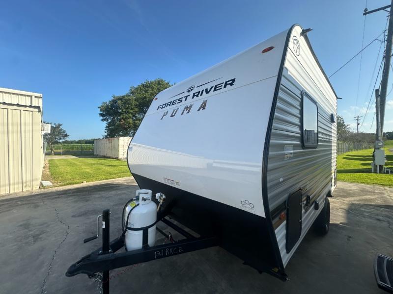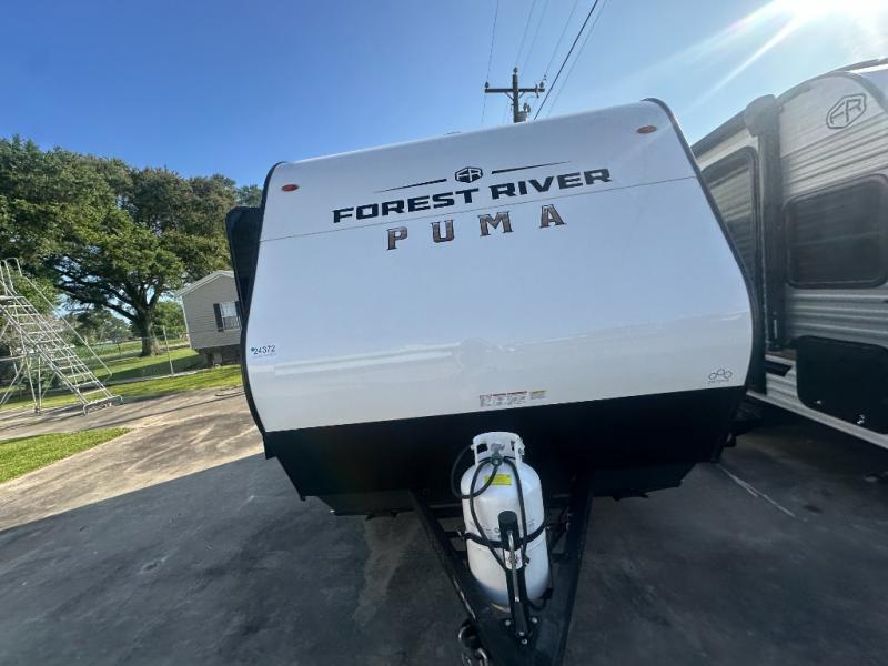 The Puma Camping Edition by Palomino offer an affordable travel trailer for rookie campers or seasoned RVers! They are built with 5/8" tongue and groove plywood flooring and a front diamond plate for added protection. There are also exterior clamp style door latches, back up camera prep, and 20 lb. LP bottles. Head inside to find Thermofoil countertops with a smooth drop edge, bedroom USB ports and outlets, and a GE appliance and kitchen package.