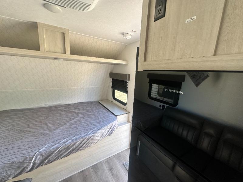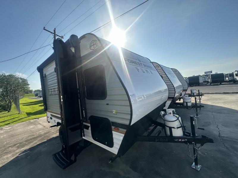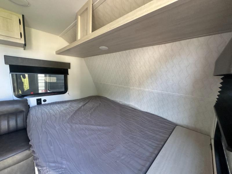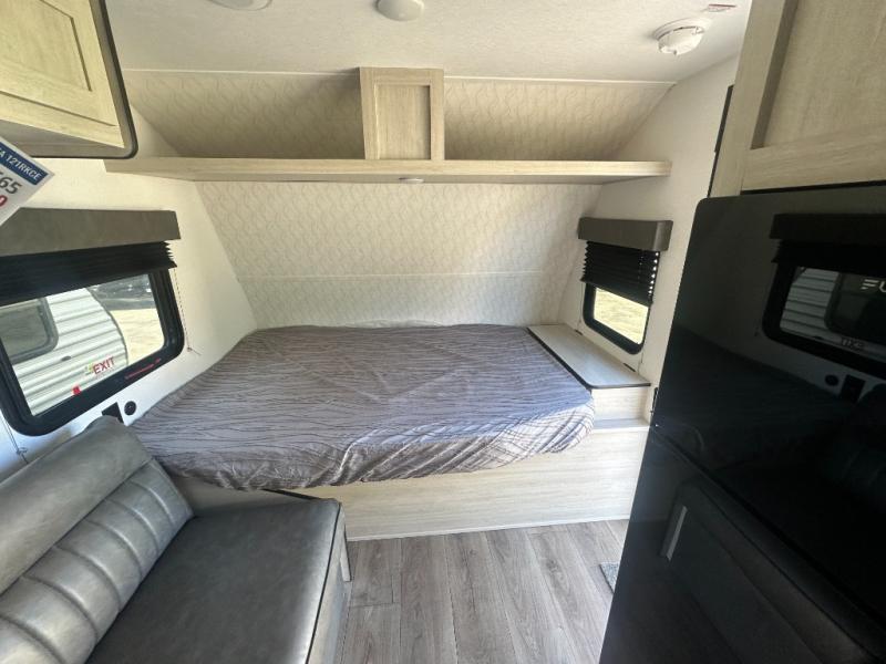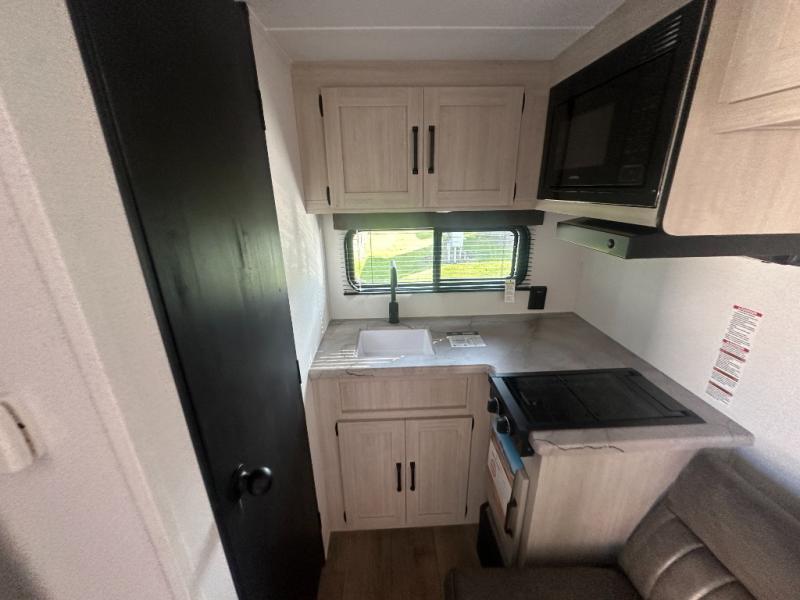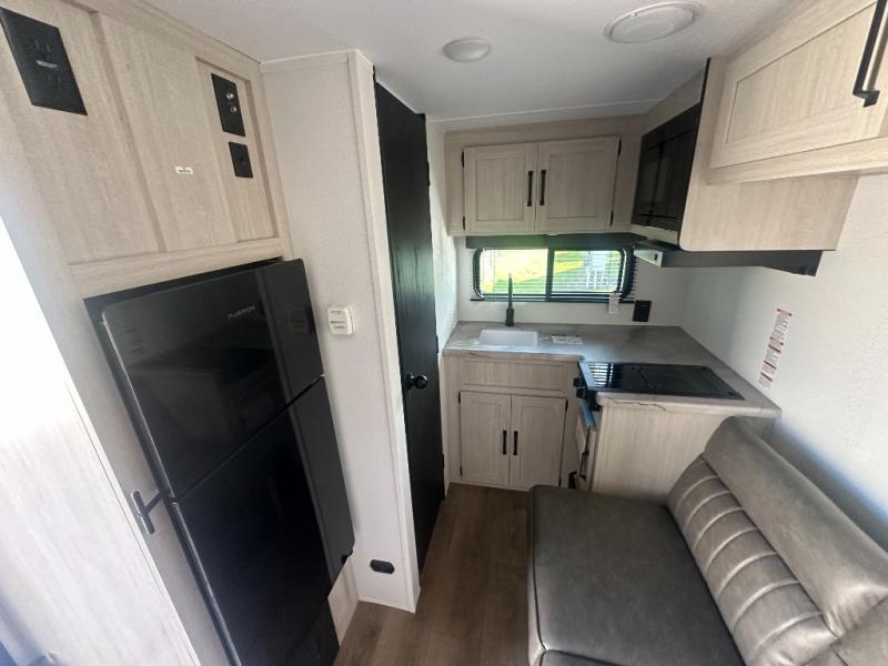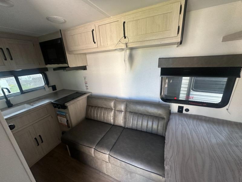 It will be so easy to enjoy camping trips in this single axle travel trailer! There is an RV queen bed up front with flip-up storage at the foot of the bed for your belongings, and any additional guests can sleep on the sofa. A full kitchen includes a stainless two burner cooktop and stainless microwave to cook meals each day, and the 4.3 cu. ft. 12V black glass refrigerator will keep your food fresh. And a private bath with a toilet and shower will let you freshen up without having to use the camp's facilities!