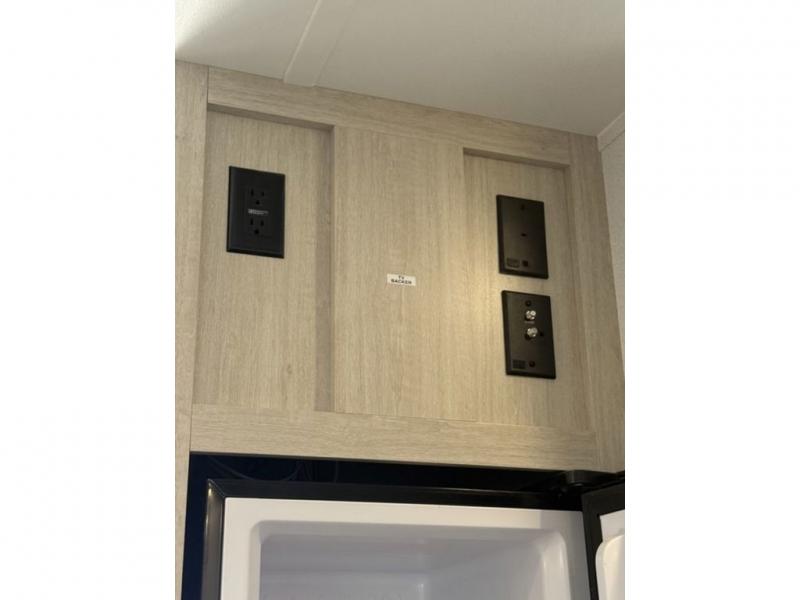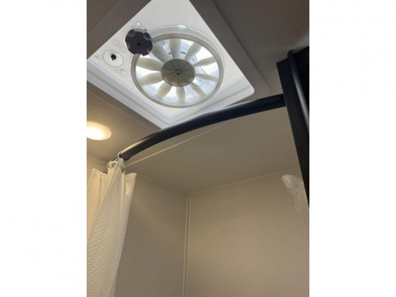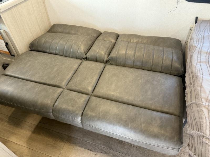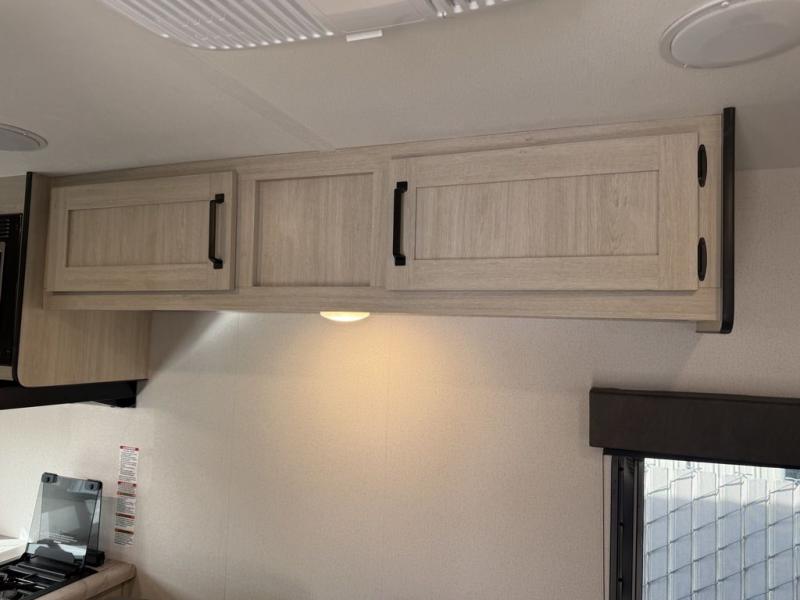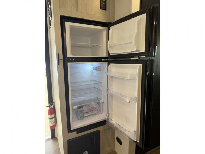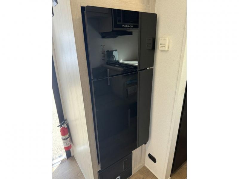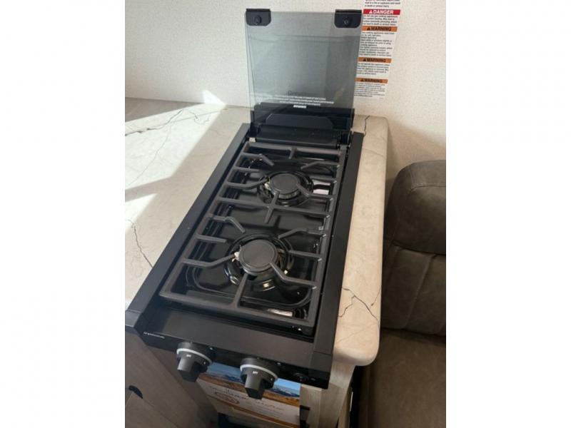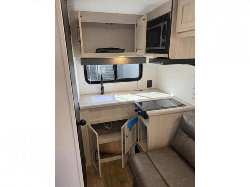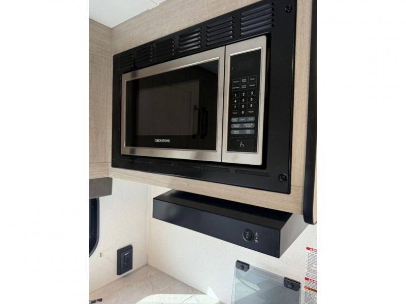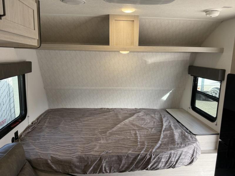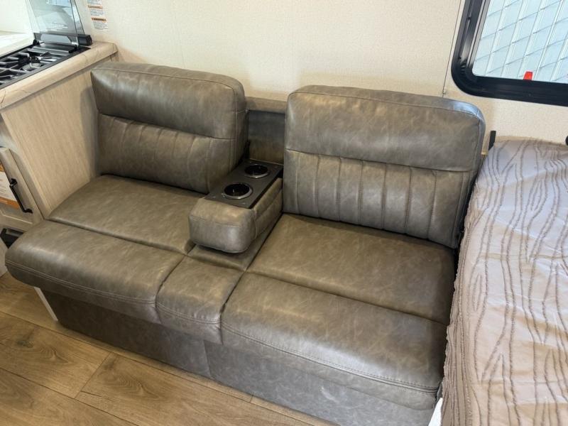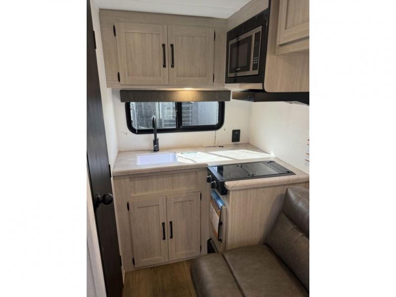 It will be so easy to enjoy camping trips in this single axle travel trailer! There is an RV queen bed up front with flip-up storage at the foot of the bed for your belongings, and any additional guests can sleep on the sofa. A full kitchen includes a stainless two burner cooktop and stainless microwave to cook meals each day, and the 4.3 cu. ft. 12V black glass refrigerator will keep your food fresh. And a private bath with a toilet and shower will let you freshen up without having to use the camp's facilities!