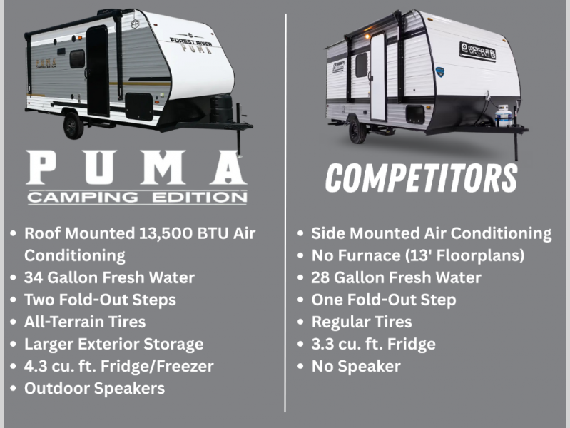 The Puma Camping Edition by Palomino offer an affordable travel trailer for rookie campers or seasoned RVers! They are built with 5/8" tongue and groove plywood flooring and a front diamond plate for added protection. There are also exterior clamp style door latches, back up camera prep, and 20 lb. LP bottles. Head inside to find Thermofoil countertops with a smooth drop edge, bedroom USB ports and outlets, and a GE appliance and kitchen package.