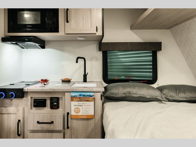 It will be so easy to enjoy camping trips in this single axle travel trailer! There is a front RV queen bed with flip-up storage at the foot of the bed for your belongings, and any additional guests can sleep on the 29" x 70" bunk beds. A full kitchen includes a stainless two burner cooktop and stainless microwave to cook meals each day, and the 4.3 cu. ft. 12V black glass refrigerator will keep your food fresh. And a private bath with a toilet and shower will let you freshen up without having to use the camp's facilities!