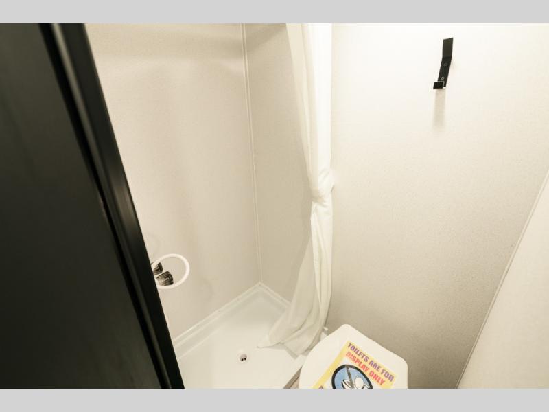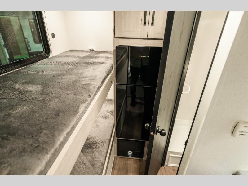 It will be so easy to enjoy camping trips in this single axle travel trailer! There is a front RV queen bed with flip-up storage at the foot of the bed for your belongings, and any additional guests can sleep on the 29" x 70" bunk beds. A full kitchen includes a stainless two burner cooktop and stainless microwave to cook meals each day, and the 4.3 cu. ft. 12V black glass refrigerator will keep your food fresh. And a private bath with a toilet and shower will let you freshen up without having to use the camp's facilities!