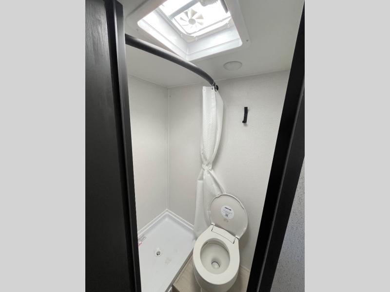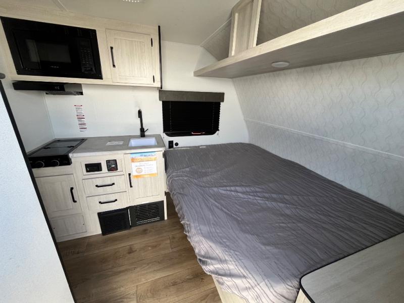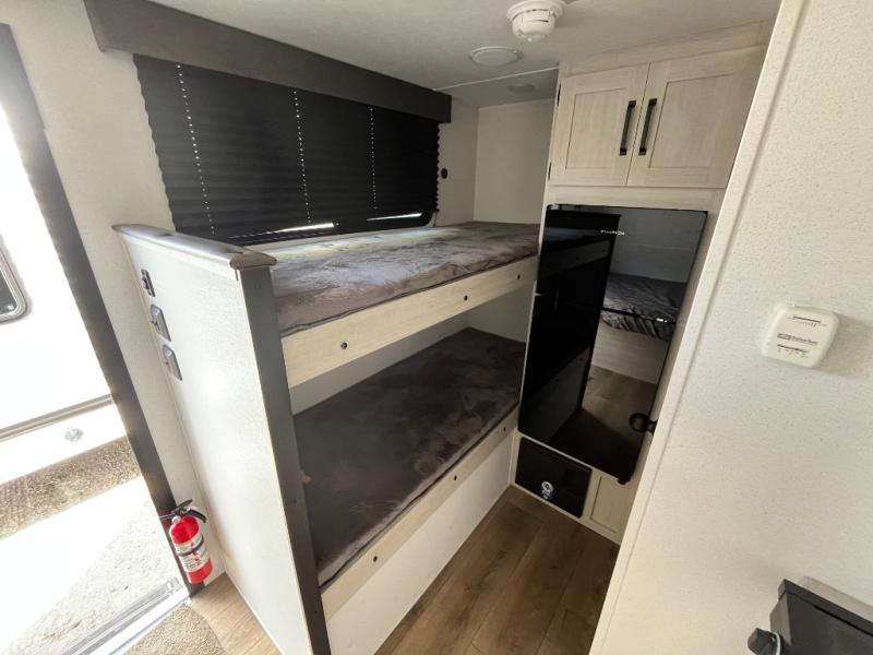 It will be so easy to enjoy camping trips in this single axle travel trailer! There is a front RV queen bed with flip-up storage at the foot of the bed for your belongings, and any additional guests can sleep on the 29" x 70" bunk beds. A full kitchen includes a stainless two burner cooktop and stainless microwave to cook meals each day, and the 4.3 cu. ft. 12V black glass refrigerator will keep your food fresh. And a private bath with a toilet and shower will let you freshen up without having to use the camp's facilities!