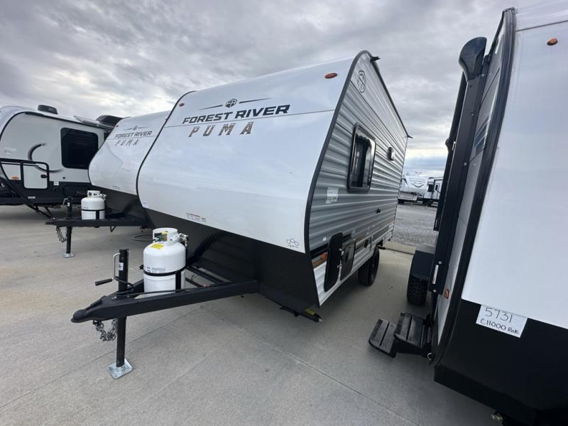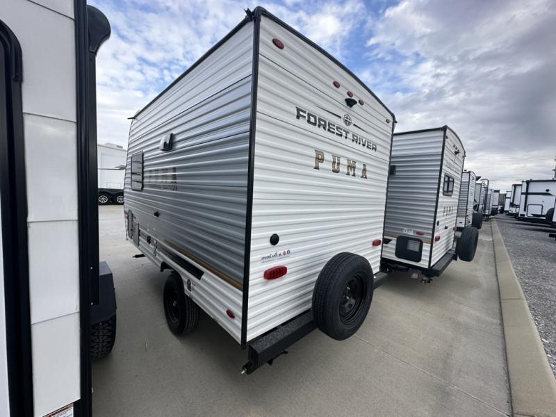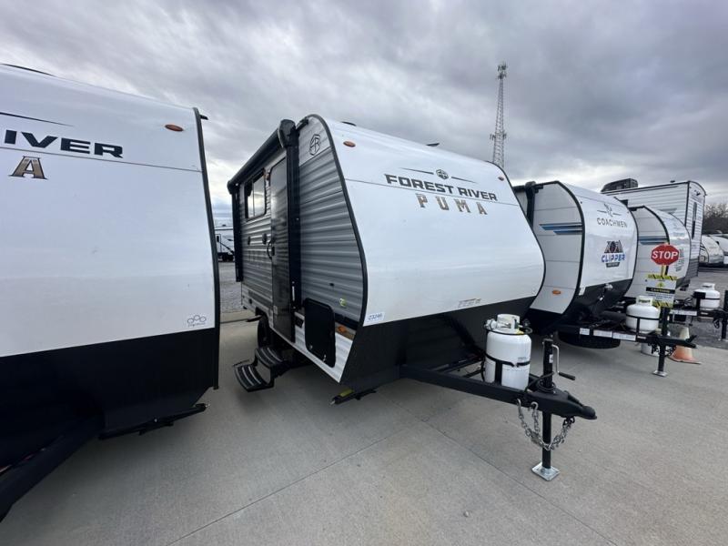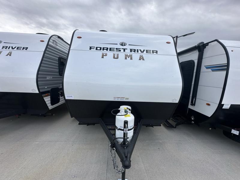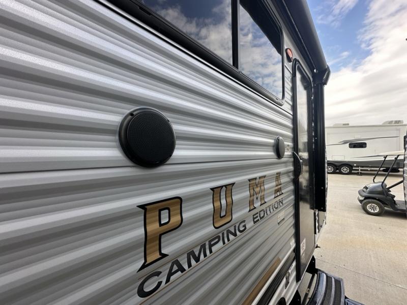 The Puma Camping Edition by Palomino offer an affordable travel trailer for rookie campers or seasoned RVers! They are built with 5/8" tongue and groove plywood flooring and a front diamond plate for added protection. There are also exterior clamp style door latches, back up camera prep, and 20 lb. LP bottles. Head inside to find Thermofoil countertops with a smooth drop edge, bedroom USB ports and outlets, and a GE appliance and kitchen package.