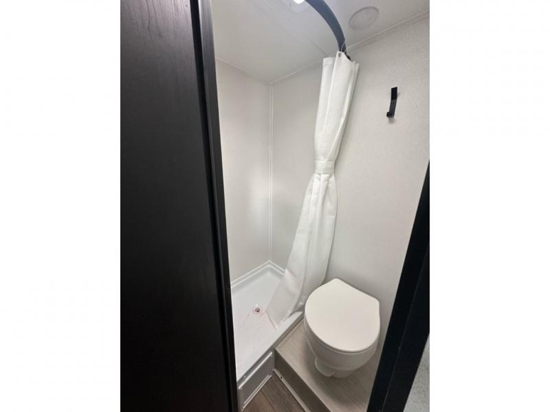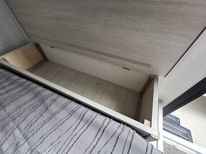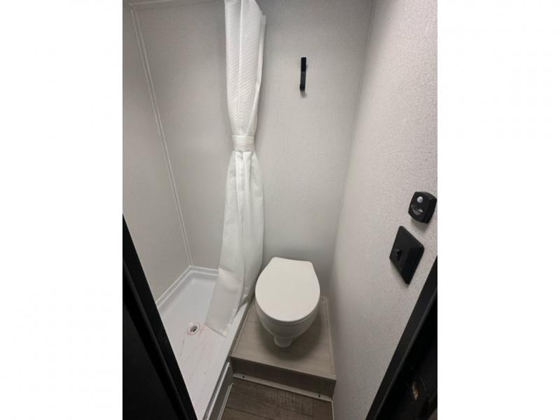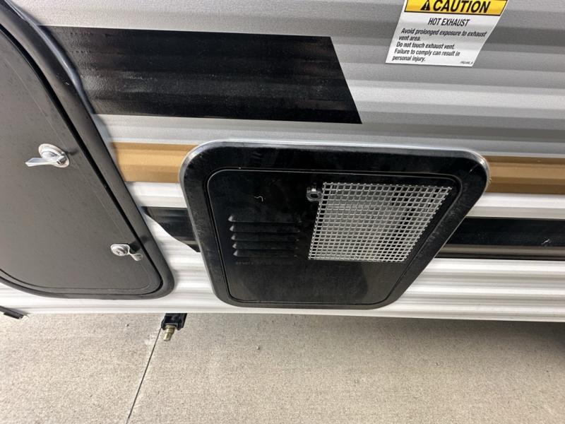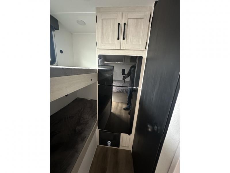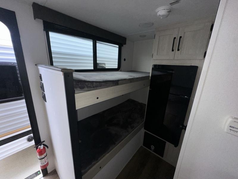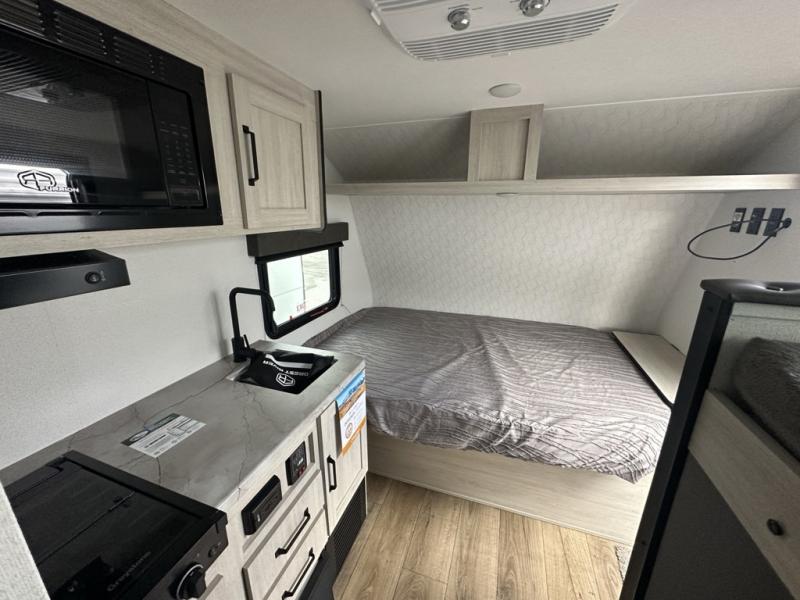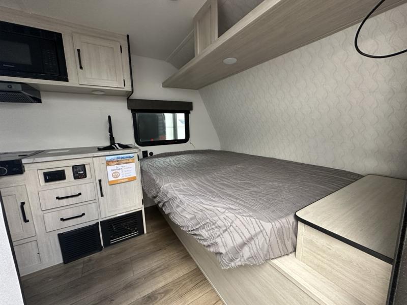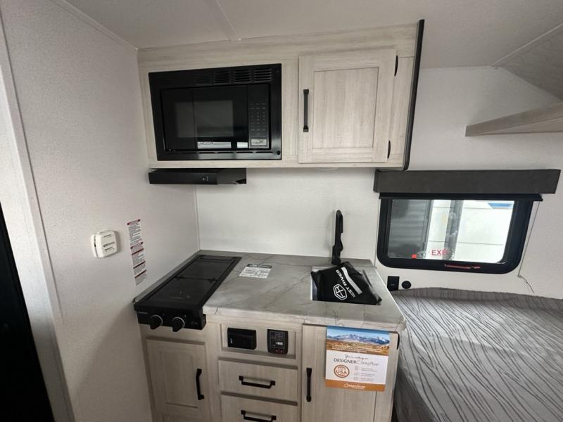 It will be so easy to enjoy camping trips in this single axle travel trailer! There is a front RV queen bed with flip-up storage at the foot of the bed for your belongings, and any additional guests can sleep on the 29" x 70" bunk beds. A full kitchen includes a stainless two burner cooktop and stainless microwave to cook meals each day, and the 4.3 cu. ft. 12V black glass refrigerator will keep your food fresh. And a private bath with a toilet and shower will let you freshen up without having to use the camp's facilities!