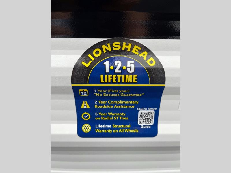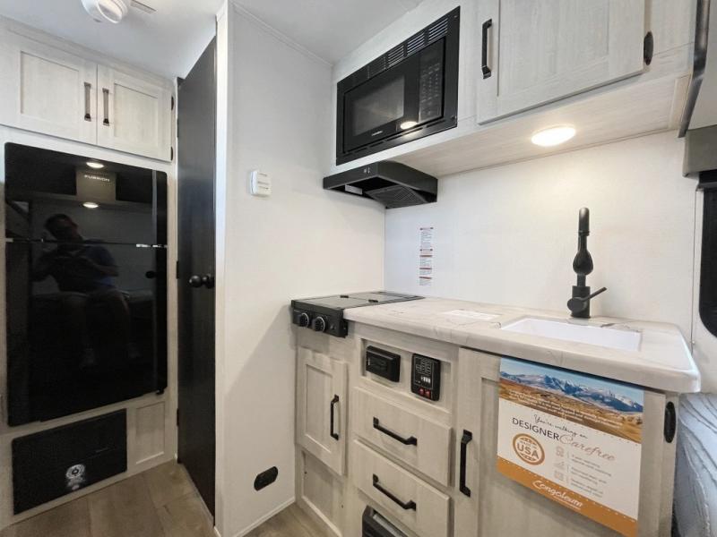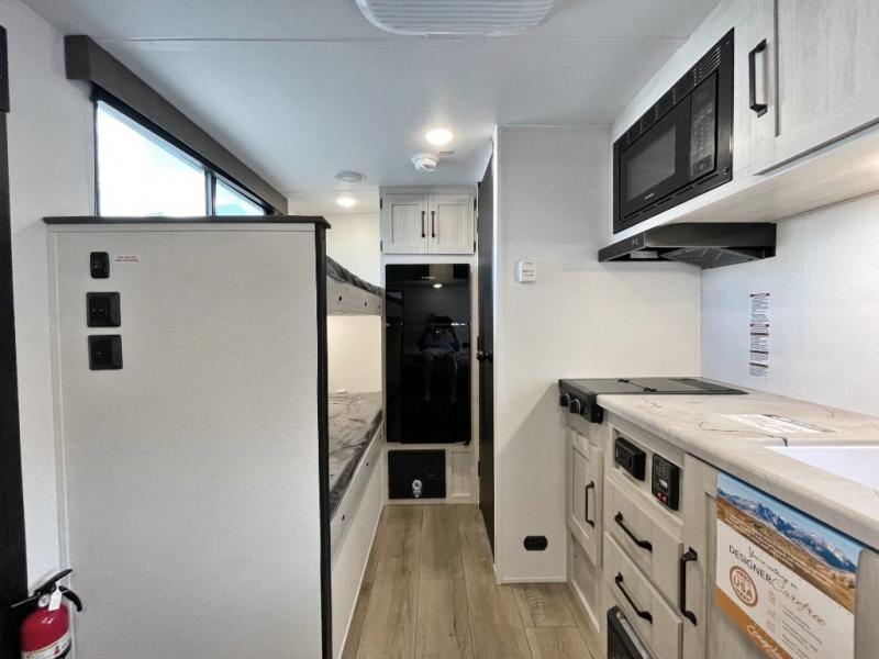 It will be so easy to enjoy camping trips in this single axle travel trailer! There is a front RV queen bed with flip-up storage at the foot of the bed for your belongings, and any additional guests can sleep on the 29" x 70" bunk beds. A full kitchen includes a stainless two burner cooktop and stainless microwave to cook meals each day, and the 4.3 cu. ft. 12V black glass refrigerator will keep your food fresh. And a private bath with a toilet and shower will let you freshen up without having to use the camp's facilities!