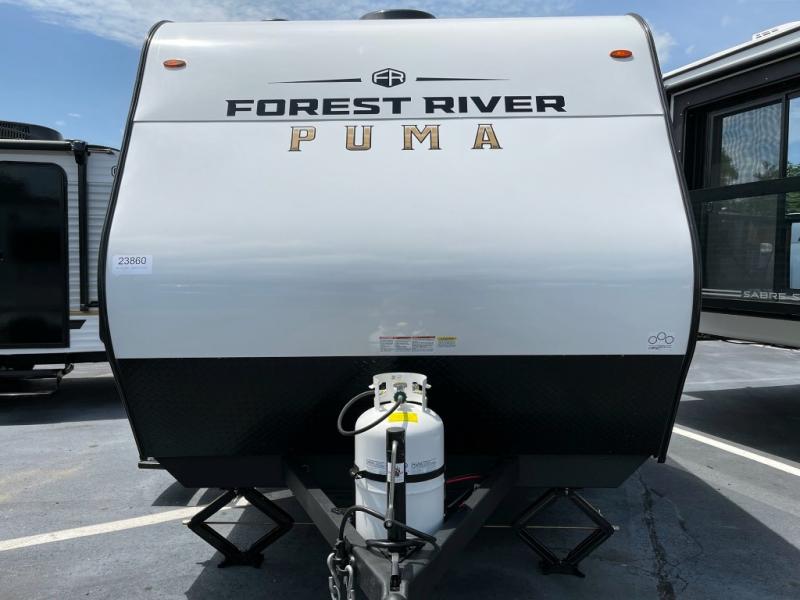 The Puma Camping Edition by Palomino offer an affordable travel trailer for rookie campers or seasoned RVers! They are built with 5/8" tongue and groove plywood flooring and a front diamond plate for added protection. There are also exterior clamp style door latches, back up camera prep, and 20 lb. LP bottles. Head inside to find Thermofoil countertops with a smooth drop edge, bedroom USB ports and outlets, and a GE appliance and kitchen package.