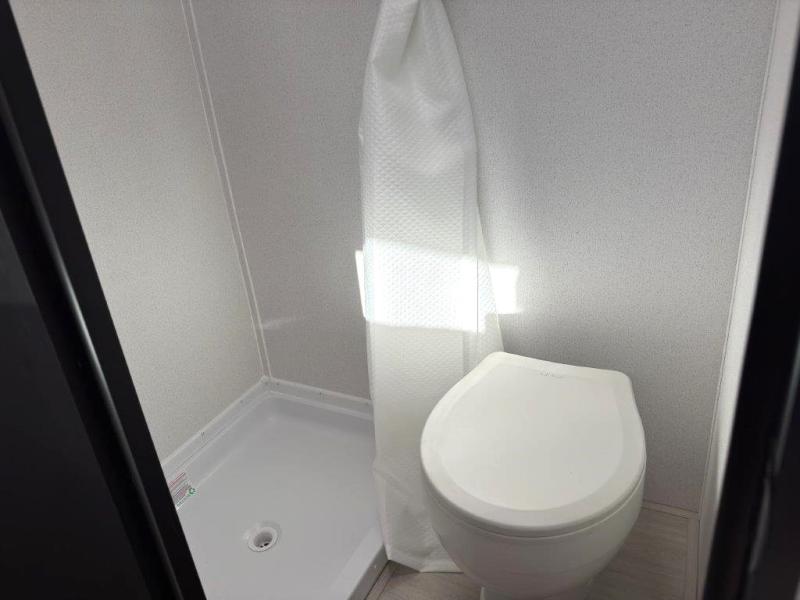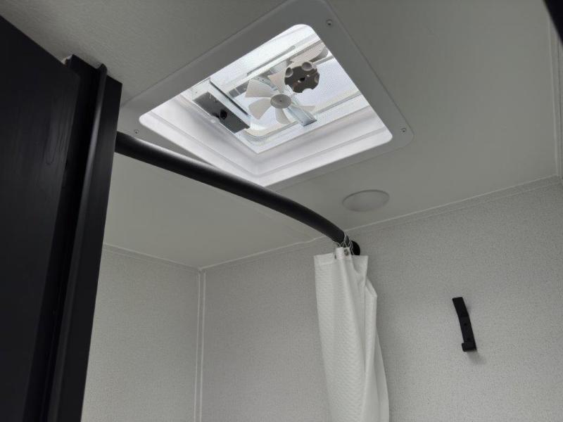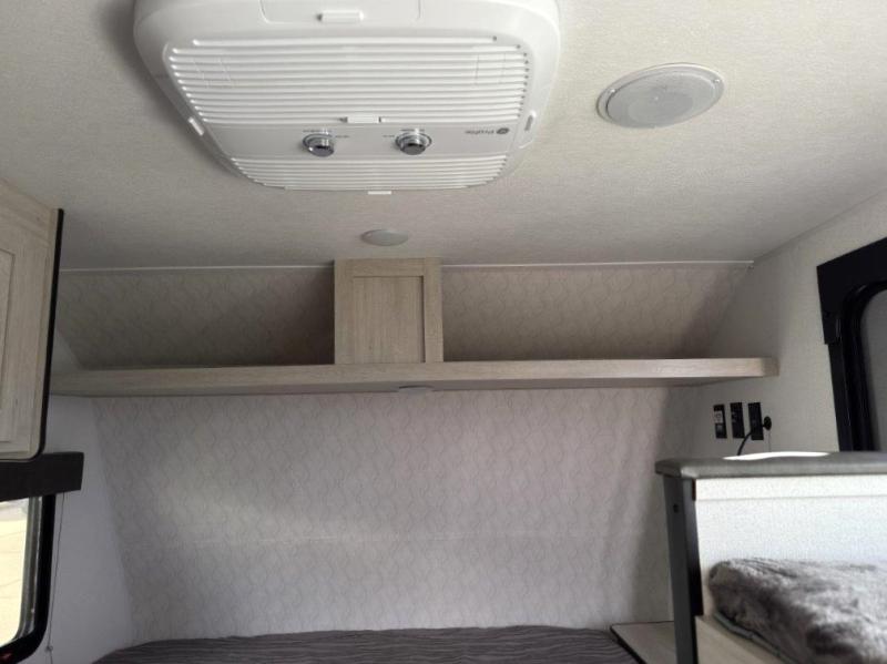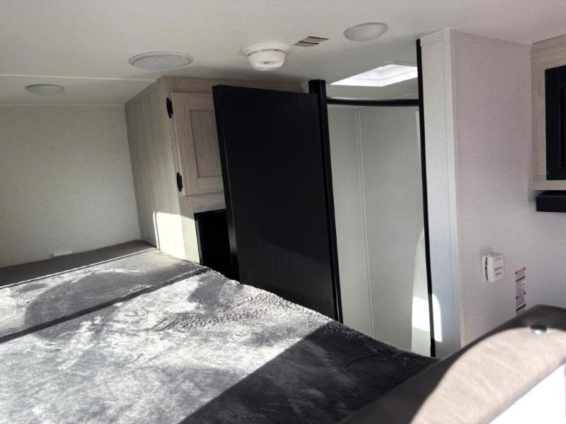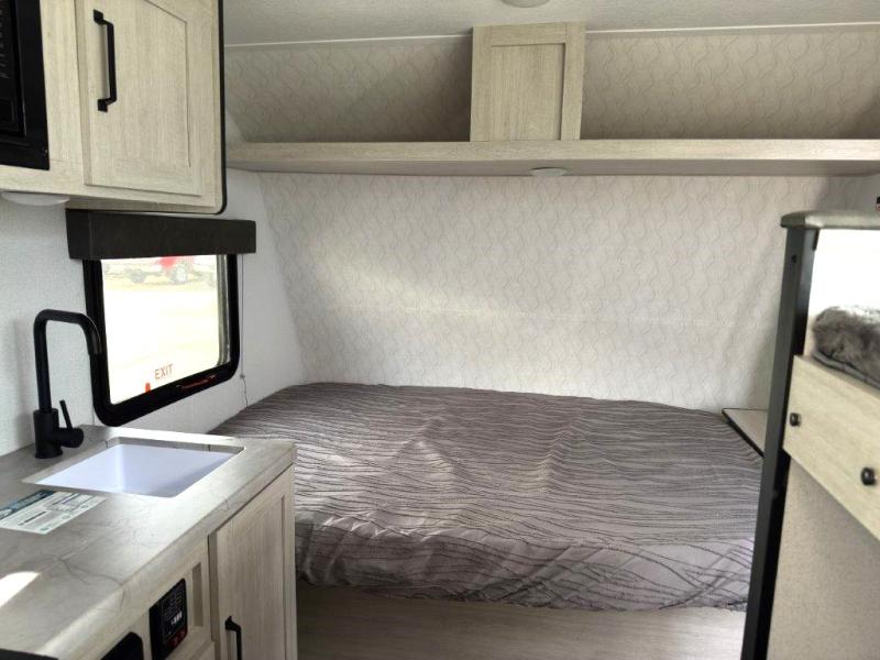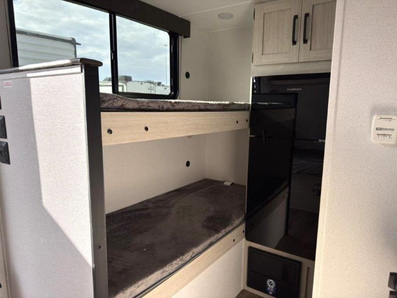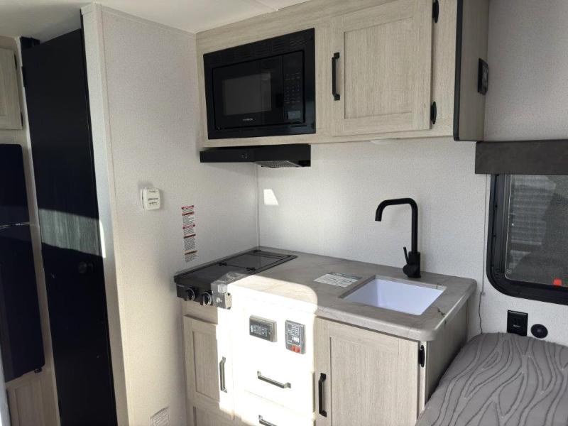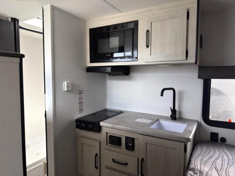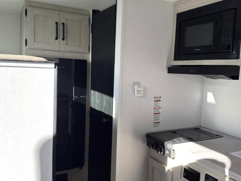 It will be so easy to enjoy camping trips in this single axle travel trailer! There is a front RV queen bed with flip-up storage at the foot of the bed for your belongings, and any additional guests can sleep on the 29" x 70" bunk beds. A full kitchen includes a stainless two burner cooktop and stainless microwave to cook meals each day, and the 4.3 cu. ft. 12V black glass refrigerator will keep your food fresh. And a private bath with a toilet and shower will let you freshen up without having to use the camp's facilities!