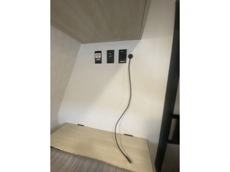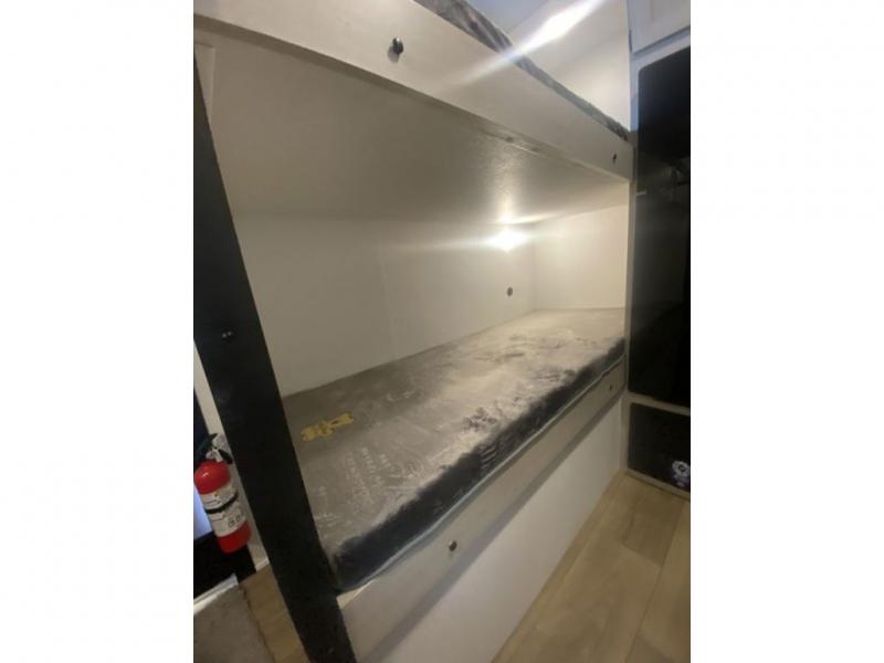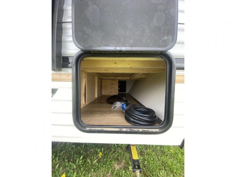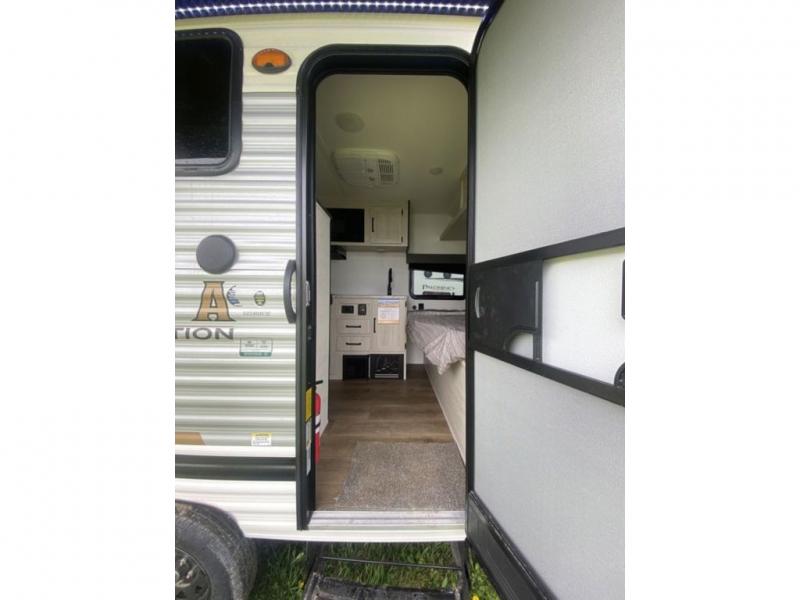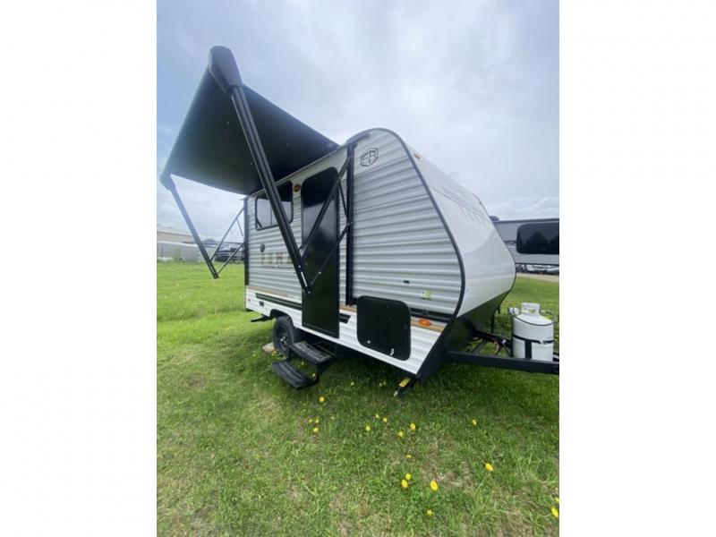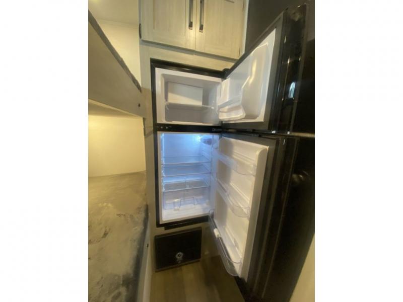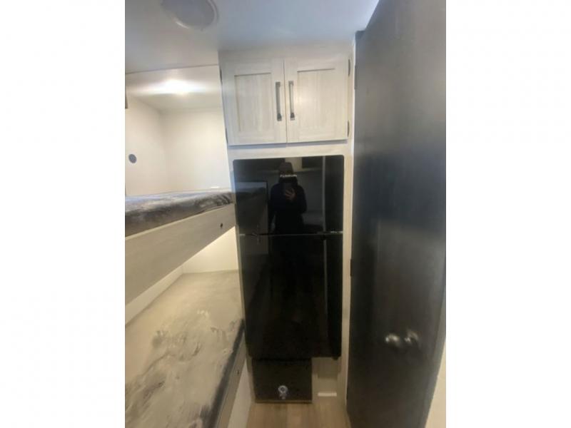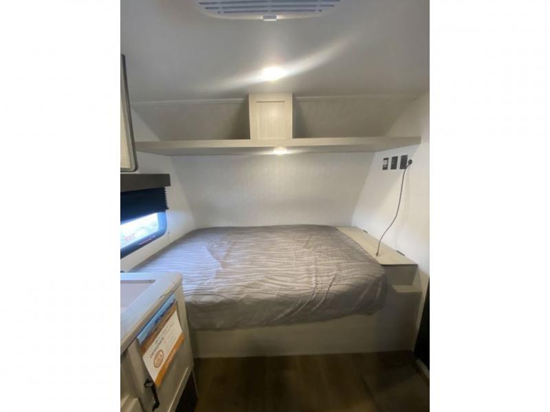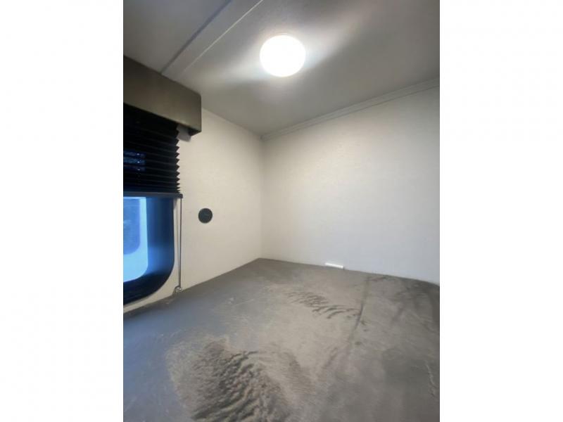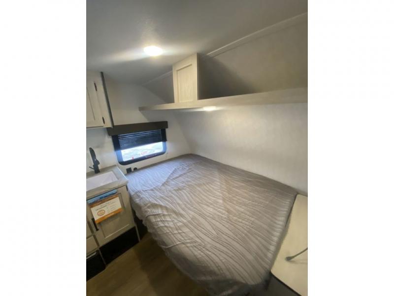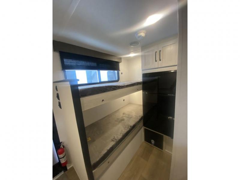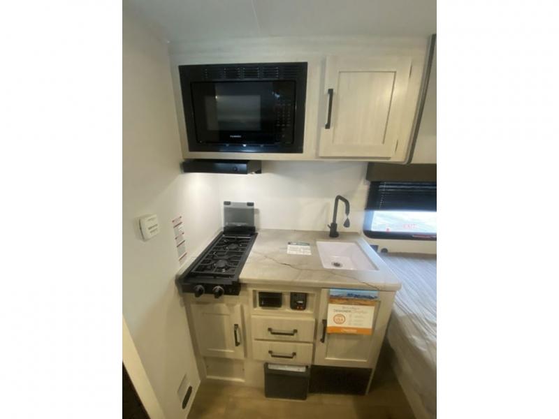 It will be so easy to enjoy camping trips in this single axle travel trailer! There is a front RV queen bed with flip-up storage at the foot of the bed for your belongings, and any additional guests can sleep on the 29" x 70" bunk beds. A full kitchen includes a stainless two burner cooktop and stainless microwave to cook meals each day, and the 4.3 cu. ft. 12V black glass refrigerator will keep your food fresh. And a private bath with a toilet and shower will let you freshen up without having to use the camp's facilities!