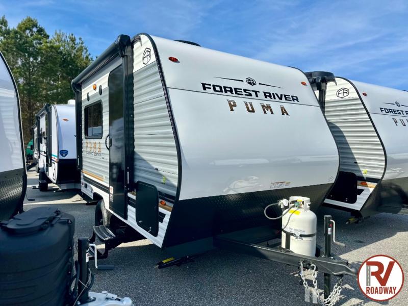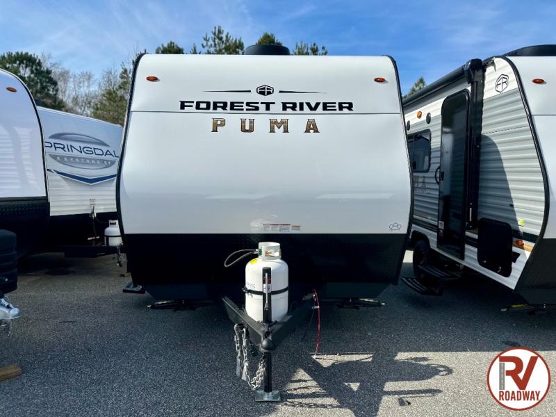 The Puma Camping Edition by Palomino offer an affordable travel trailer for rookie campers or seasoned RVers! They are built with 5/8" tongue and groove plywood flooring and a front diamond plate for added protection. There are also exterior clamp style door latches, back up camera prep, and 20 lb. LP bottles. Head inside to find Thermofoil countertops with a smooth drop edge, bedroom USB ports and outlets, and a GE appliance and kitchen package.