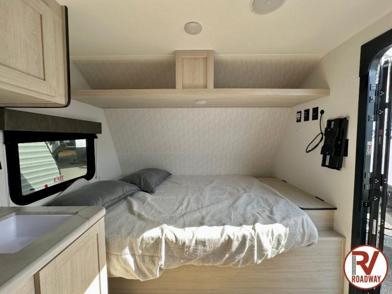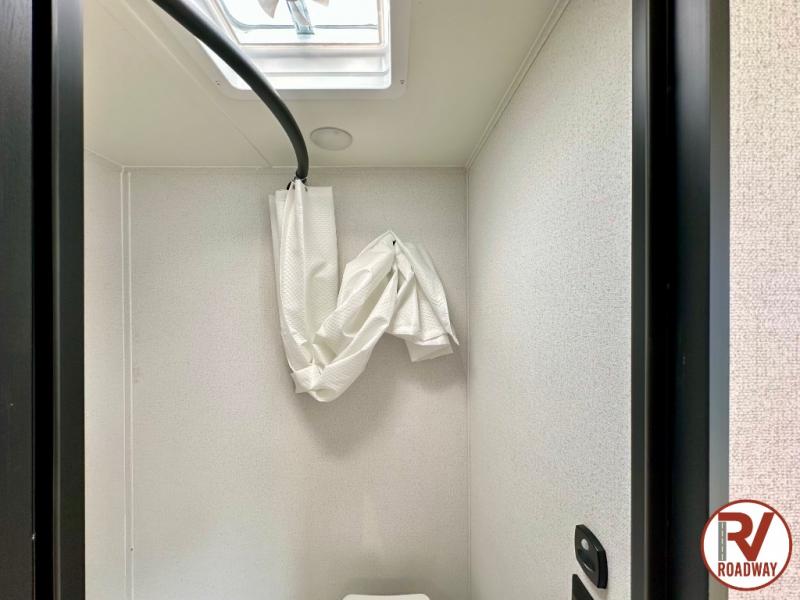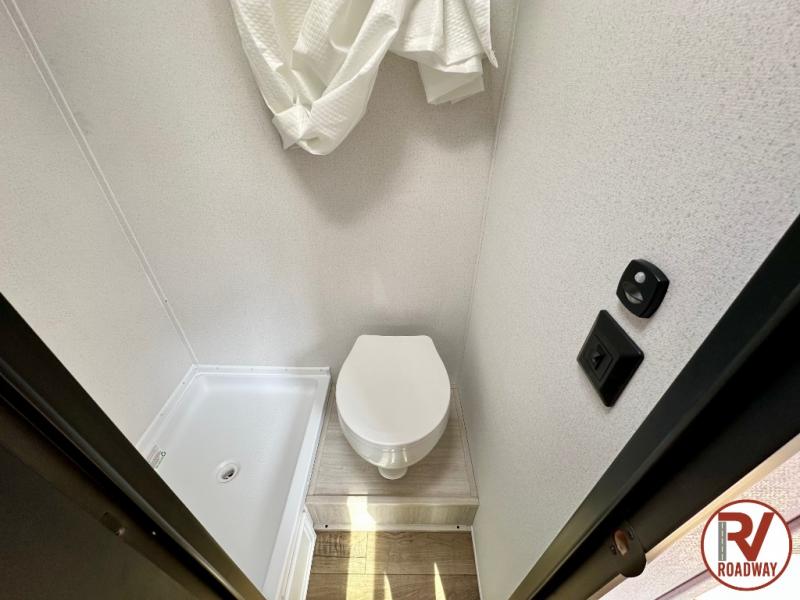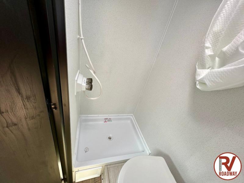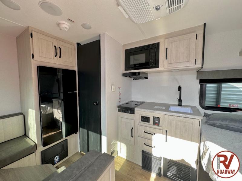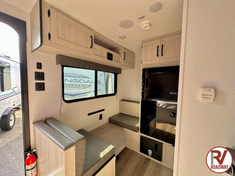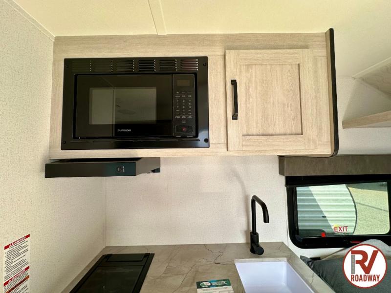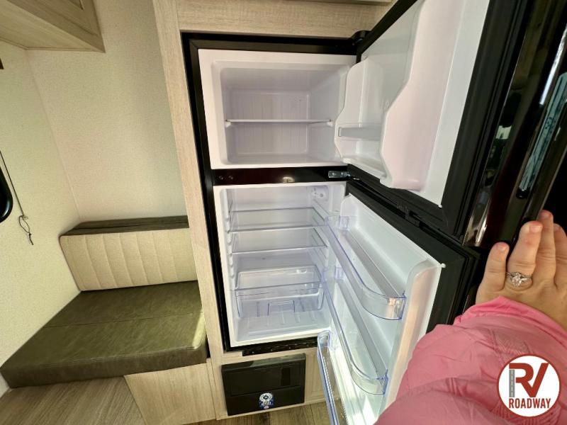 It will be so easy to enjoy camping trips in this single axle travel trailer! There is a front RV queen bed with flip-up storage at the foot of the bed for your belongings, and any additional guests can sleep on the booth dinette with an open shelf above. A full kitchen includes a stainless two burner cooktop and stainless microwave to cook meals each day, and the 4.3 cu. ft. 12V black glass refrigerator will keep your food fresh. And a private bath includes a shower with a seat for added comfort!