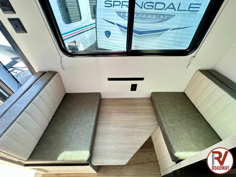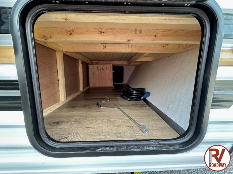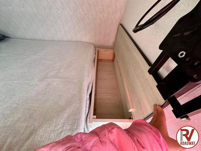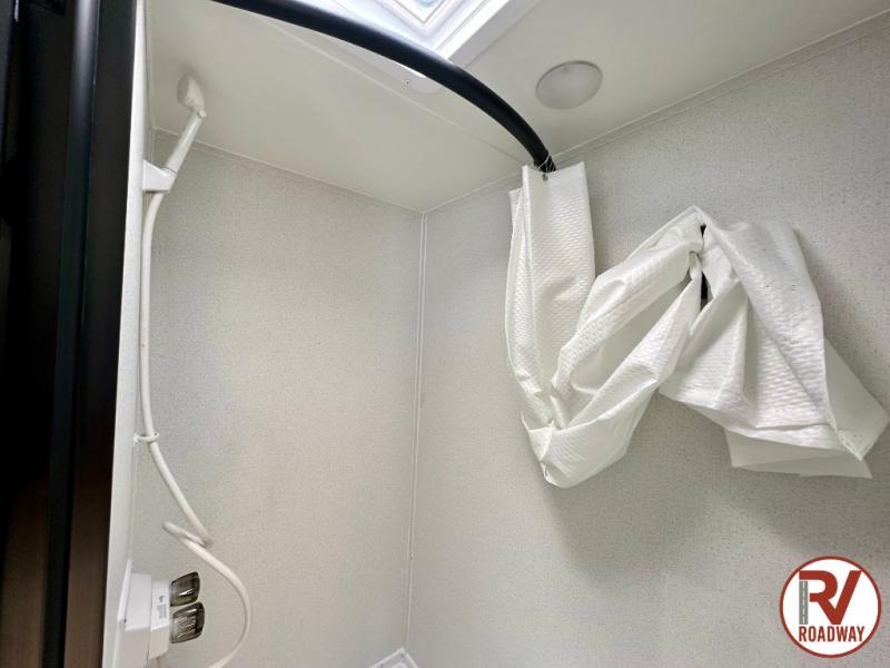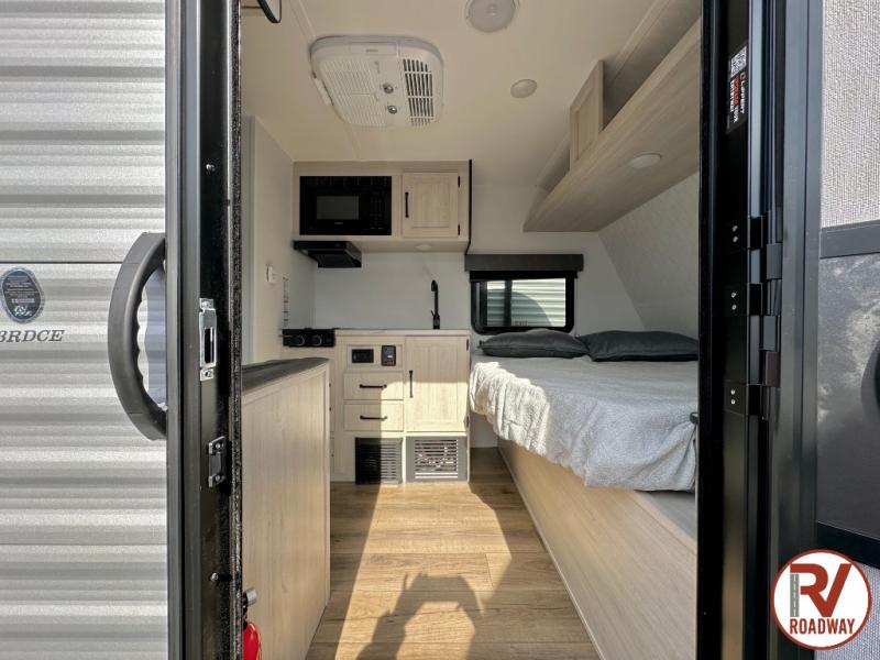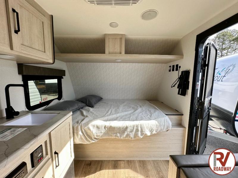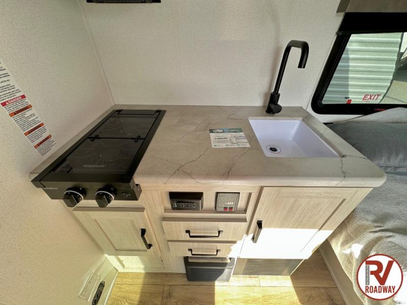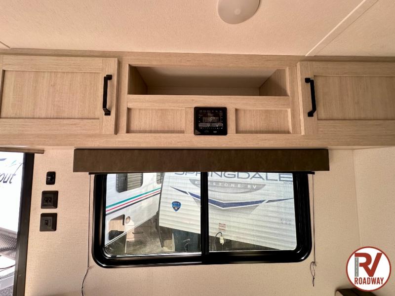 It will be so easy to enjoy camping trips in this single axle travel trailer! There is a front RV queen bed with flip-up storage at the foot of the bed for your belongings, and any additional guests can sleep on the booth dinette with an open shelf above. A full kitchen includes a stainless two burner cooktop and stainless microwave to cook meals each day, and the 4.3 cu. ft. 12V black glass refrigerator will keep your food fresh. And a private bath includes a shower with a seat for added comfort!